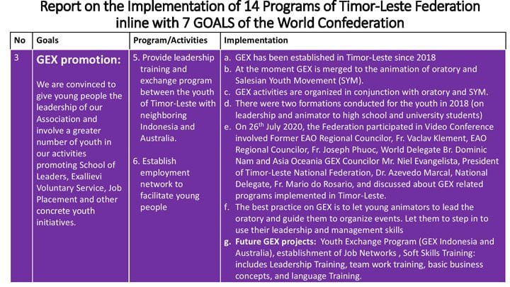 3- Phát triển GEX (CHVDB trẻ) song song với việc phát triển các nguyện xá và các Phong trào Giới trẻ Salêdiêng (SYM) tại Đông Timor.