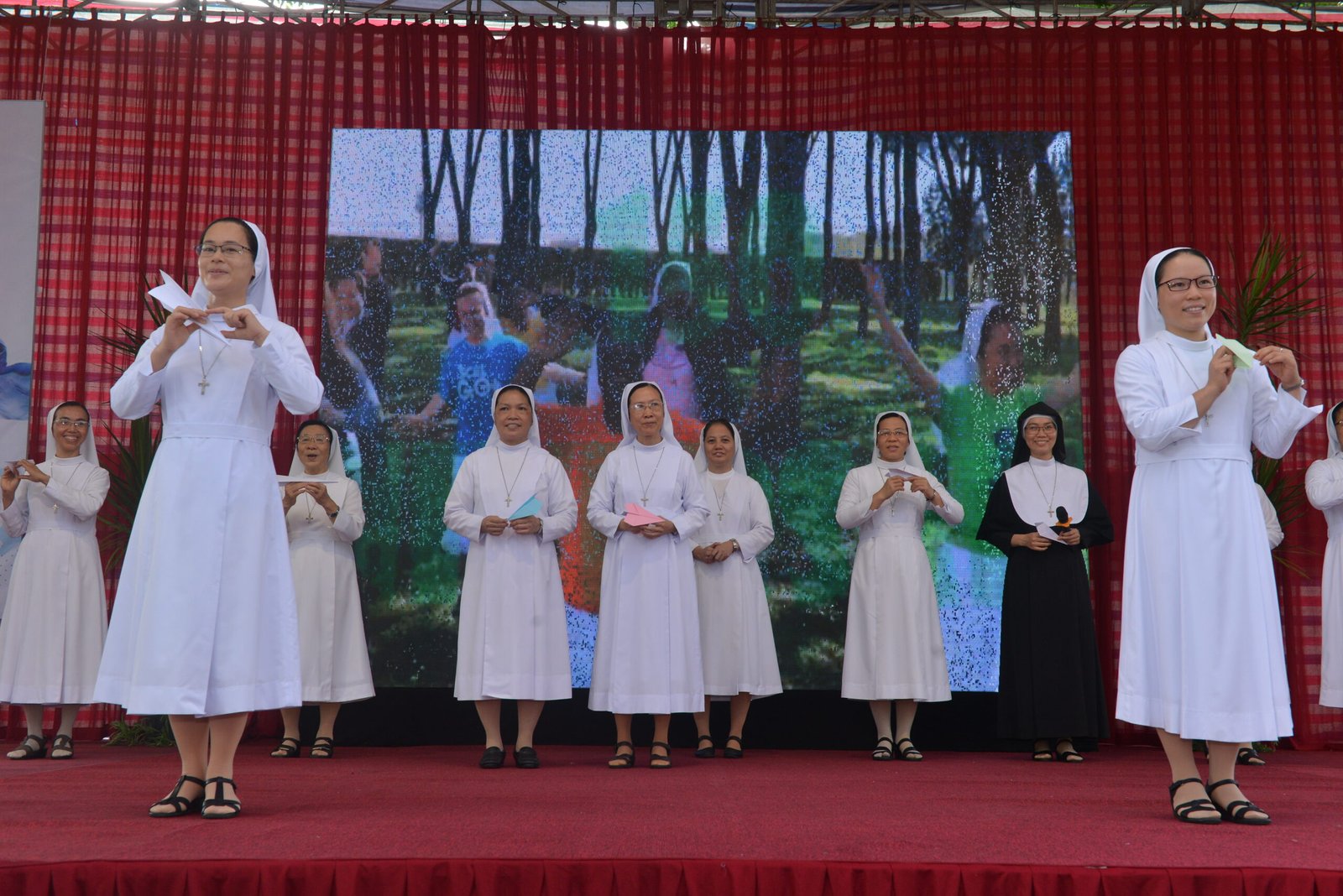 Niềm vui mừng 150 năm thành lập Hội dòng được các FMA Việt Nam diễn tả qua những bài hát, điệu nhảy sinh động. Trong niềm vui đó, bạn Lỡ Hữu Trọng – thành viên của e-kip Phong trào Trẻ của Tỉnh dòng – đại diện các bạn trẻ diễn tả tâm tình tạ ơn Thiên Chúa và chúc mừng Hội dòng trong dịp kỷ niệm trọng đại này, đồng thời diễn tả lòng biết ơn sâu sắc: ”Nhờ sự hiện diện dịu dàng, ấm áp, nhờ những con tim nhiệt thành, quảng đại, nhờ những bàn tay ân cần, chu đáo và nhờ những đôi chân nhanh nhẹn không biết mỏi mệt của quý Sơ, Tin Mừng Chúa đã được lan tỏa, gieo trồng, vun tưới và những cuộc đời (đặc biệt là những cuộc đời của các thiếu nữ yếu thế) đã được biến đổi trong phúc lành. Chính chúng con cũng là những người trẻ trưởng thành dưới sự chăm sóc và bảo ban trong môi trường giáo dục tuyệt hảo của Dòng Con Đức Mẹ Phù Hộ.”