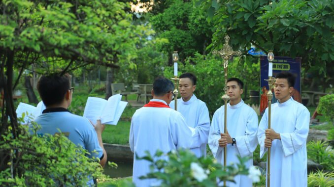 Buổi nguyện ngắm diễn ra tại khuôn viên cộng thể với sự hiện diện đầy yêu thương của cha Giám đốc, quý Cha, quý Thầy cùng toàn thể anh em hai lớp Dự bị và Tiền tập. Giữa không gian yên tĩnh và trang nghiêm, mỗi chặng dừng chân là một lời mời gọi anh em cùng dừng lại, nhìn sâu vào mầu nhiệm tự hiến của Đấng Cứu Thế.