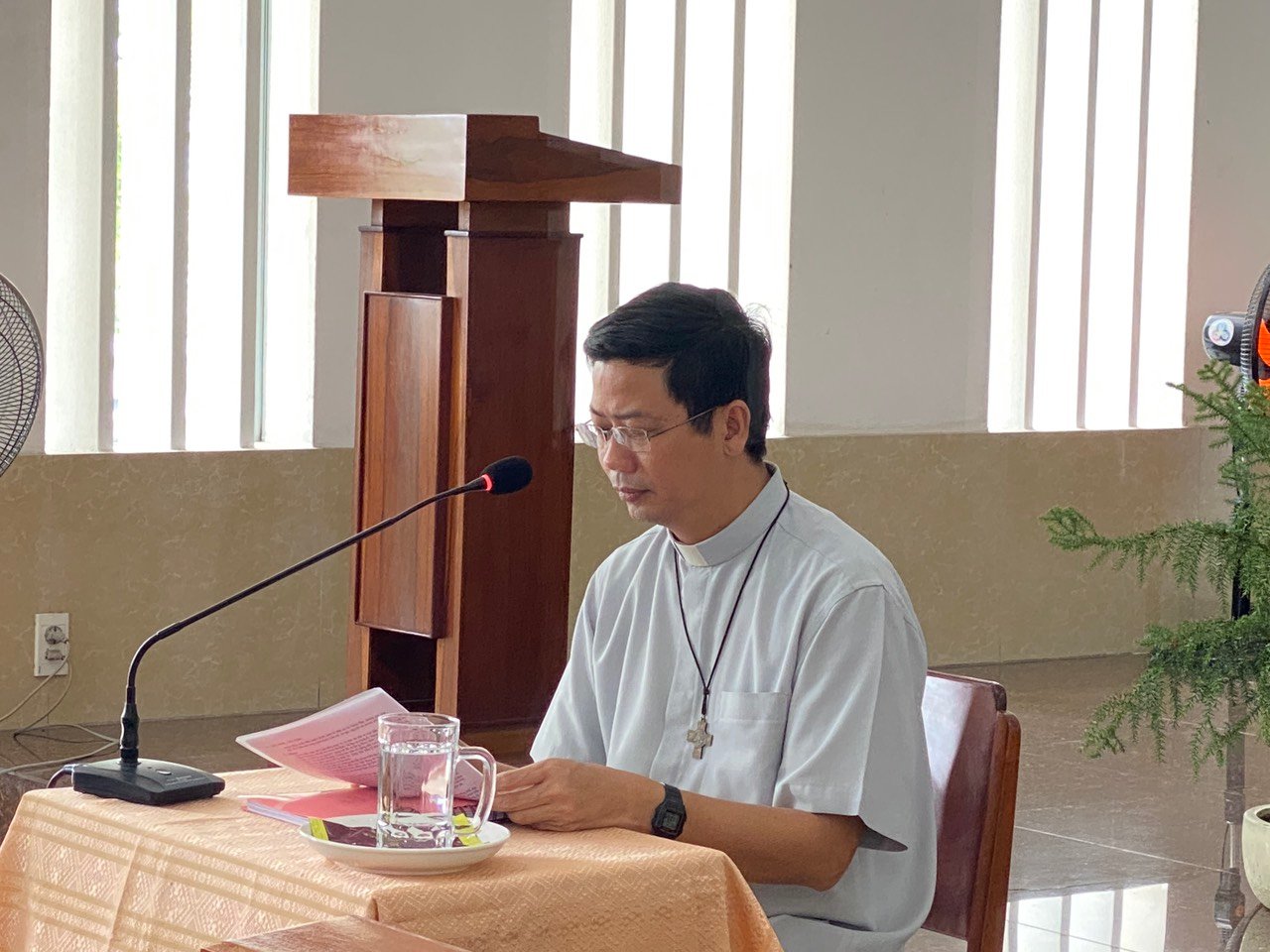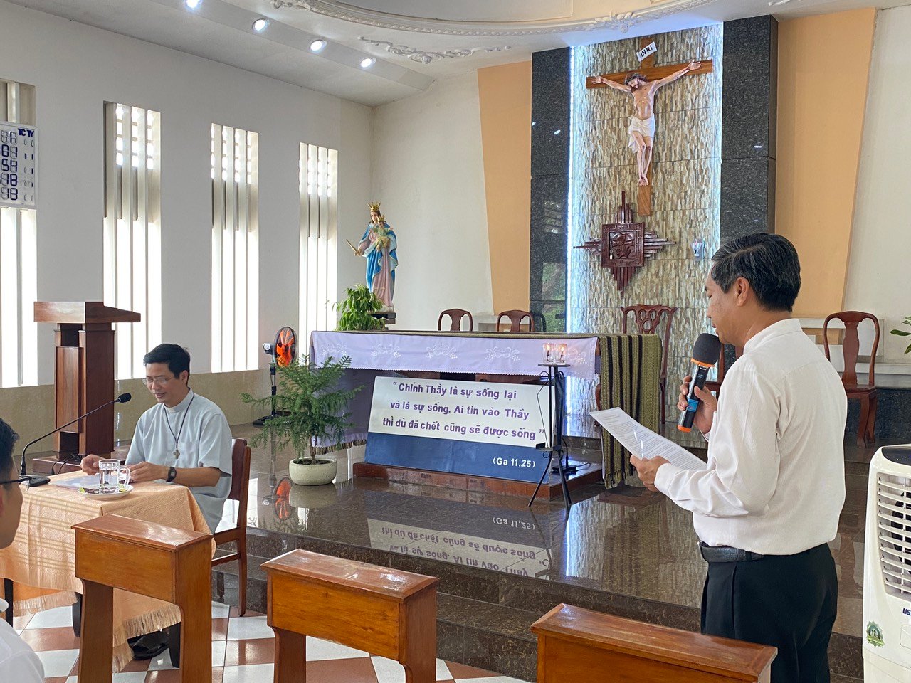 Khởi đầu cho ngày kinh lý, Cha Giám Đốc Giuse Đoàn Hải Đăng thay mặt Cộng thể báo cáo các hoạt động, công cuộc và thực trạng của nhà đào luyện trong một năm vừa qua. Sau đó, Cha Giám Tỉnh thánh hóa khai mạc, đồng thời ngài cũng không quên gửi lời chúc mừng đến Cộng thể nhân kỷ niệm 25 năm ngày thiết lập Cộng thể Đaminh Saviô Cầu Bông theo Giáo Luật 1/4/1998.