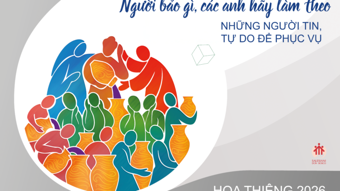 Tấm poster HOA THIÊNG 2026, với chủ đề “NGƯỜI BẢO GÌ, CÁC ANH HÃY LÀM THEO, Những tín hữu, tự do để phục vụ”, thuật lại một cách trực quan đoạn TIN MỪNG về Tiệc cưới Cana. Theo cấu trúc bốn phần được Cha Bề Trên Cả đề xuất, hình minh họa làm nổi bật: Mẹ Maria (bên trái) nhìn và nhận thấy nhu cầu; Mẹ hướng nhận thức đó về Don Bosco (trung tâm), đại diện cho sự phân định đầy đức tin và hành động trắc ẩn của sứ mệnh Salêdiêng, và các ngài cùng nhau nhìn lên Chúa Giêsu (có vầng hào quang), Đấng chỉ đường; tiền cảnh cho thấy các tôi tớ — lắng nghe, chọn lựa, và cuối cùng là chia sẻ rượu đã được biến đổi từ các chum — để cộng đoàn nhận được sự dư dật của Thiên Chúa.