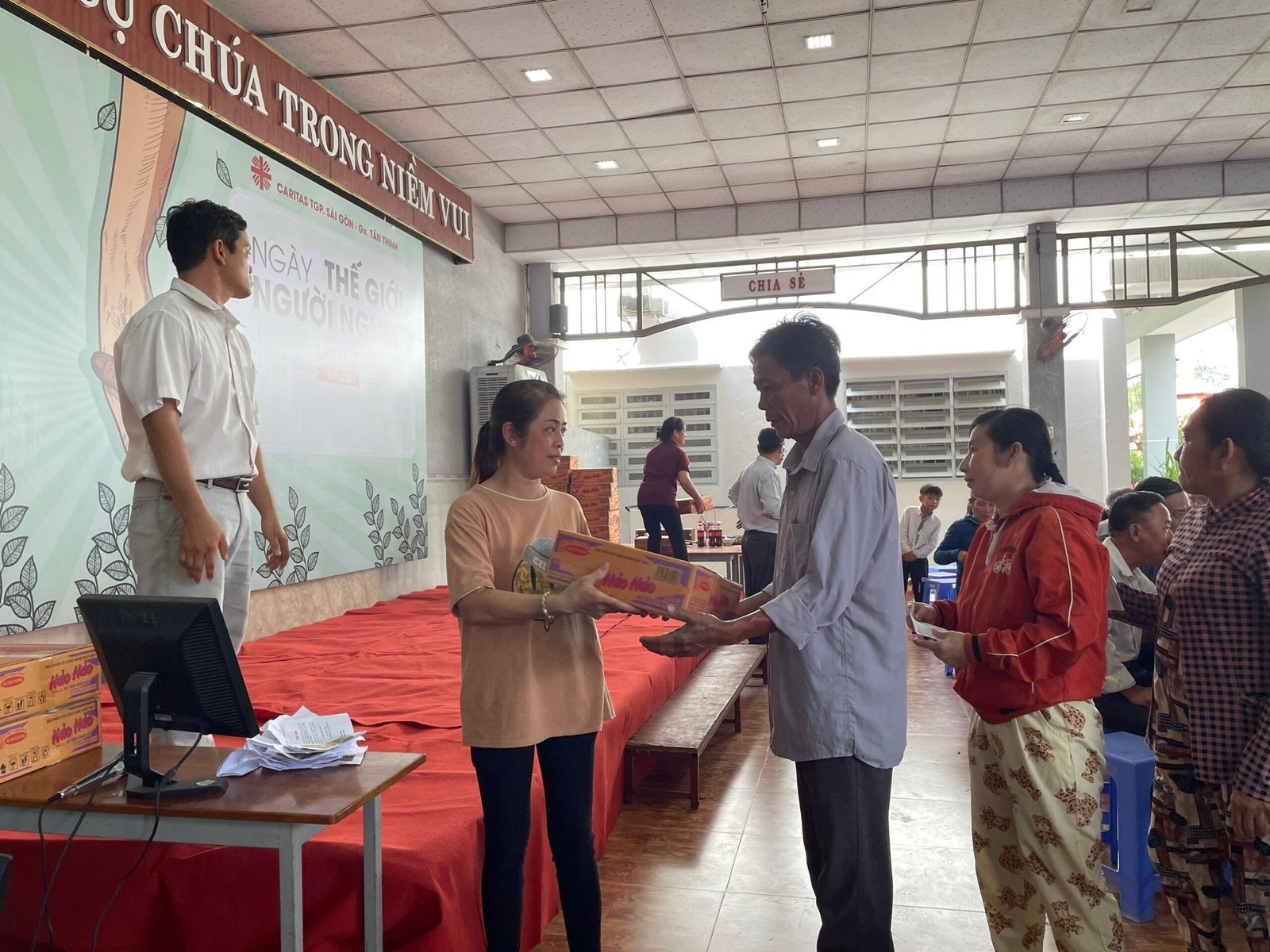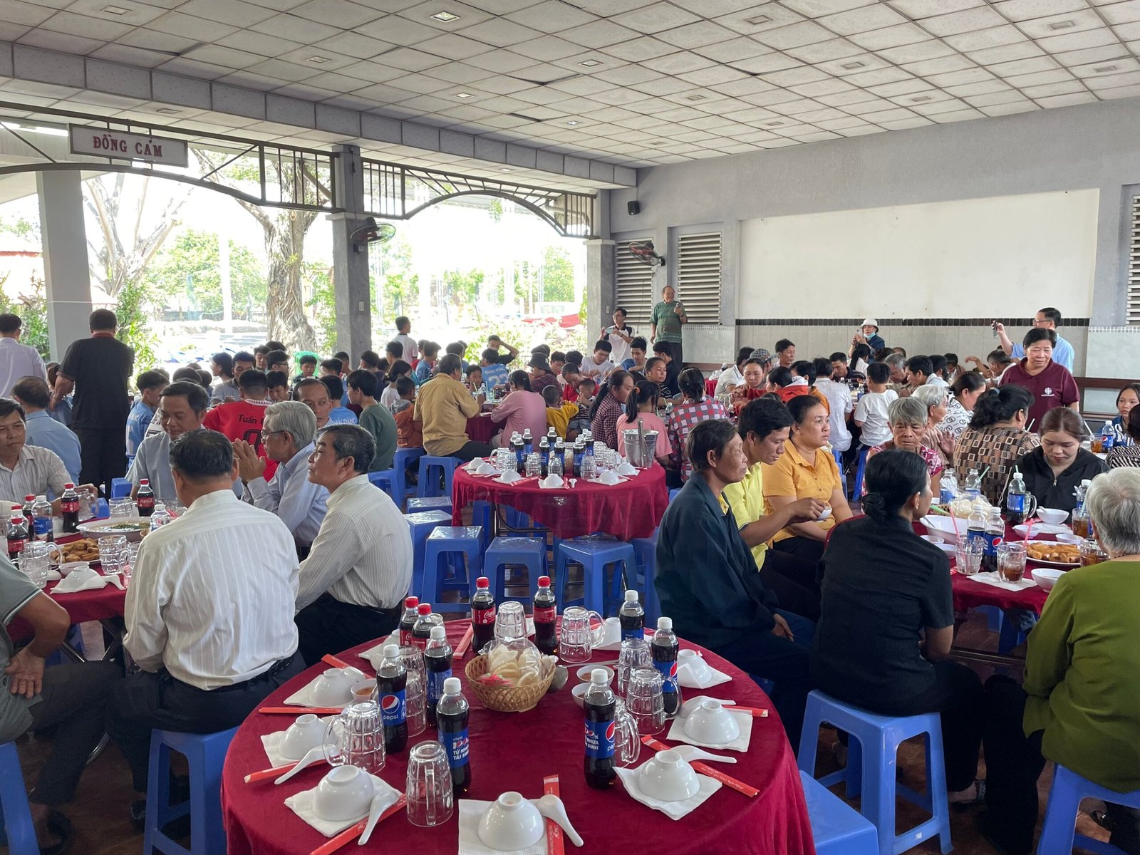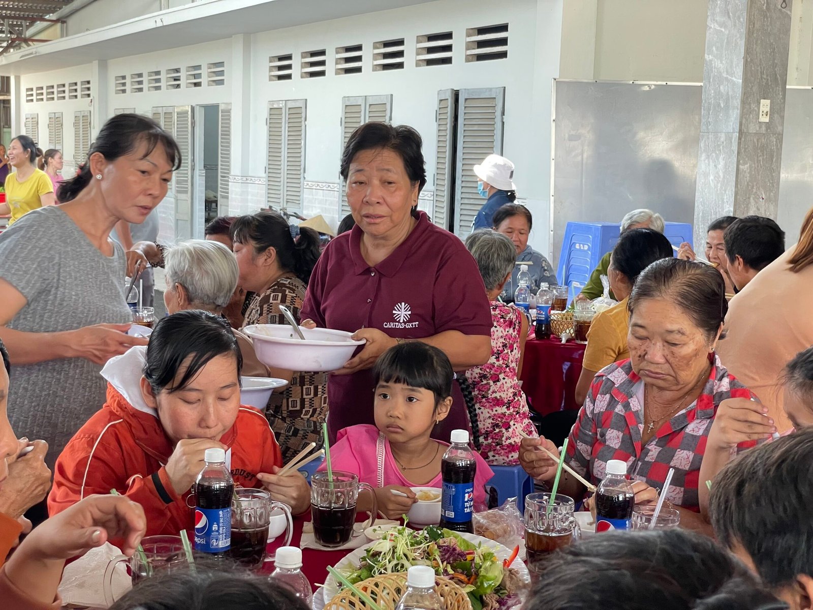 Đúng 11h30 trưa Chúa Nhật 33 Thường Niên, bữa cơm chính thức được quý cha, thầy, quý HĐMV cùng các anh chị em trong ban Caritas phục vụ. Bữa ăn được chính thức mang ý nghĩa với sự góp của các gia đình khó khăn, những cụ giàn neo đơn, các em học sinh lớp phổ cập….