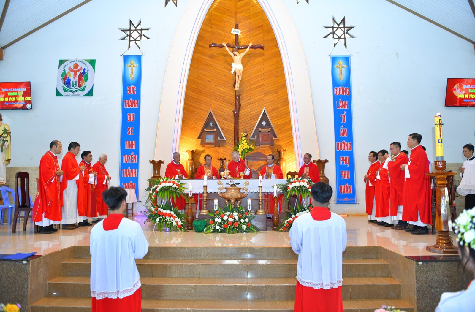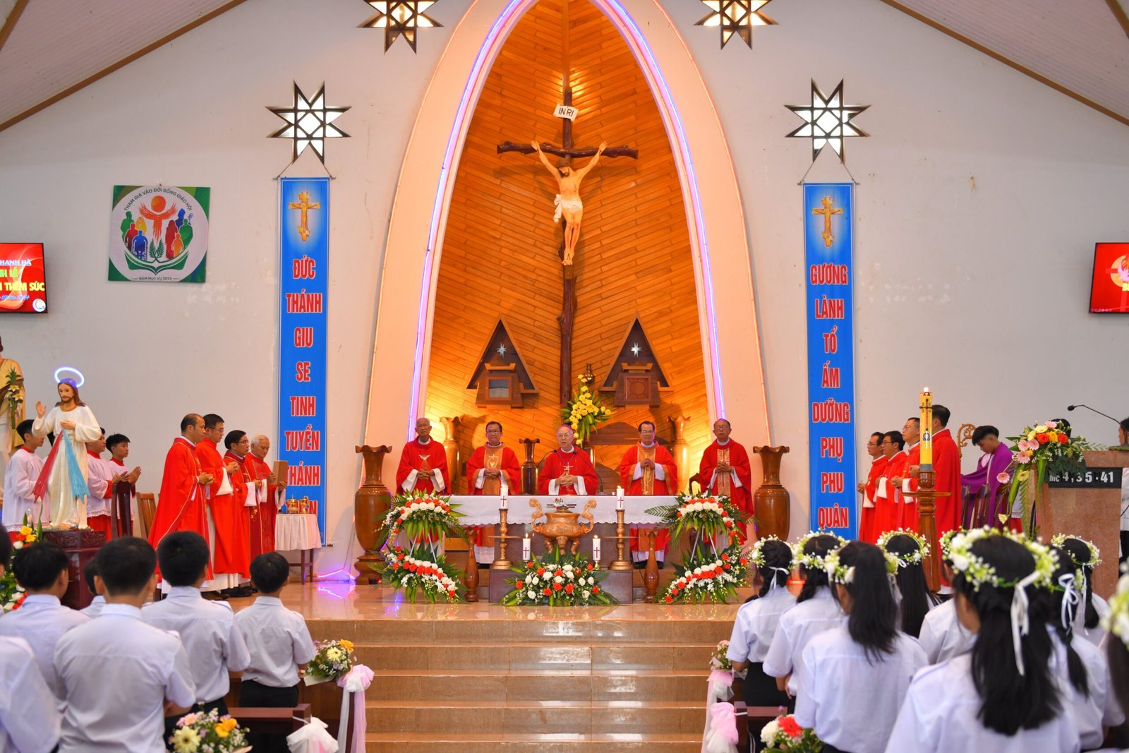 Đồng tế trong Thánh lễ, có Cha Đaminh Nguyễn Xuân Hùng – Quản hạt Chư Prông, Cha Giuse Nguyễn Đình Phúc, SDB – Giám đốc Cộng thể Làng Khóp, Cha Giuse Đinh Công Tuý – Giám đốc Cộng thể Chư Prông, Chánh xứ Thanh Hà và quý cha trong cộng thể và giáo hạt. Tham dự Thánh lễ có quý tu sĩ nam nữ, quý phụ huynh của các em được lãnh bí tích và cộng đoàn giáo xứ Thanh Hà.
