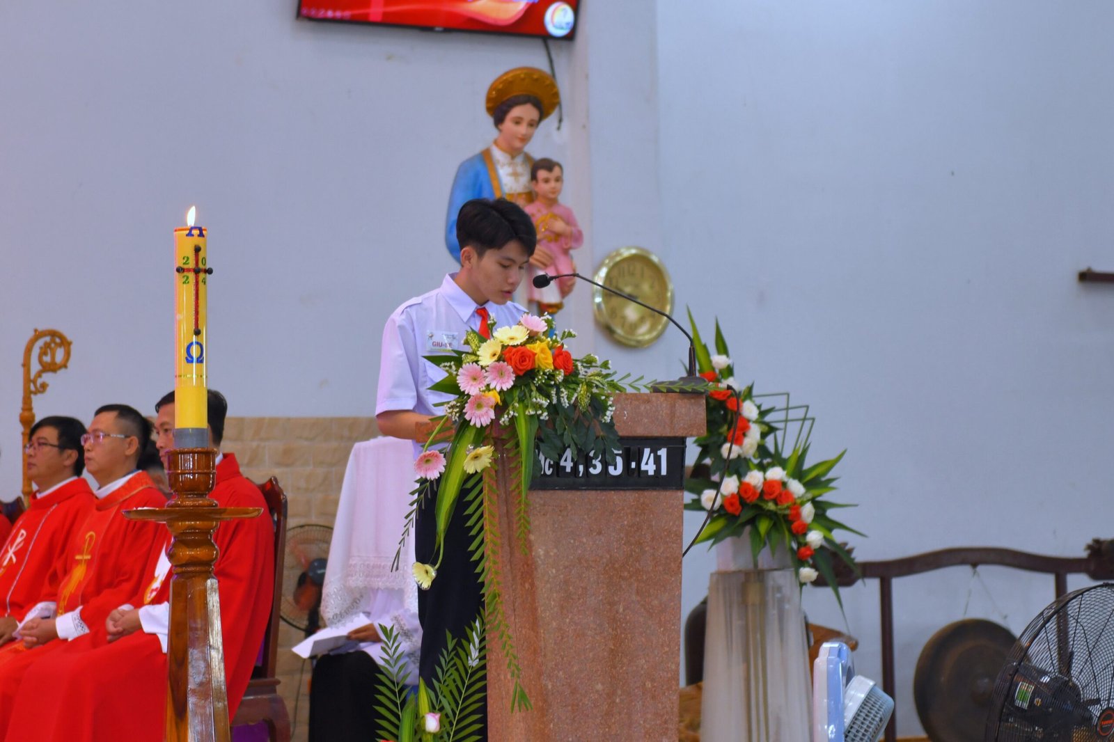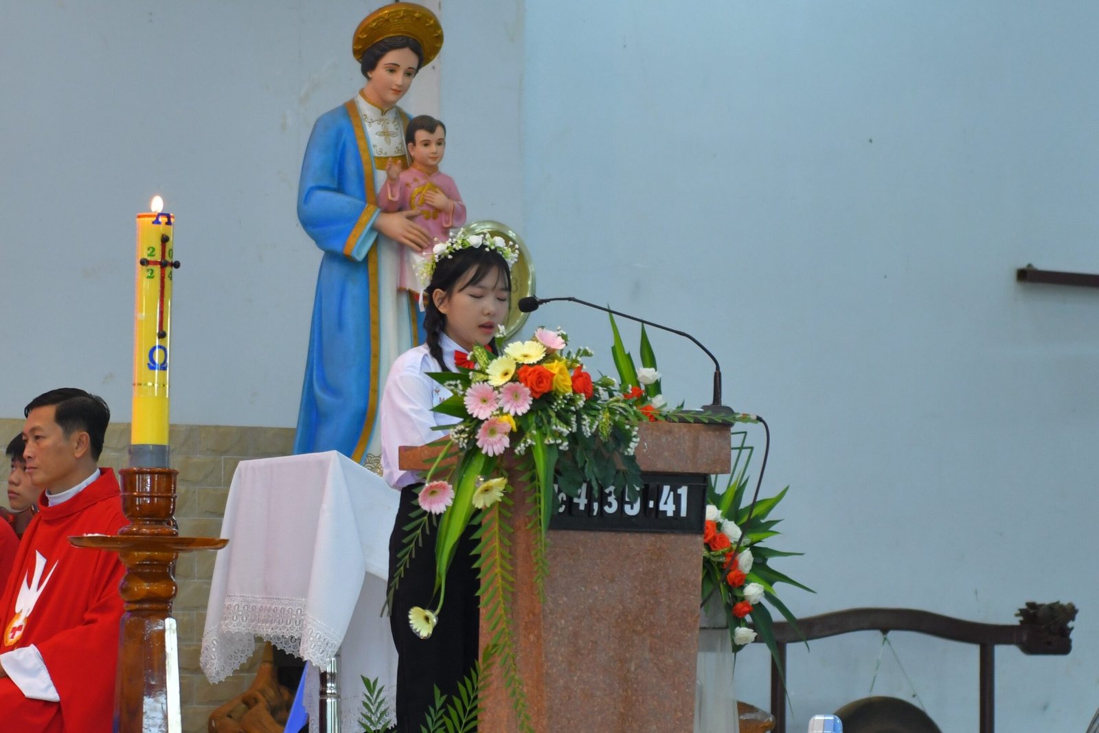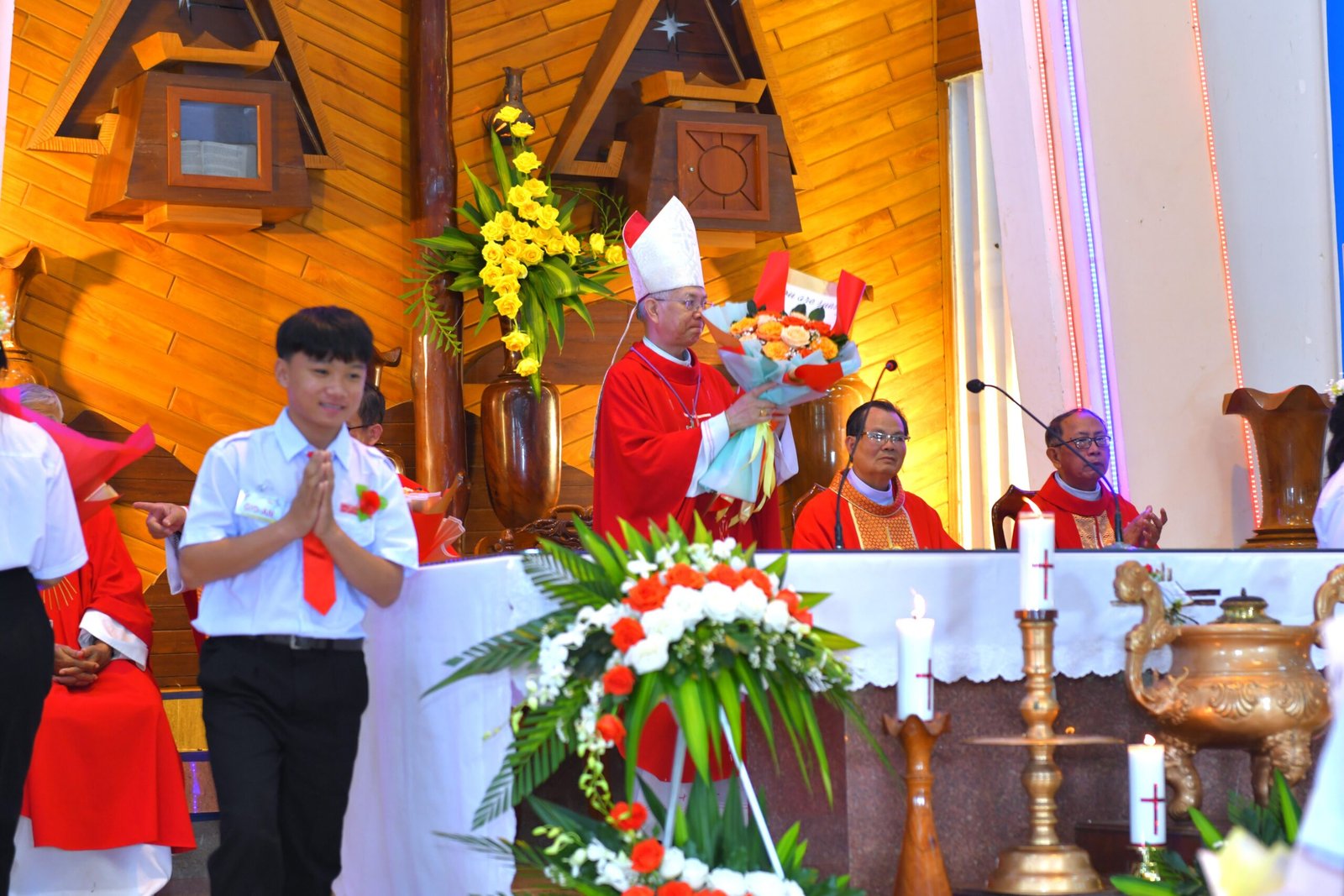 Trong bài giảng của mình, Đức cha Alôisiô đã mời gọi các em thiếu nhi sau khi lãnh nhận Bí tích Thêm Sức, hãy can đảm làm chứng cho Chúa nơi môi trường sống của mình. Đức cha cũng nói rằng Chúa Thánh Thần đang hiện diện giữa cộng đoàn giáo xứ, do đó mỗi người cần phải lắng nghe tiếng Chúa Thánh Thần và xin Chúa ban những ơn cần thiết để có thể sống tốt đời sống đức tin của mình. Sau bài giảng, Đức Cha đã ban Bí tích Thêm Sức cho 53 em thiếu nhi.