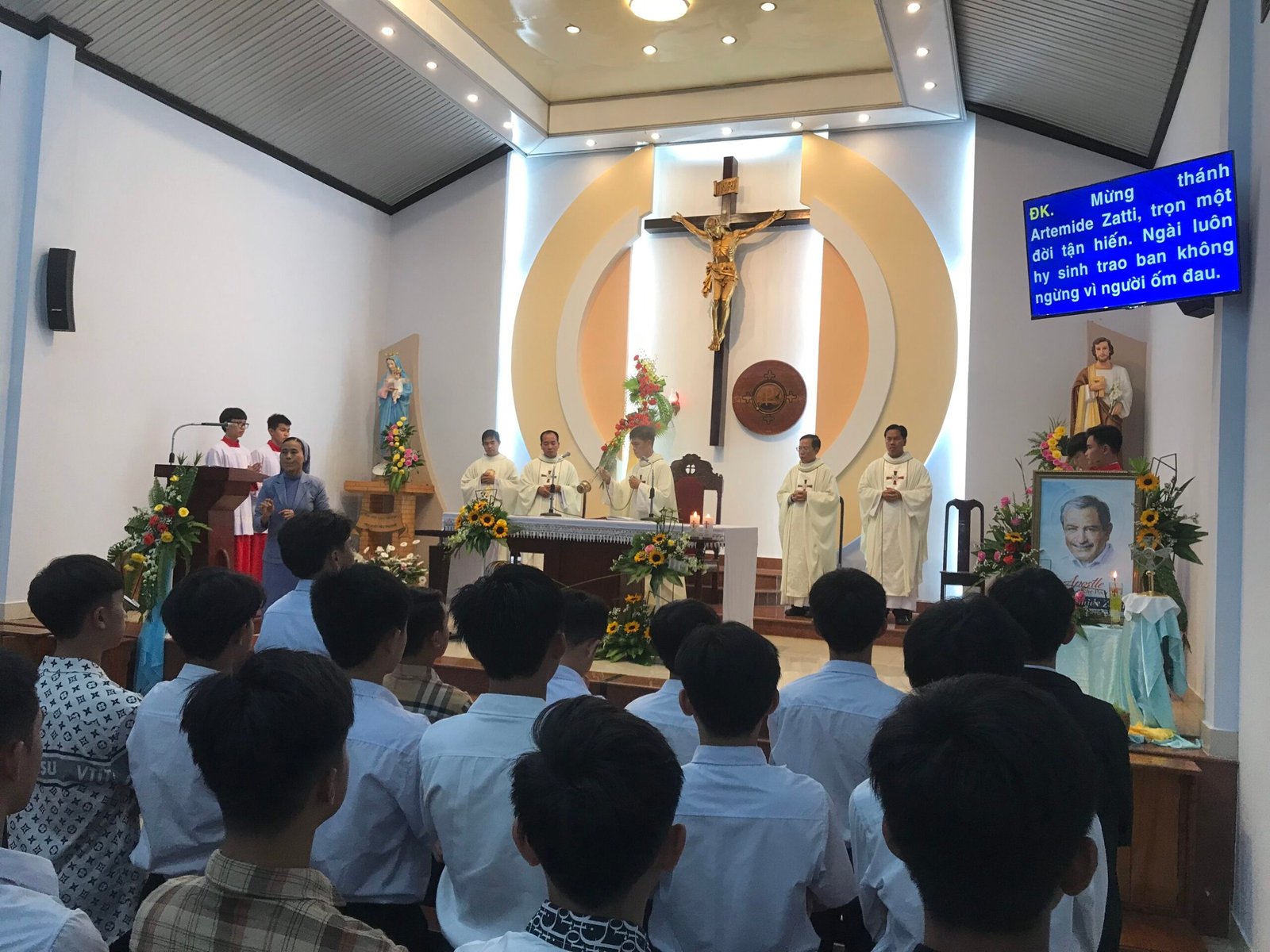 Trong Thánh lễ, Cha Giám đốc Martinô Đinh Nghĩa Sỹ mời gọi Cộng thể hiệp ý cầu nguyện với thánh Zatti để cầu nguyện cho ơn gọi Sư huynh trong Tỉnh dòng và cầu nguyện cho linh hồn các Thầy Sư Huynh đã qua đời. Trong bài giảng, ngài chia sẻ về con đường nên thánh của Zatti, một con đường nên thánh trong ơn gọi là một người giáo dân, một người phục vụ Chúa Kitô cách triệt để nơi những người bệnh nhân nghèo. Ngài phục vụ các bệnh nhân và người nghèo như thể phục vụ chính Chúa vậy. Thánh Zatti đã nên thánh trong ơn gọi khiêm nhường hy sinh phục vụ như một người tôi tớ khiêm hạ như thế; chúng ta cũng được mời gọi nên thánh trong ơn gọi riêng của mình.