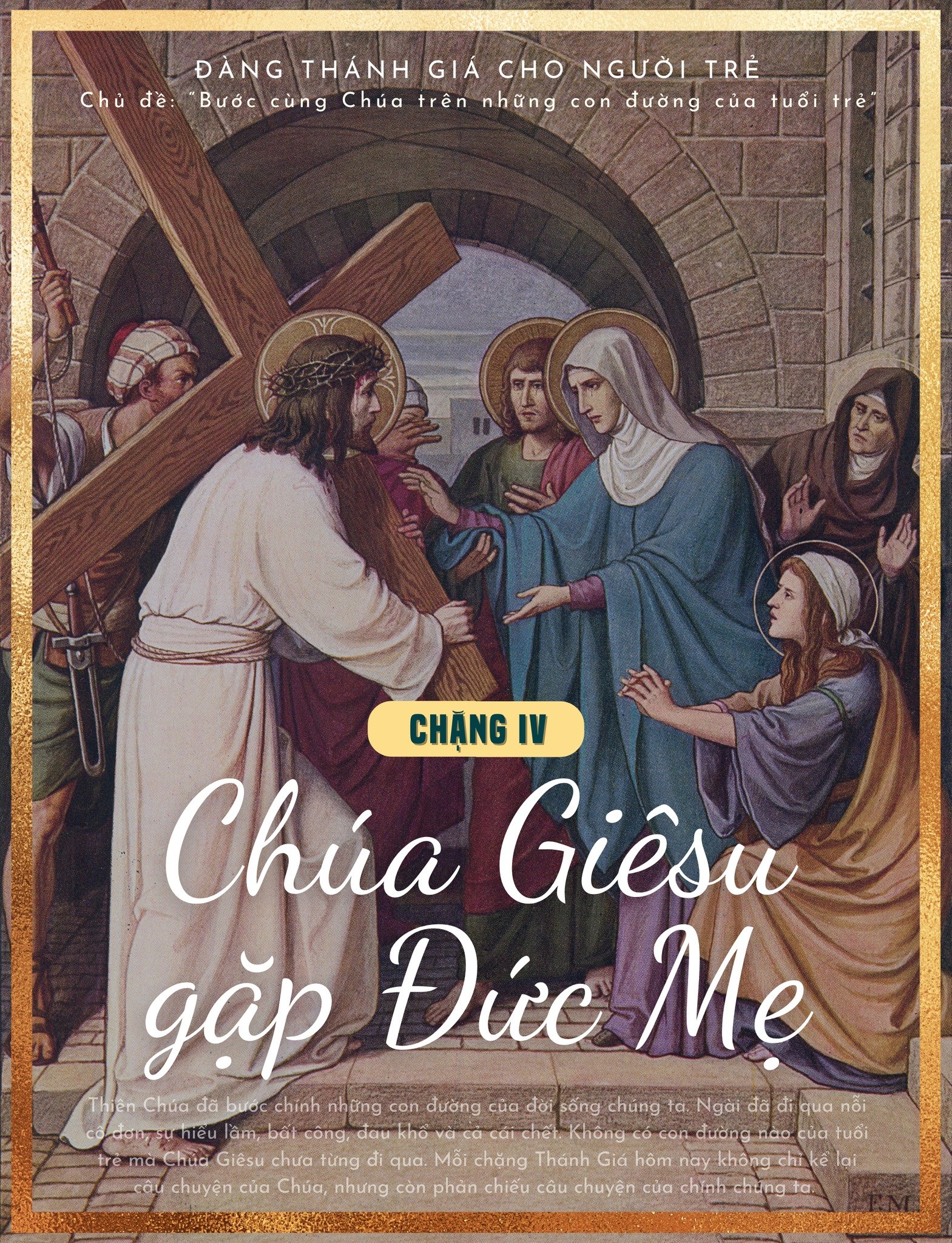 Suy niệm cho người trẻ: Giữa con đường đầy đau khổ, Chúa Giêsu gặp Mẹ Maria. Không cần lời nói, ánh mắt của hai Mẹ Con đã nói lên tất cả: tình yêu, nỗi đau, và niềm hy vọng. Trong cuộc đời, người trẻ cũng cần những người đồng hành: cha mẹ, thầy cô, bạn bè, những người lắng nghe và nâng đỡ chúng ta. Nhưng đôi khi chúng ta quên mất điều đó. Chúng ta quá bận rộn với thế giới riêng của mình, với điện thoại, mạng xã hội và những dự định cá nhân. Cuộc gặp gỡ giữa Chúa Giêsu và Mẹ Maria nhắc chúng ta rằng: tình yêu gia đình là nguồn sức mạnh lớn lao trong cuộc đời.