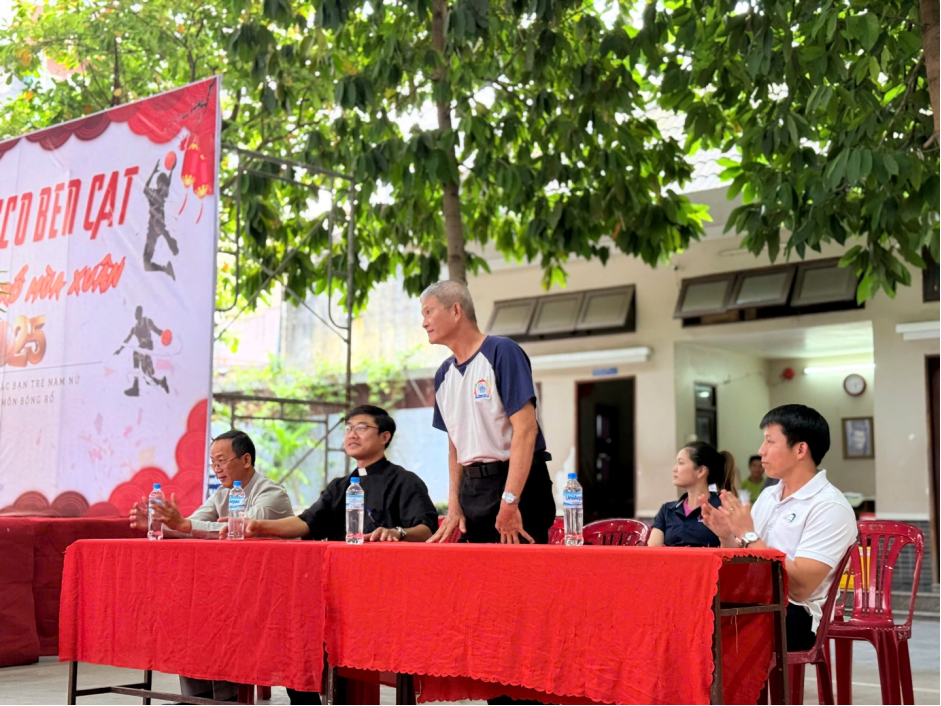 Linh mục Giuse Nguyễn Đức Tâm chia sẻ về lịch sử Dòng Don Bosco, nơi giúp các bạn trẻ thăng tiến không chỉ về kỹ năng mà còn về nhân bản, biết chơi đẹp và chia sẻ với nhau. Ông cũng tuyên bố khai mạc giải đấu bóng rổ mừng Xuân Ất Tỵ 2025.