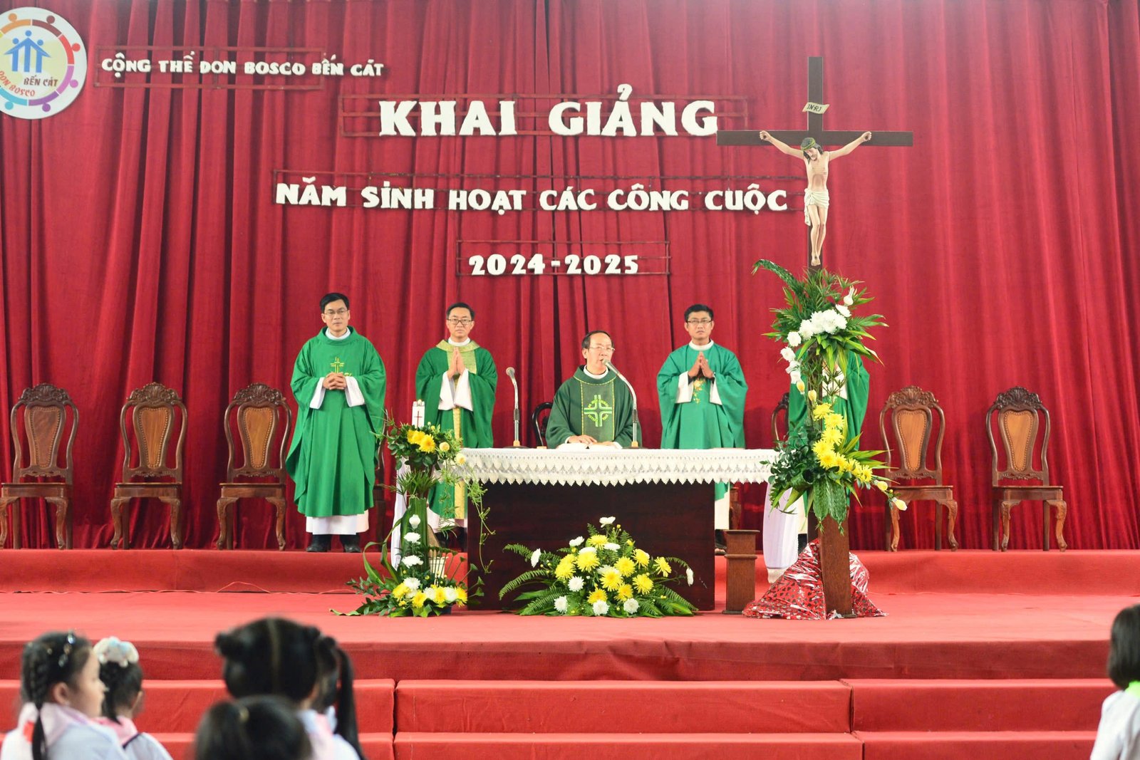 Lúc 7:30, Thánh lễ Khai giảng do cha Giám đốc Giuse Nguyễn Đức Tâm chủ sự, đồng tế có quý cha trong cộng thể. Trong Thánh lễ, có sự hiện diện của các công cuộc bao gồm: Giáo xứ Bến Cát, đại diện Cộng Tác Viên, Tu sinh, Dấn thân, Sinh viên, Trường Kỹ thuật Anrê Maisen và Nguyện xá.