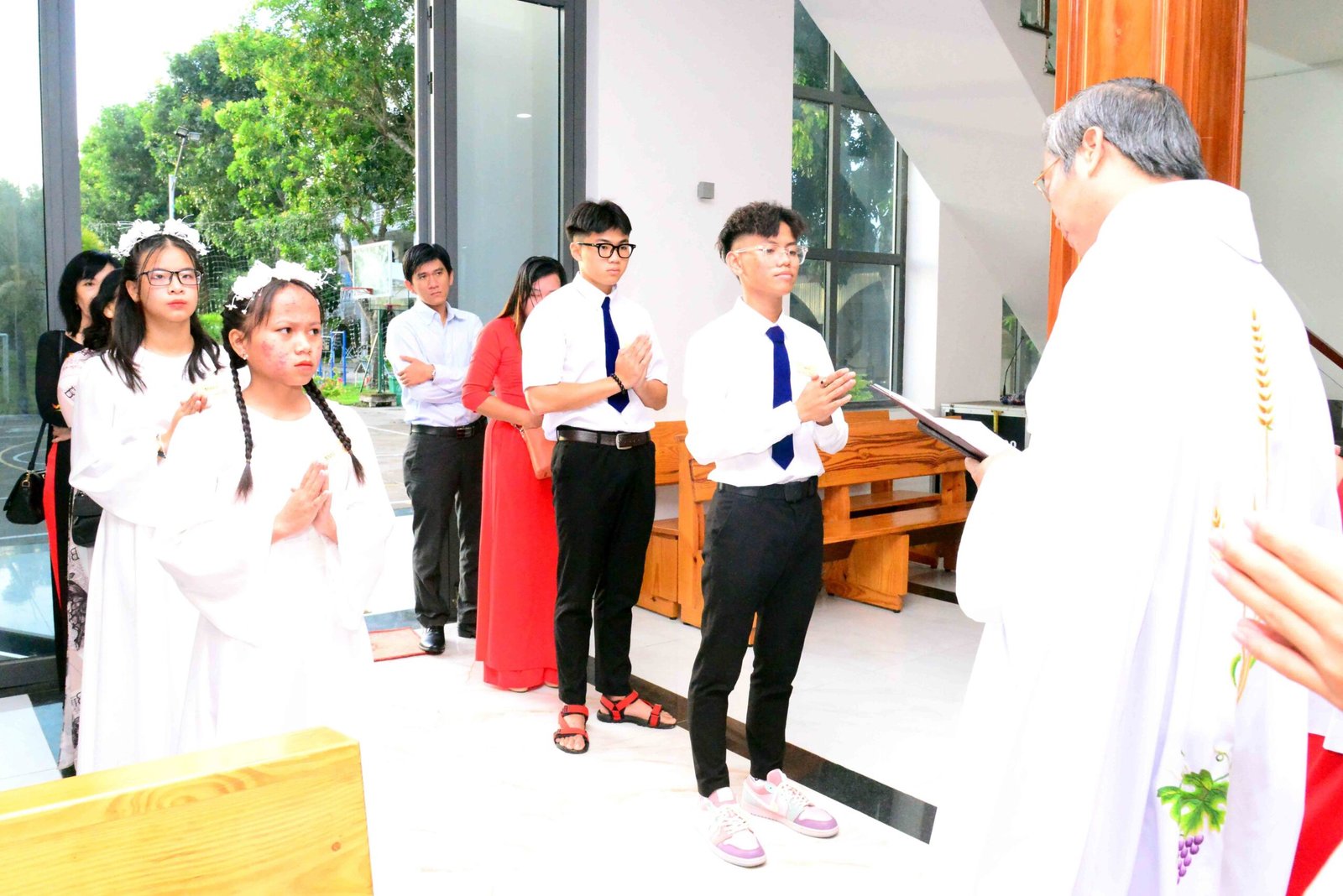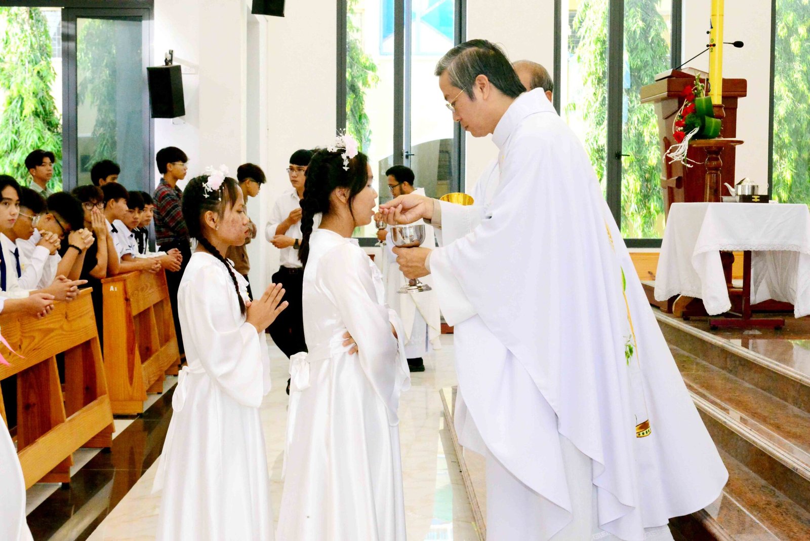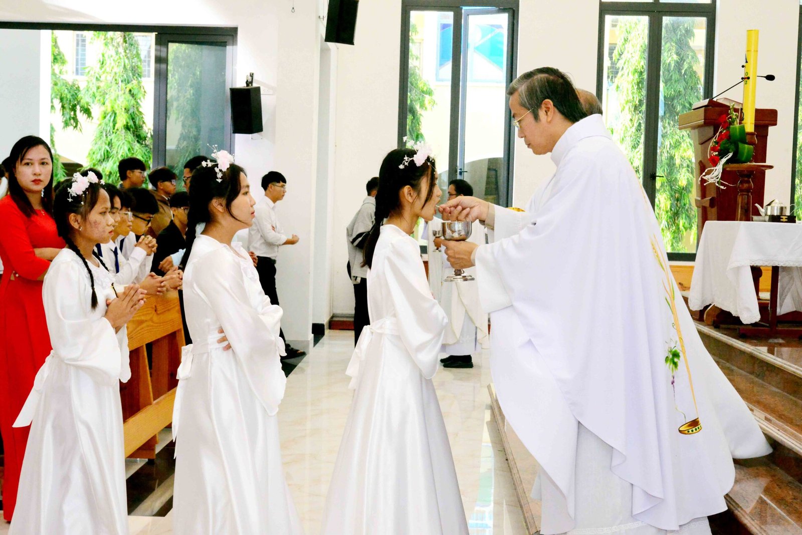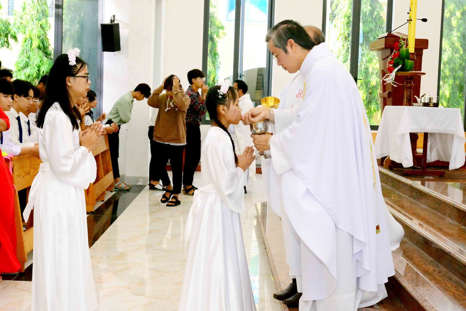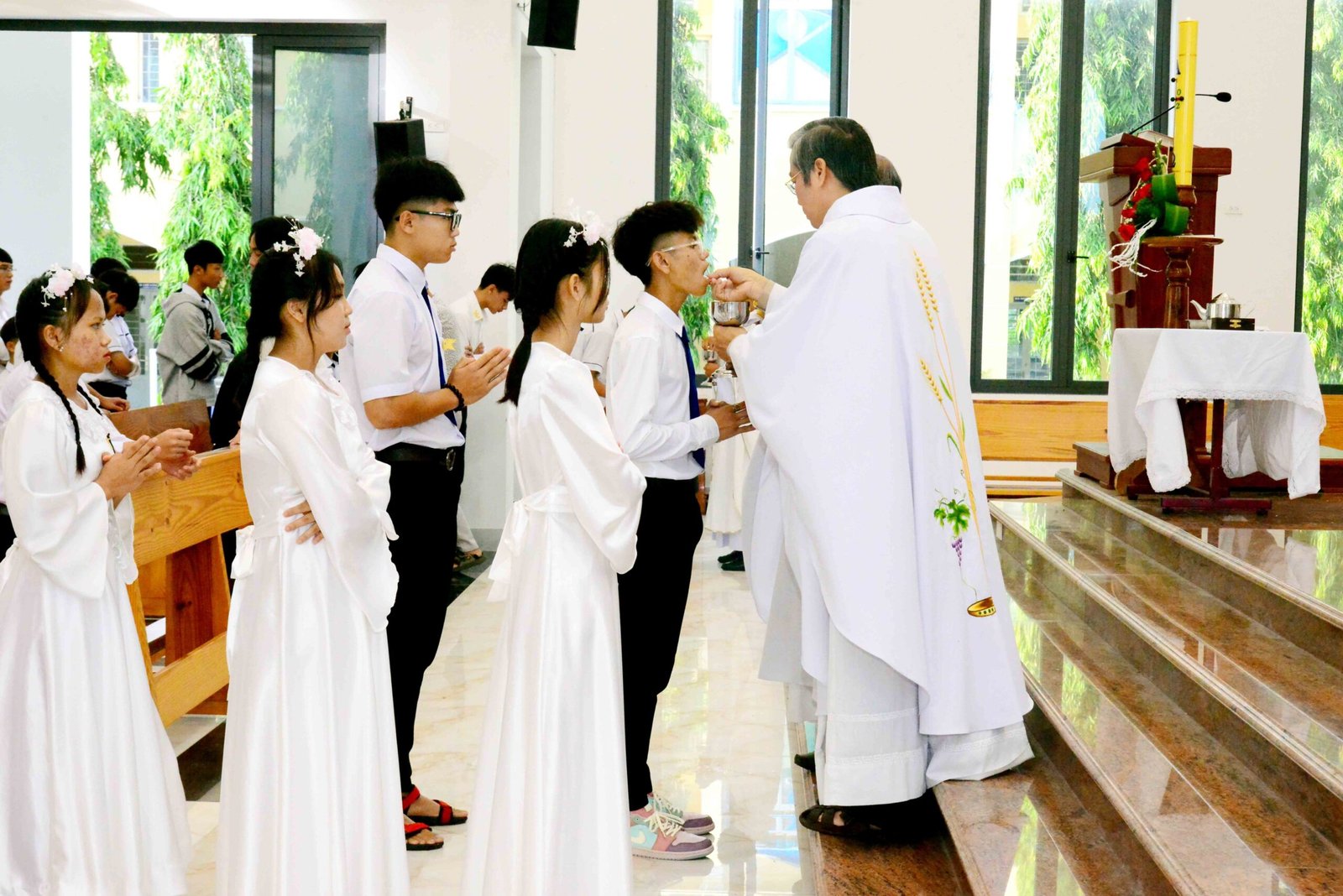 Thánh lễ kết thúc trong bầu khí trang nghiêm và sốt sắng, hòa cùng niềm xác tín và vui tươi của các bạn được đón Chúa lần đầu. Sau thánh lễ, mọi người cùng chia sẻ niềm vui và hân hoan trong việc ghi lại những bức hình lưu niệm và cùng nhau chia sẻ bữa sáng đầm ấm yêu thương.