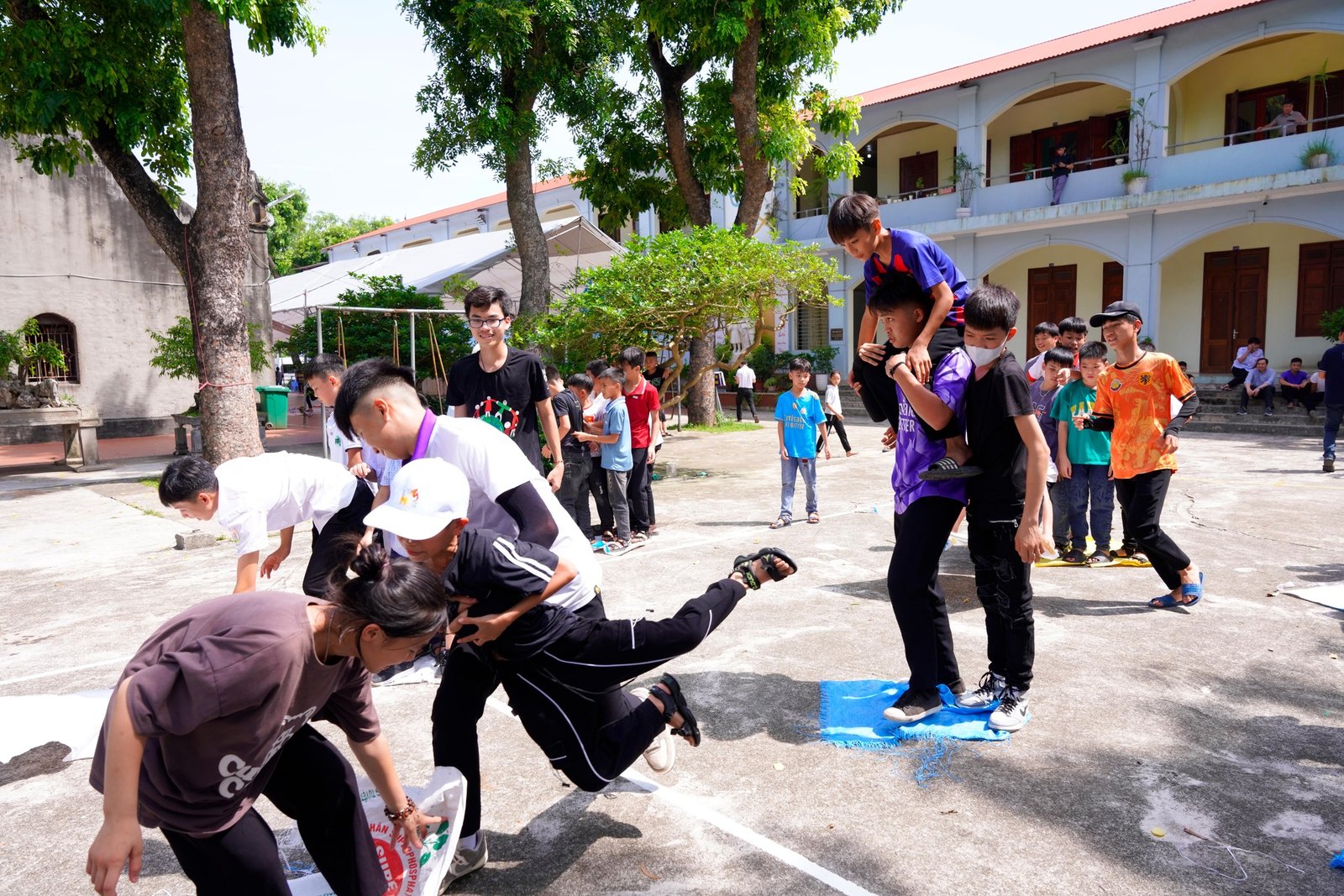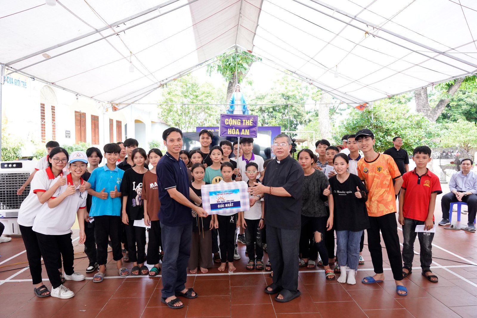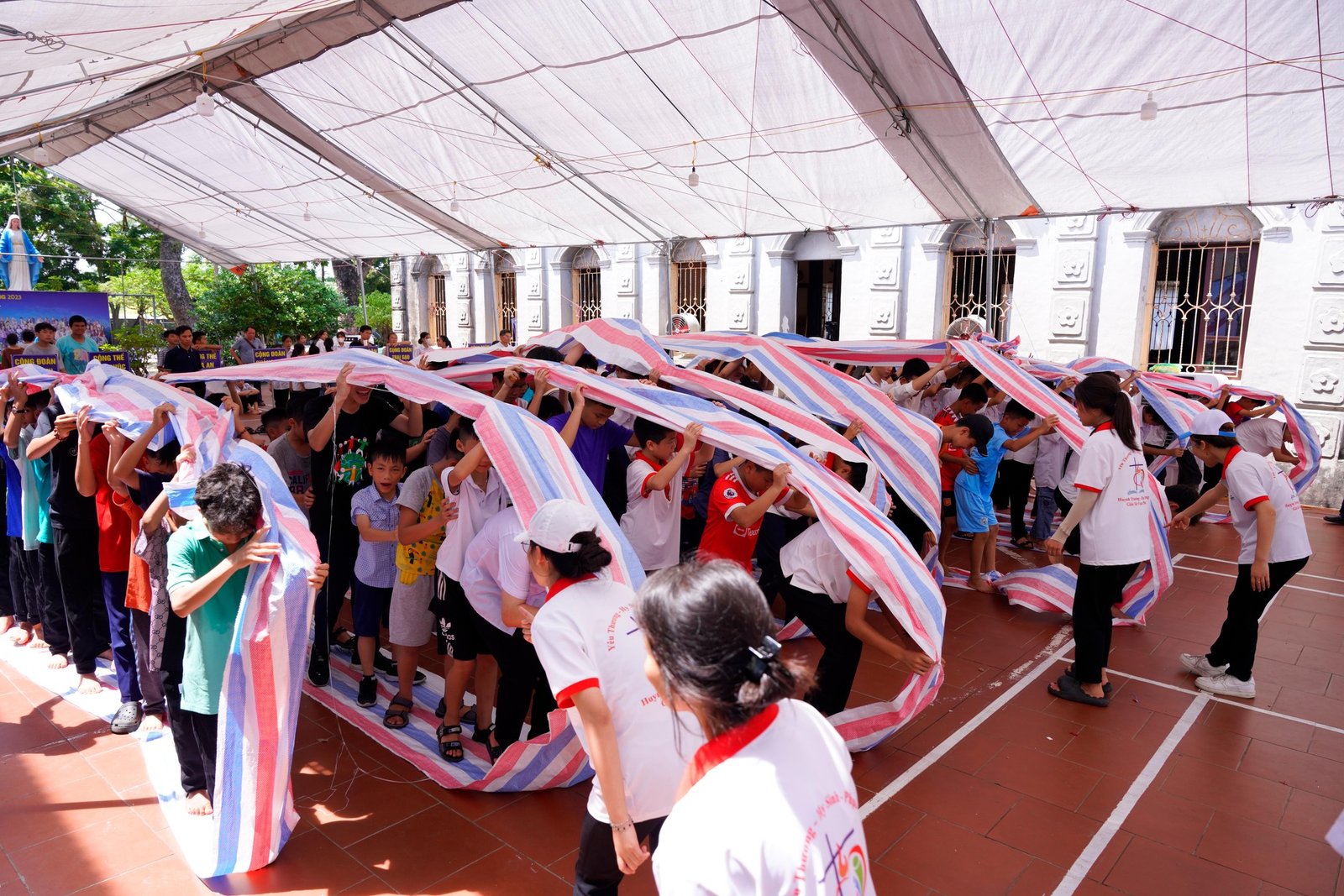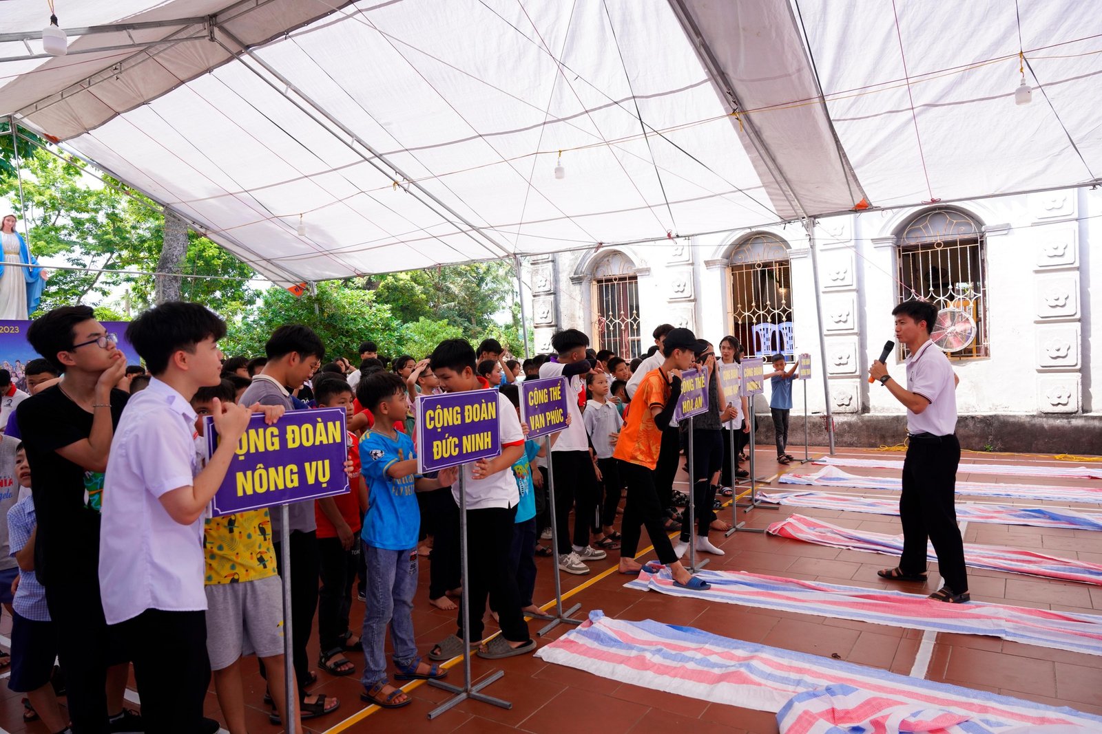 Đúng 9g15, phần thi đua vận động được diễn ra với nhiều trò chơi vui nhộn và hào hứng, mang nhiều bài học ý nghĩa về tinh thần dấn bước, đồng đội. Giữa các nội dung thi đua là các tiết mục sinh động của các bạn Huynh trưởng, Giáo lý viên và các em lễ sinh.
