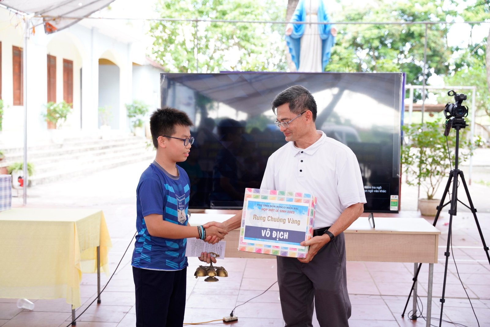 Cuối cùng là phần tổng kết và trao thưởng, sau khi các thầy công bố và trao thưởng, một em đại diện cho các bạn tham dự nói lên tâm tình biết ơn đến quý bề trên, quý cha và quý thầy đã luôn đồng hành, hỗ trợ và tạo điều kiện cho các em có một ngày họp mặt đầy ý nghĩa.