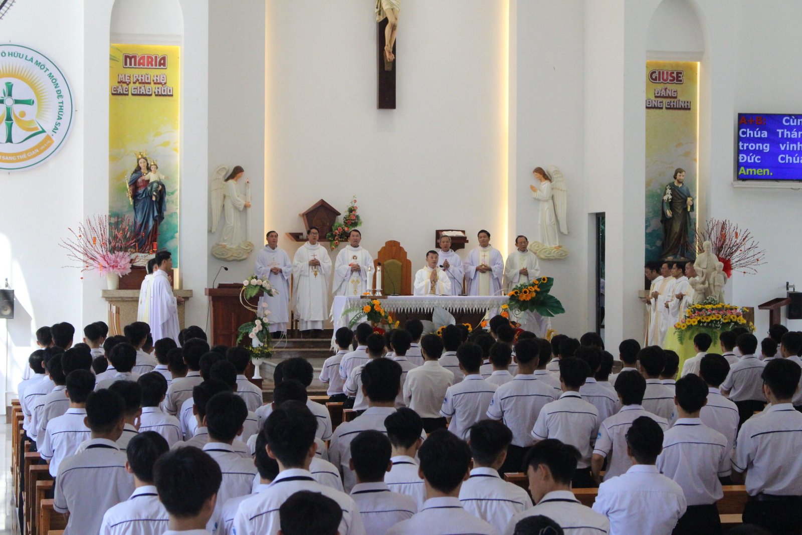 Sáng ngày 31/01, đỉnh cao của ngày lễ là Thánh lễ tạ ơn sốt sắng. Đồng tế với quý Cha trong cộng thể có sự hiện diện của quý Cha trong Giáo hạt Mỹ Thuận, cùng sự tham dự của quý ân nhân, thân nhân, thầy cô và toàn thể học sinh.