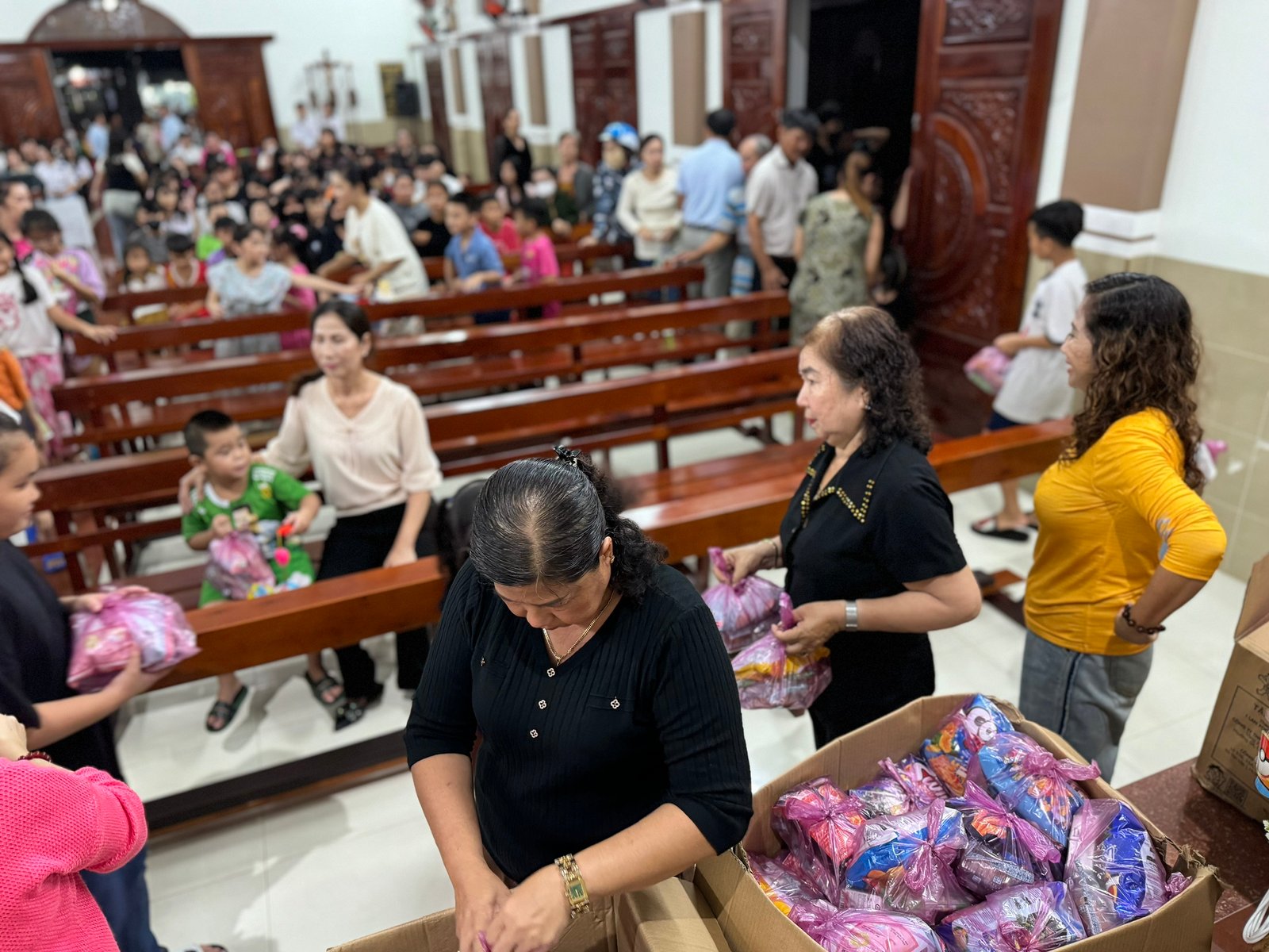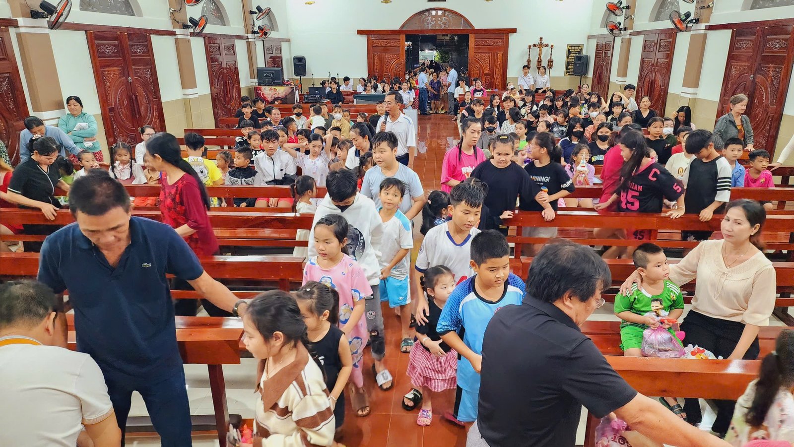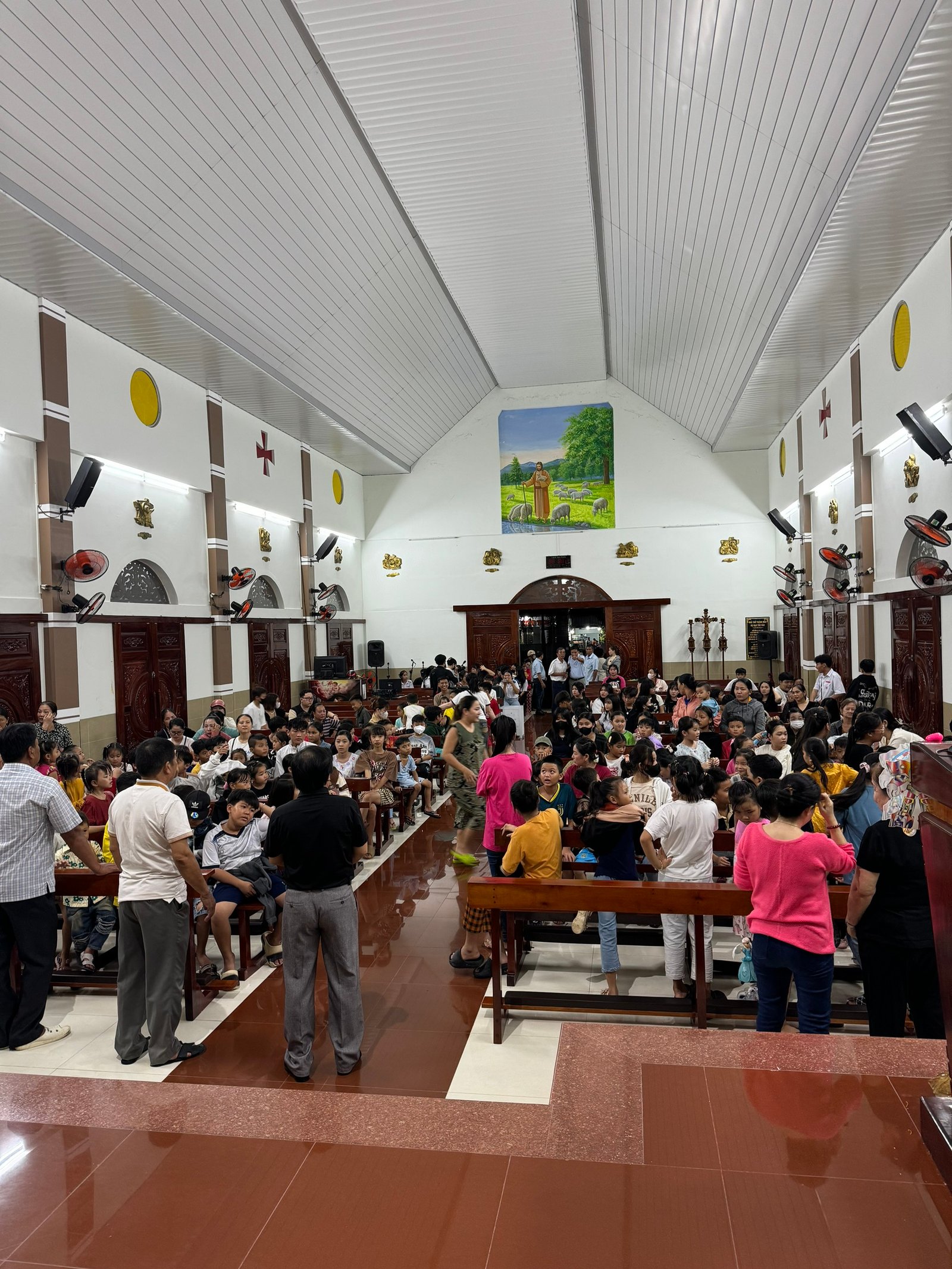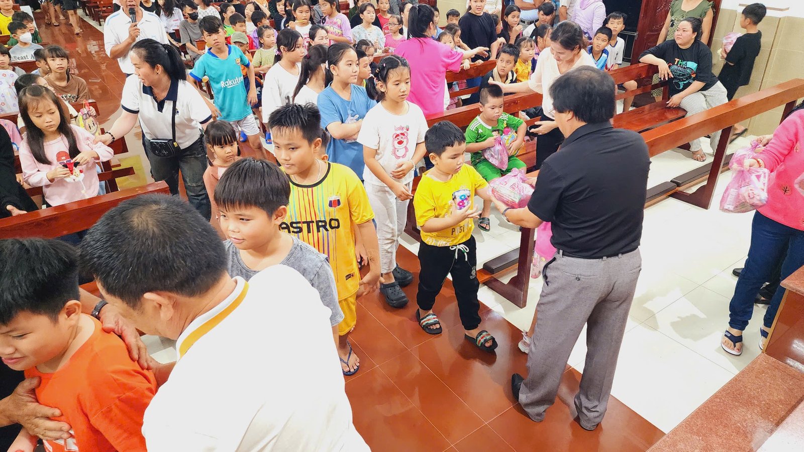 Chương trình mừng Tết Trung Thu bắt đầu bằng việc quý Cha và các em thiếu nhi cùng tham dự Thánh lễ tạ ơn và cầu nguyện cho những hoàn cảnh khó khăn, đặc biệt là người trẻ. Cha Giuse Nguyễn Văn Mạnh, qua bài chia sẻ Lời Chúa, đã nhắc đến tinh thần hiệp thông, cụ thể là việc chia sẻ với đồng bào bị thiên tai bởi cơn bão Yagi, theo lời kêu gọi của Đức Cha Stefano. Cha Giuse cũng giải thích cho các em hiểu về ý nghĩa của những hy sinh và những việc làm nhỏ bé, đặc biệt trong dịp Trung Thu năm nay: “ Giáo xứ sẽ không tổ chức văn nghệ rầm rộ như hằng năm, thay vào đó là việc dành cho các bạn kém may mắn hơn. Các con hãy làm những việc nhỏ bé, nhưng với tình yêu lớn thì giá trị sẽ lớn hơn.