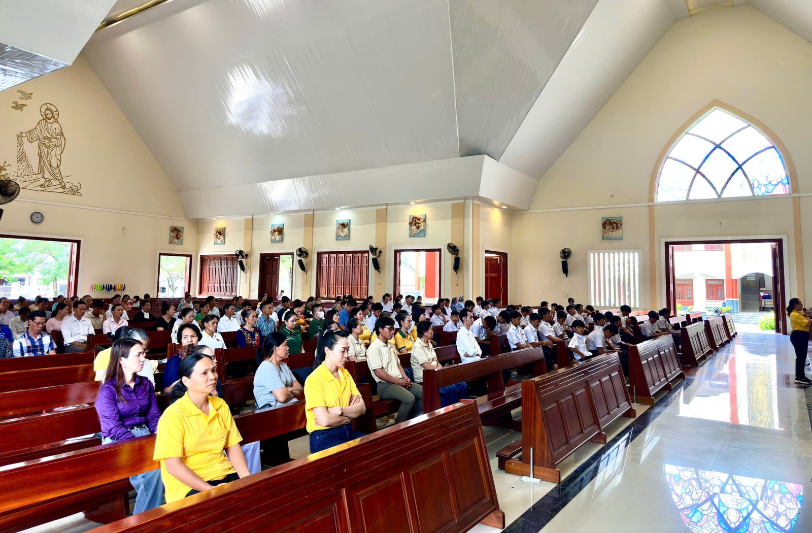 Thánh lễ diễn ra lúc 10 giờ sáng tại Thánh đường Giáo xứ Tân Cang. Trong bài giảng lễ, Cha Quản lý Nicola Kiều Long Hồ đã nhấn mạnh tầm quan trọng của tinh thần hiệp hành – cùng nhau bước đi trong sự lắng nghe, phân định và cộng tác – như một định hướng sống động trong đời sống Giáo hội và đặc biệt là trong môi trường giáo dục Salêdiêng. Ngài mời gọi cộng đoàn hiện diện sống tinh thần Salêdiêng qua việc sẻ chia, làm việc chung trong niềm vui, tình huynh đệ và sự hy sinh âm thầm.