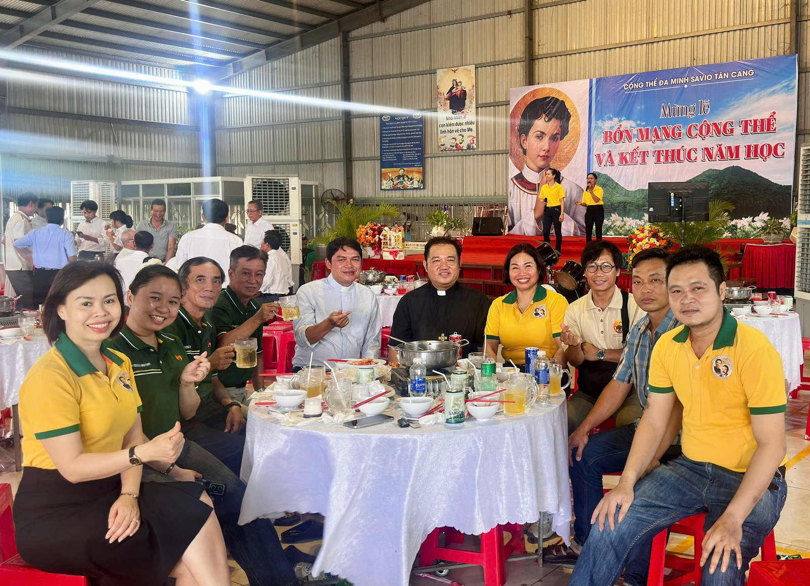 Ngay sau đó, quý Cha và toàn thể cộng đoàn đã cùng chung vui trong bữa cơm thân mật tại nhà đa năng của cộng thể. Bữa cơm là dịp để mọi người quây quần, chia sẻ niềm vui ngày lễ bổn mạng và tổng kết năm học, đồng thời tăng cường sự gắn kết giữa cộng thể, quý phụ huynh và các em học sinh.