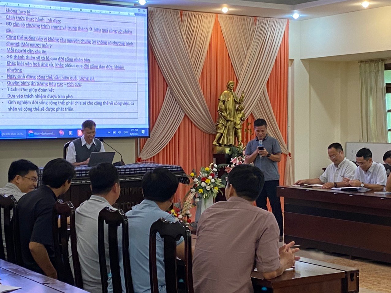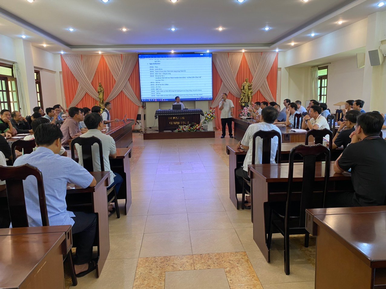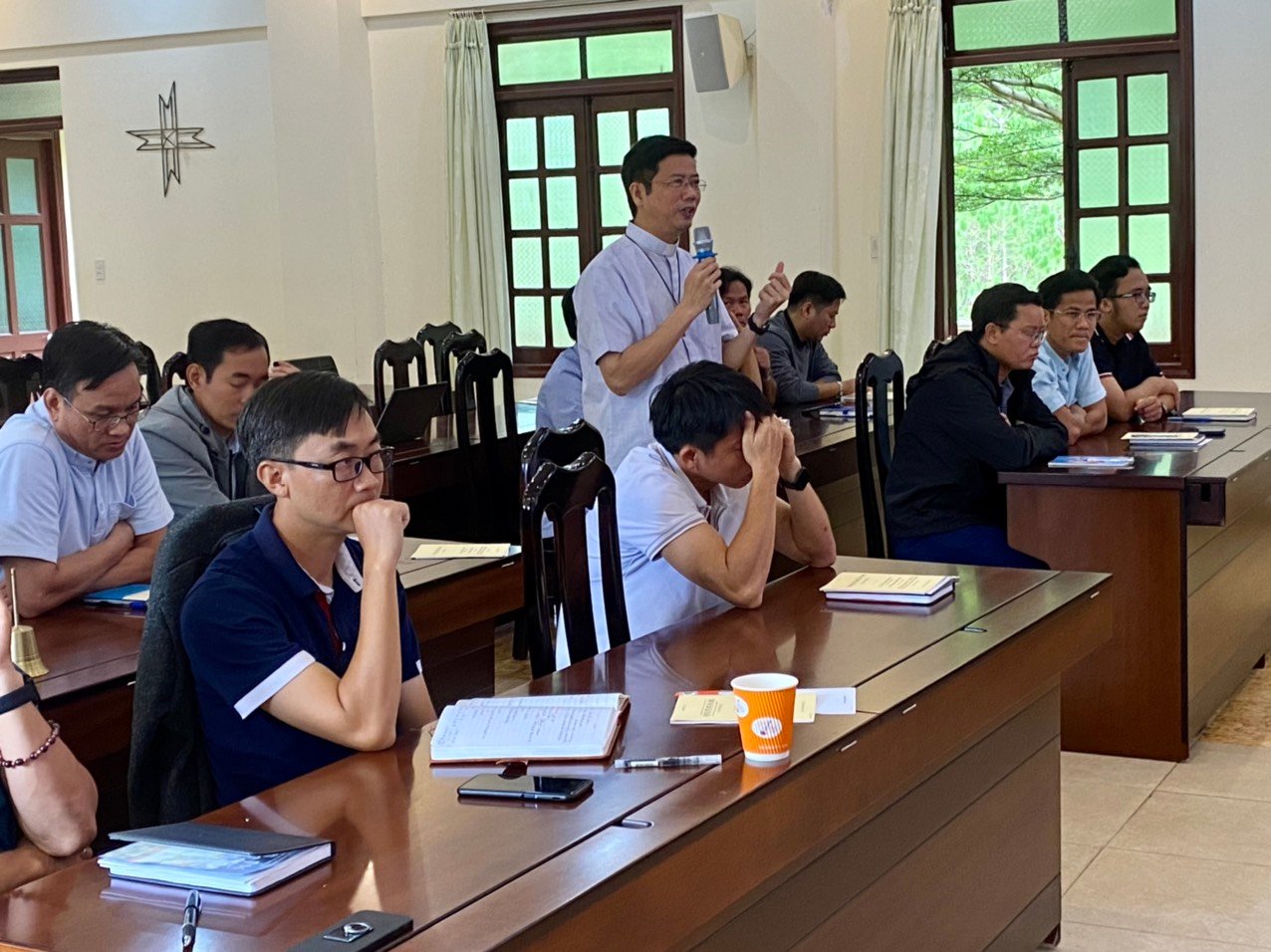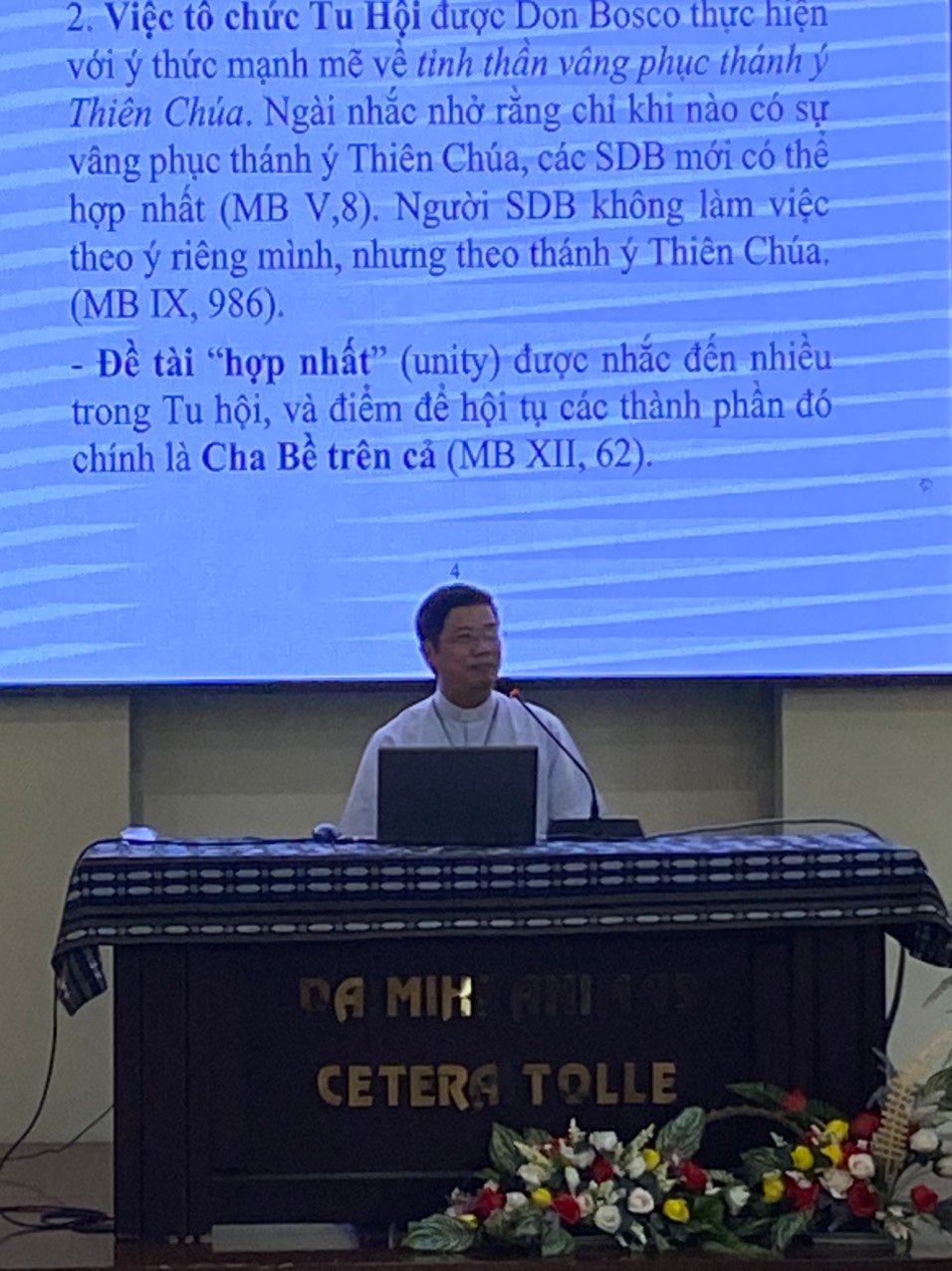 Năm nay, Ban đào luyện đã chọn những đề tài phục vụ cho mục đích chuẩn bị nhân sự cho Tỉnh dòng trong tương lai. Do đó, trong ngày 4/6, cha Giám tỉnh đã chia sẻ với các tham dự viên Đề Tài 1 liên quan đến vai trò lãnh đạo trong Cộng đoàn: Chuẩn Bị Tâm Thế Cho Trách Nhiệm Sinh Động – Hướng Dẫn Cộng Thể. Qua đề tài này, cha Giám tỉnh đã trình bày dung mạo lãnh đạo của Don Bosco như một mục tử với những đường nét tạo nên một người Cha, một Đấng sáng lập, một nhà giáo dục. Đồng thời, qua hình ảnh mẫu mực đó, cha Giám tỉnh mời gọi Quý Cha, Quý Sư Huynh nhớ lại và nêu lên những đường nét mà anh em học được từ các SDB khác về Don Bosco, khi được tiếp xúc, gặp gỡ họ. Qua những mẫu gương ấy, cha mong muốn người SDB phải trở thành hình ảnh của Don Bosco cho giới trẻ: một nhân cách thu hút, tạo cảm hứng và động lực cho người khác cách tích cực. Sau đó, cha chia sẻ điểm tiếp theo liên quan đến những nguyên tắc của quyền bính và việc lãnh đạo Cộng đoàn.