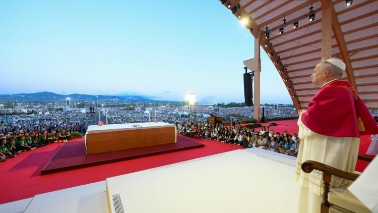 Đức Thánh Cha nhắc lại những lời của Thánh Gioan Phaolô II cách đây 25 năm cũng tại nơi này: “Chính Chúa Giêsu là Đấng các con tìm kiếm khi mơ về hạnh phúc; chính Người là Đấng chờ đợi các con khi những gì các con tìm thấy không làm các con mãn nguyện; chính Người là vẻ đẹp thu hút các con; chính Người khơi dậy trong các con khát khao mãnh liệt, không cho phép các con thỏa hiệp; chính Người là Đấng thúc đẩy các con cởi bỏ những mặt nạ làm cho cuộc sống trở nên giả tạo; chính Người là Đấng đọc được trong lòng các con những quyết định chân thật nhất mà người khác muốn bóp nghẹt”.