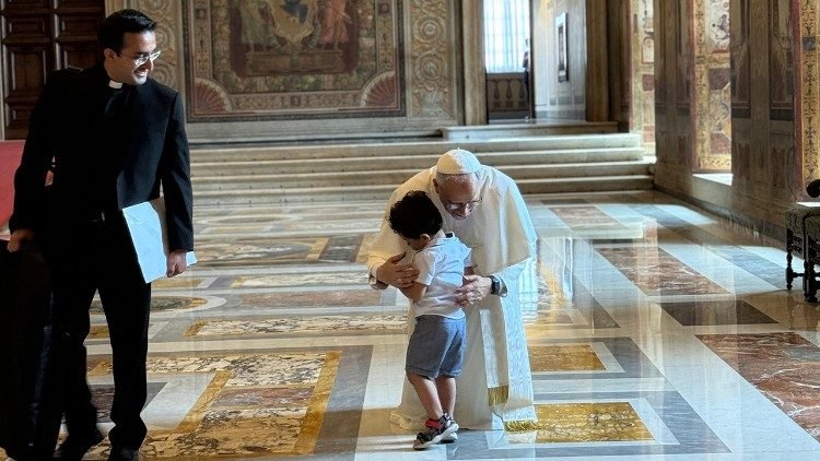 Rồi ngay khi Đức Thánh Cha xuất hiện, điều thật bất ngờ và xúc động đã xảy ra. Trong khi những người lớn chúng tôi vẫn giữ dáng vẻ nghiêm trang, xúc động, có lẽ còn hơi e dè trước giây phút đó, thì cậu bé như bừng sáng: em bỏ lại mọi thứ, và không do dự, chạy ào về phía Đức Thánh Cha, ôm chầm lấy ngài trong một cái ôm chân thành và tự