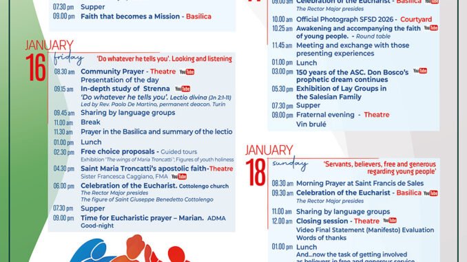 Ngày Thứ Sáu, 16 tháng Giêng, sẽ được dành cho việc khám phá chủ đề theo chiều kích Kinh Thánh và thần học, với buổi lectio divina (Đọc Kinh Thánh cách thiêng liêng) do Phó tế Paolo De Martino hướng dẫn, và sau đó là chia sẻ theo nhóm ngôn ngữ, một không gian quý giá cho cuộc đối thoại thực tế về những thách thức của đức tin ngày nay. Vào buổi chiều, chương trình sẽ mang đến cho những người tham dự một số đề xuất để hiểu rõ hơn về vị thánh mới Chị Maria Troncatti, với chuyến viếng thăm có hướng dẫn đến triển lãm ‘Đôi cánh của Maria Troncatti’ và một nghiên cứu sân khấu về hình ảnh nữ tu truyền giáo FMA. Nghi thức cử hành Thánh Thể sẽ diễn ra tại nhà thờ Thánh Giuse Biển Đức Cottolengo và sẽ tôn vinh ký ức về vị thánh Piedmont nổi tiếng này, qua đó đánh dấu sự bén rễ của linh đạo Salêdiêng trong truyền thống lớn về đức ái xã hội, vốn là nét đặc trưng của Turin. Cuối cùng, buổi canh thức cầu nguyện do Hội Hiệp sĩ Đức Mẹ Phù Hộ (ADMA) tổ chức sẽ khép lại ngày này.