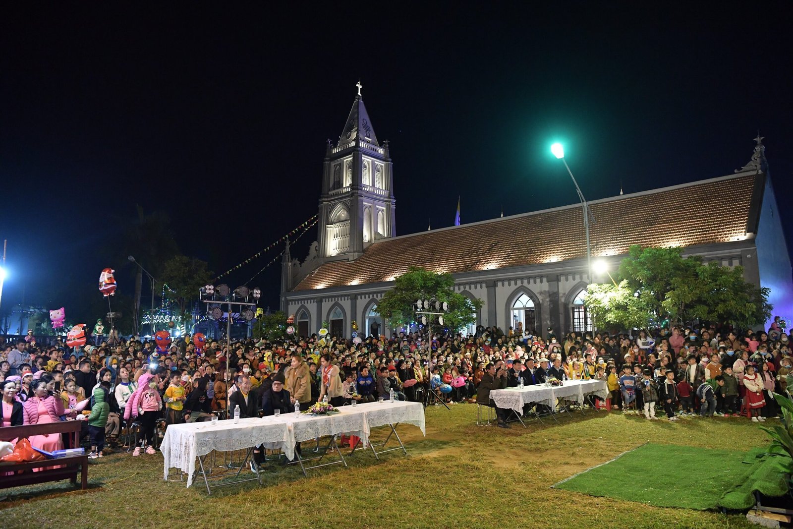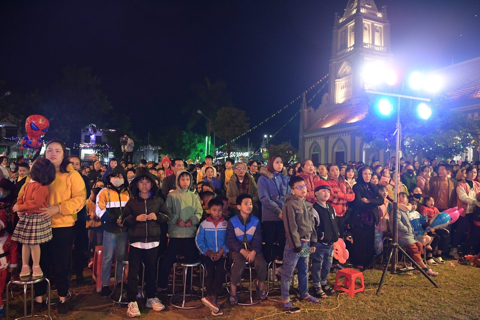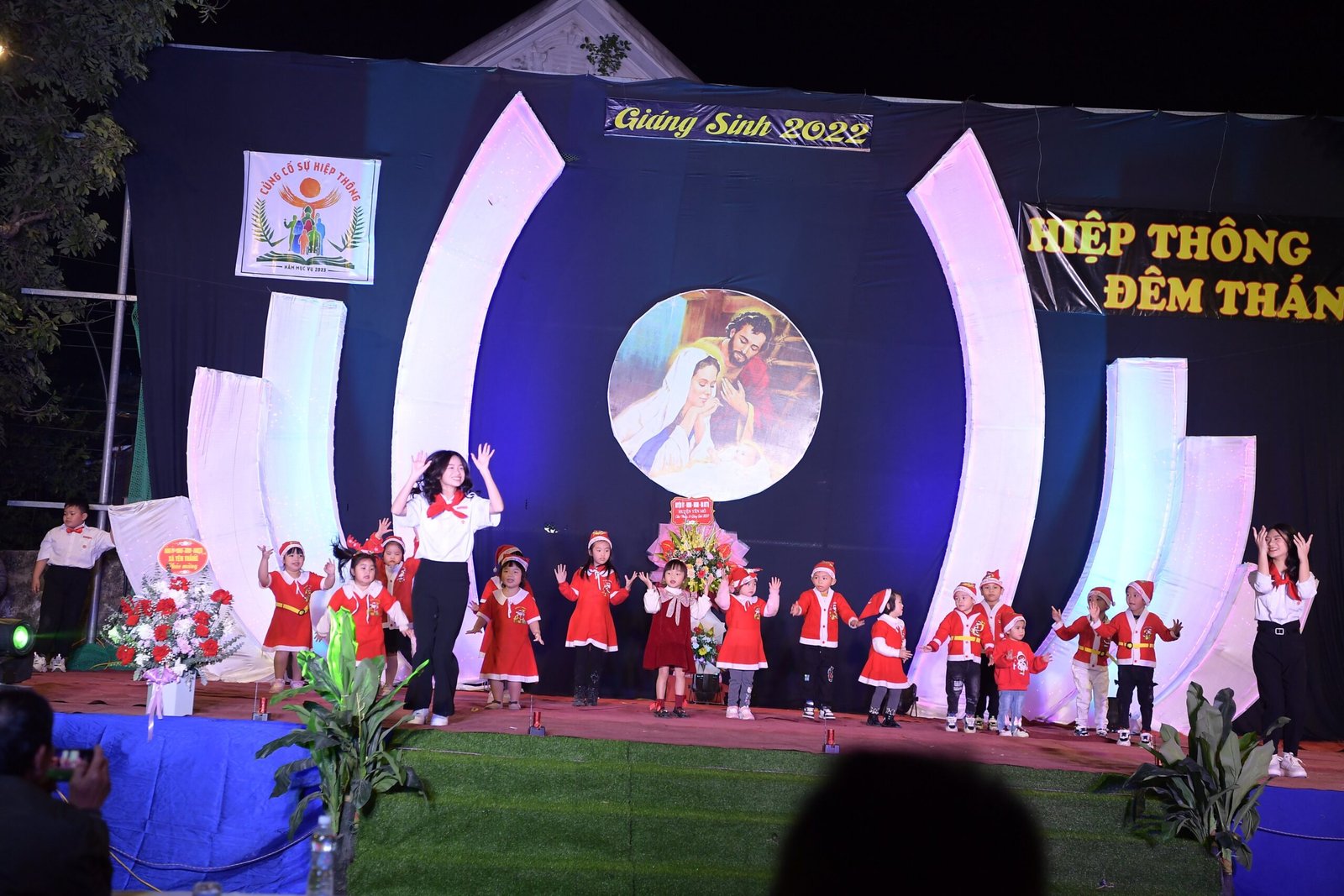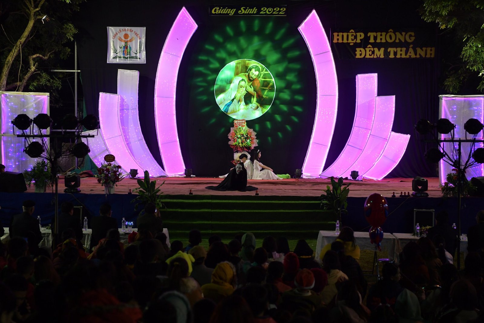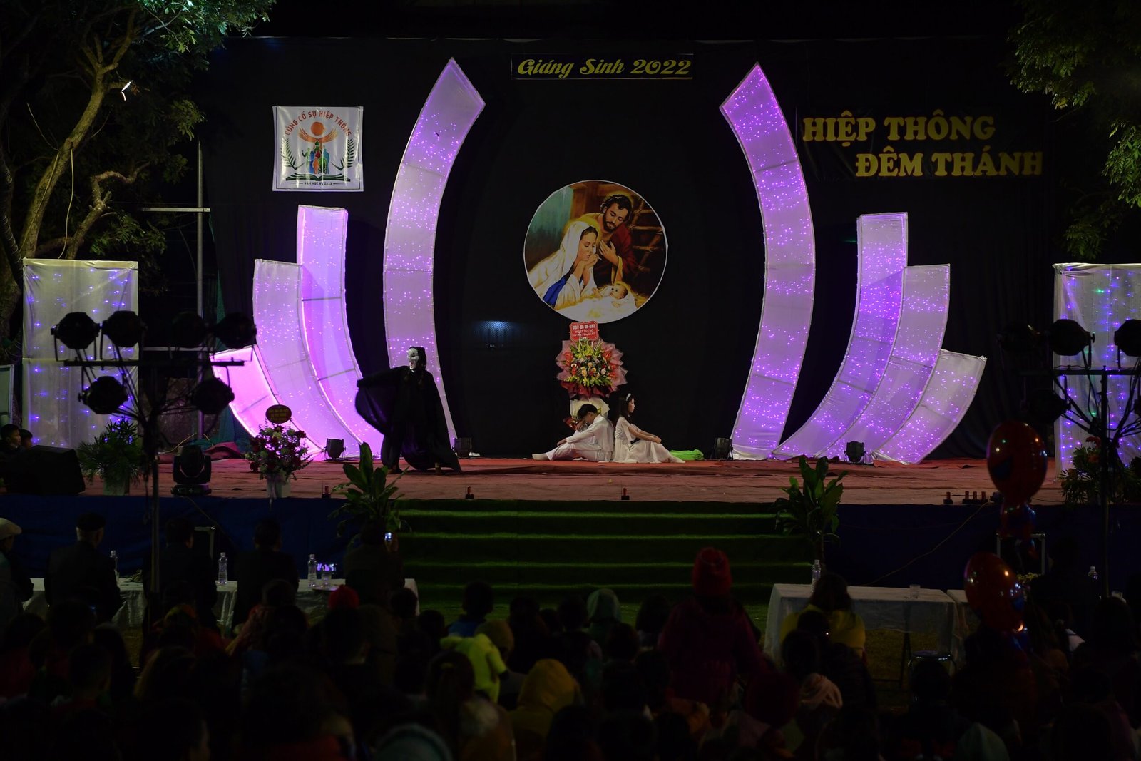 Càng gần đến giờ diễn ra chương trình, người người ngày càng thêm đông. Mọi người đến để tham quan, để check in… trong đó cũng có những người thành tâm thiện chí âm thầm lặng lẽ theo dõi từ đầu đến cuối, kể cả tham dự Thánh lễ. Chương trình diễn ra với không gian sân khấu do các bạn giới trẻ cùng với Cha xứ lên ý tưởng, tìm vật liệu sao cho phù hợp với khả năng mình có được, không phải là những tấm poster in ấn nhanh gọn, tiện lợi, mà là sự chăm chút tỉ mỉ dù mất thời gian, nhưng lại có sự sáng tạo của những người trẻ. Một điểm son trong chương trình đó chính là sự bản lĩnh và sáng tạo của các bạn huynh trưởng và các MC. Khi các bạn biết rằng năm nay không có các Sơ về giúp trong màu Giáng Sinh, lúc đầu các bạn cũng rất lo lắng, nhưng rồi với sự cố gắng học hỏi, tìm tòi và cộng tác với nhau, các huynh trưởng đã khéo léo xây dựng một kịch bản hấp dẫn với những khúc kịch tính cao trào.