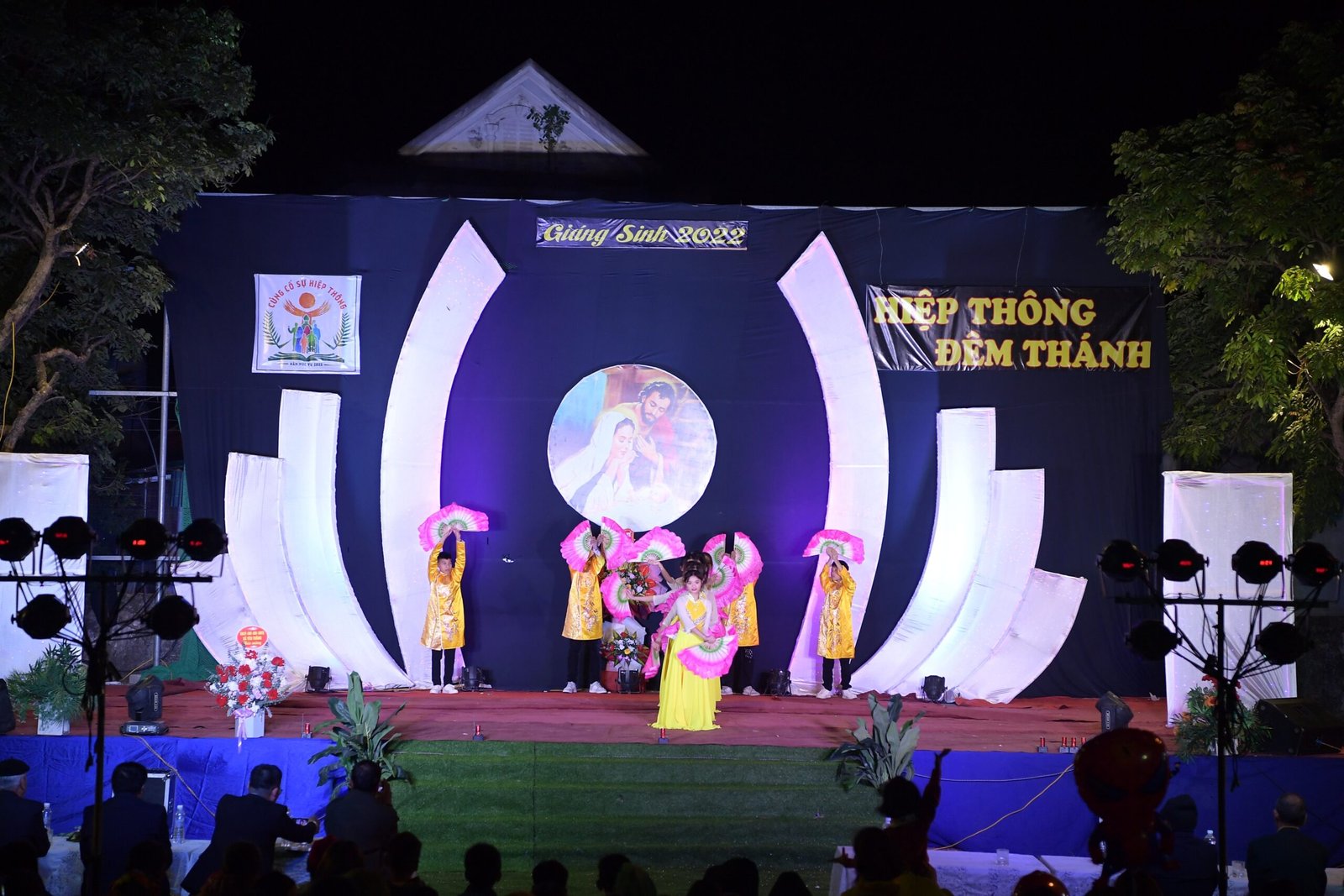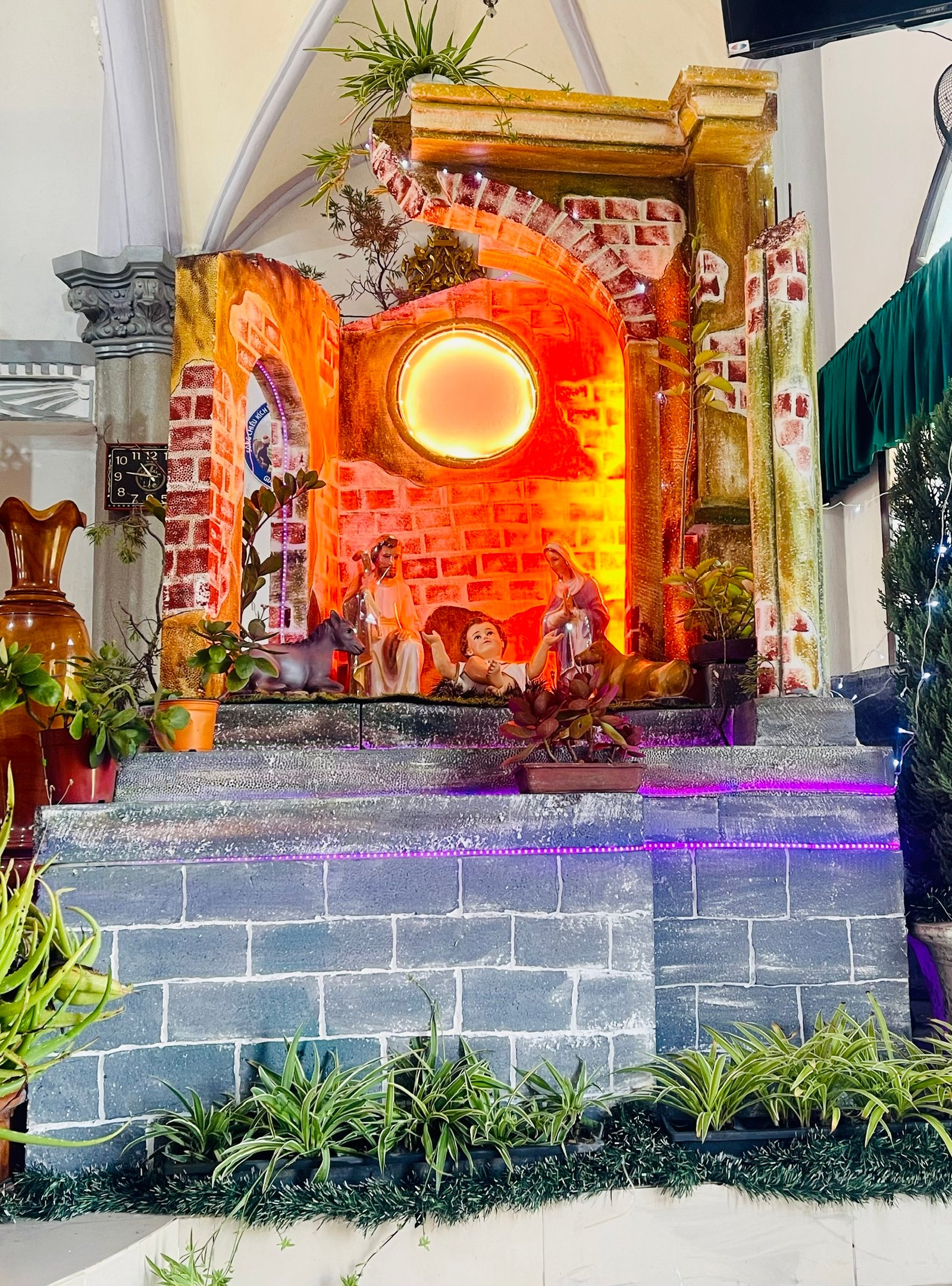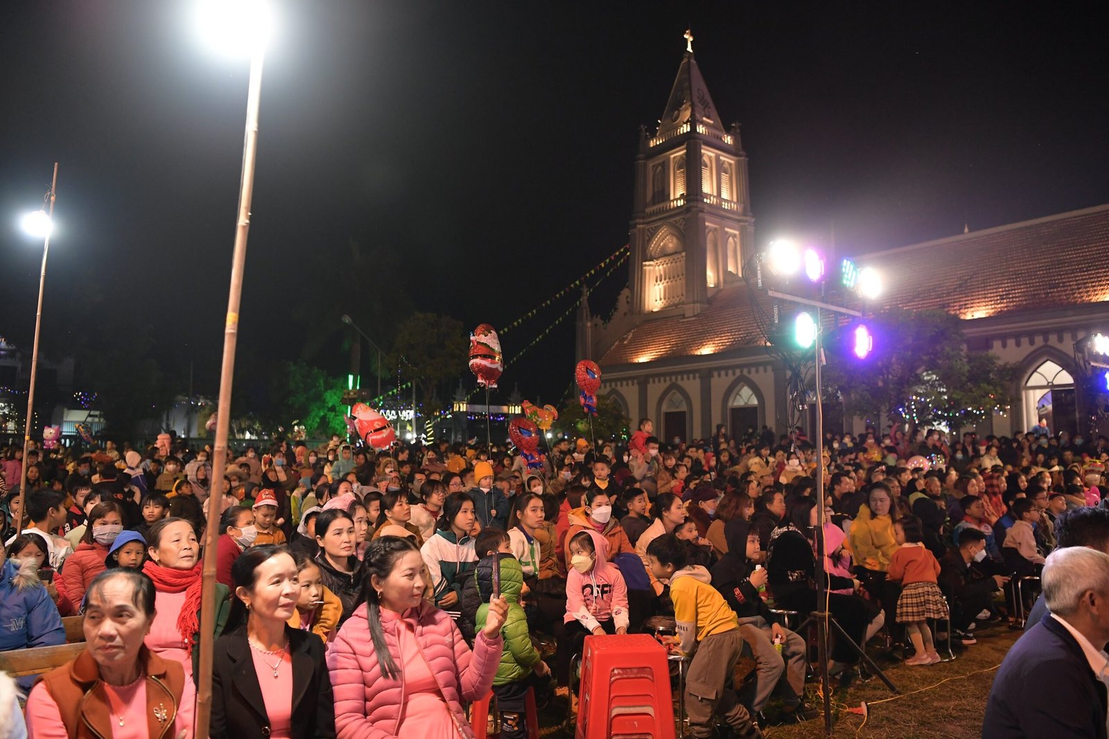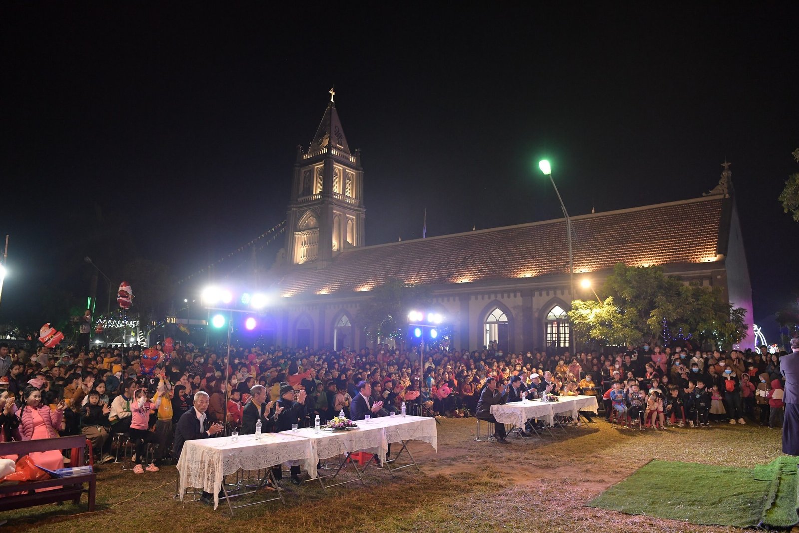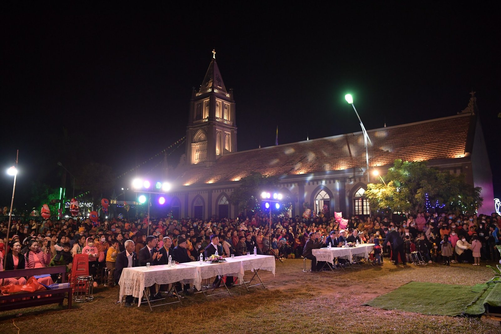 Càng gần đến giờ diễn ra chương trình, người người ngày càng thêm đông. Mọi người đến để tham quan, để check in… trong đó cũng có những người thành tâm thiện chí âm thầm lặng lẽ theo dõi từ đầu đến cuối, kể cả tham dự Thánh lễ. Chương trình diễn ra với không gian sân khấu do các bạn giới trẻ cùng với Cha xứ lên ý tưởng, tìm vật liệu sao cho phù hợp với khả năng mình có được, không phải là những tấm poster in ấn nhanh gọn, tiện lợi, mà là sự chăm chút tỉ mỉ dù mất thời gian, nhưng lại có sự sáng tạo của những người trẻ. Một điểm son trong chương trình đó chính là sự bản lĩnh và sáng tạo của các bạn huynh trưởng và các MC. Khi các bạn biết rằng năm nay không có các Sơ về giúp trong màu Giáng Sinh, lúc đầu các bạn cũng rất lo lắng, nhưng rồi với sự cố gắng học hỏi, tìm tòi và cộng tác với nhau, các huynh trưởng đã khéo léo xây dựng một kịch bản hấp dẫn với những khúc kịch tính cao trào.