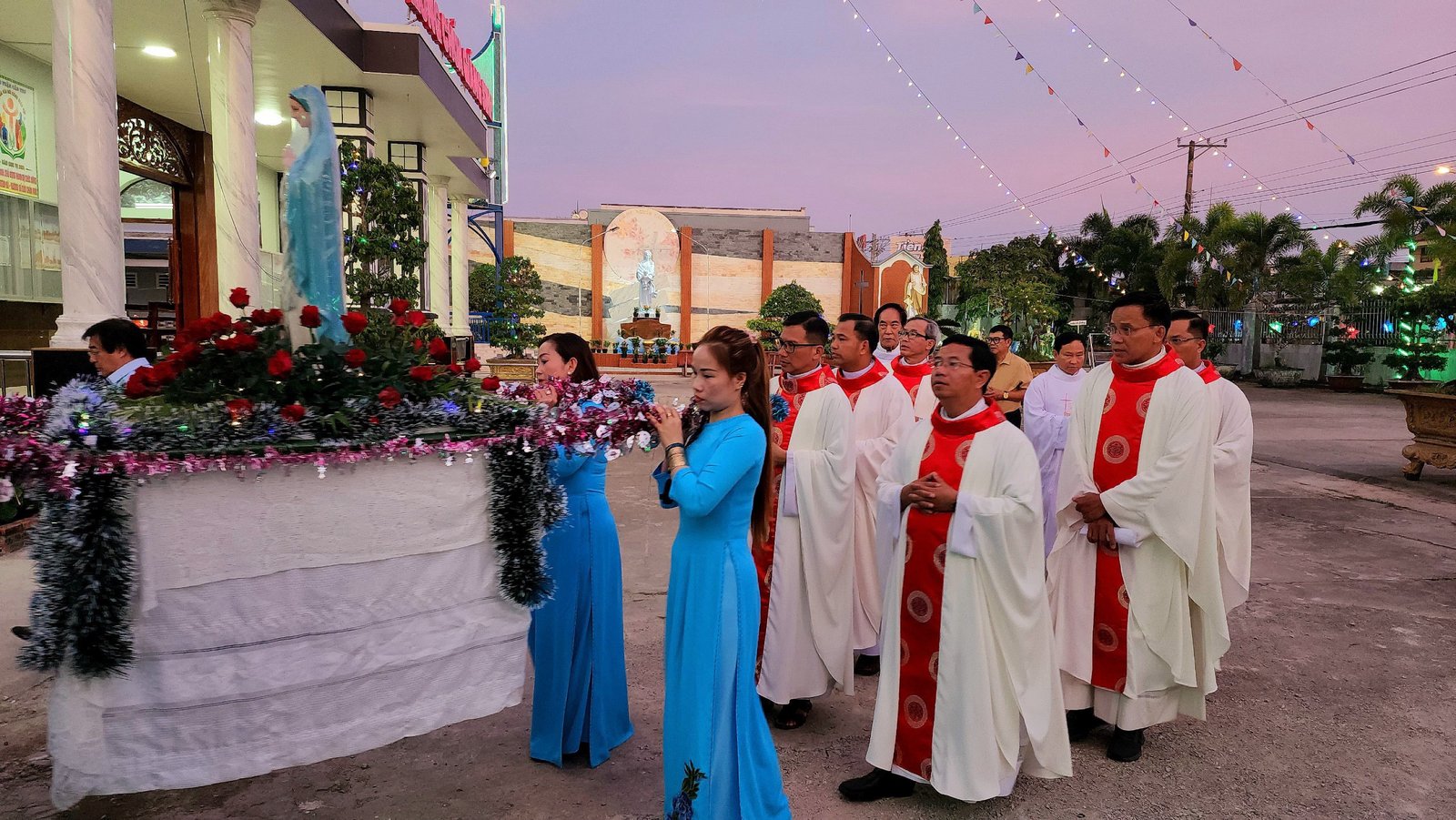 17h00 chiều, cộng đoàn Giáo xứ đã hân hoan mừng đón sự hiện diện của Cha Quản hạt cùng quý Cha, quý Thầy và quý khách. Đến 17h40, quý Cha cùng cộng đoàn Dân Chúa quy tụ trước đài Đức Mẹ để làm phép các tượng đài, sau đó cộng đoàn xếp hàng theo đoàn rước kiệu thật trang trọng cung nghinh Đức Mẹ và tiến vào thánh đường để tham dự Thánh lễ.