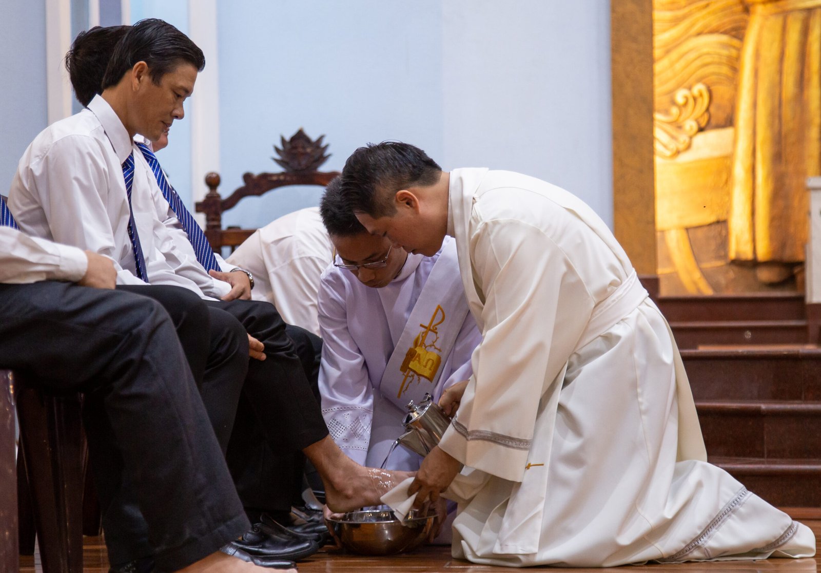 Sau lời dẫn nhập lễ, cha chủ tế và đoàn đồng tế cùng nhau tiến lên bàn thờ để bắt đầu dâng Thánh lễ. Với lời chào đầu lễ, cha chủ tế mời gọi mọi người tham dự Thánh lễ một cách sốt sáng các Nghi thức trong ngày lễ Thứ Năm hôm nay, để có thể hiểu và sống như những lời và những hành động mà Chúa đã làm trong ngày thứ Năm này.