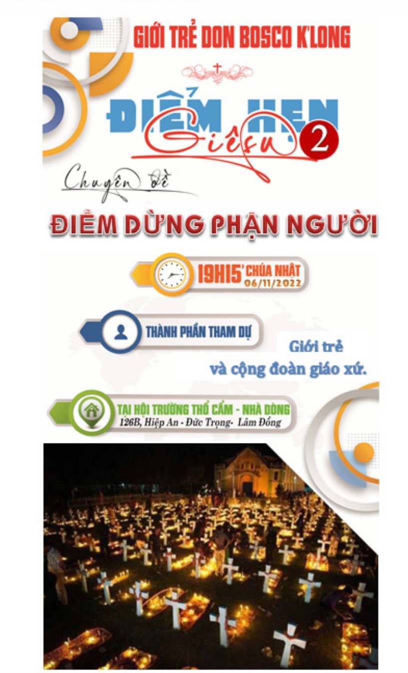Vào lúc 19 giờ 30 Chúa Nhật 5/11/2023, tại hội trường Giáo xứ Don Bosco K’Long, Giáo hạt Đức Trọng, Giáo phận Đà Lạt diễn ra chương trình “Điểm hẹn Giê-su” lần thứ 11.