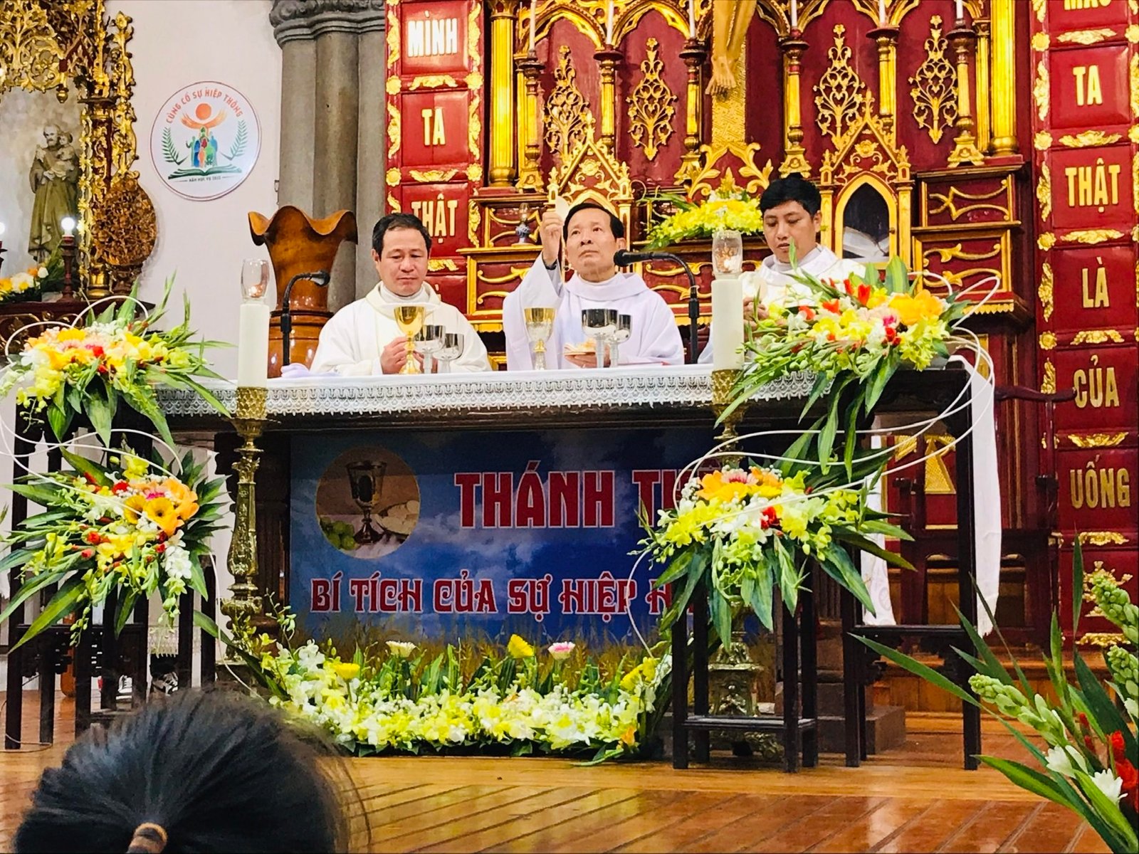 Sau buổi cung nghinh Chúa Giêsu Thánh Thể, cộng đoàn Giáo xứ cùng dâng lời tạ ơn Thiên Chúa qua Thánh Lễ đồng tế do quý cha đến từ giáo phận Phát Diệm, Bùi Chu, Thái Bình, Hà Nội và Sài Gòn.