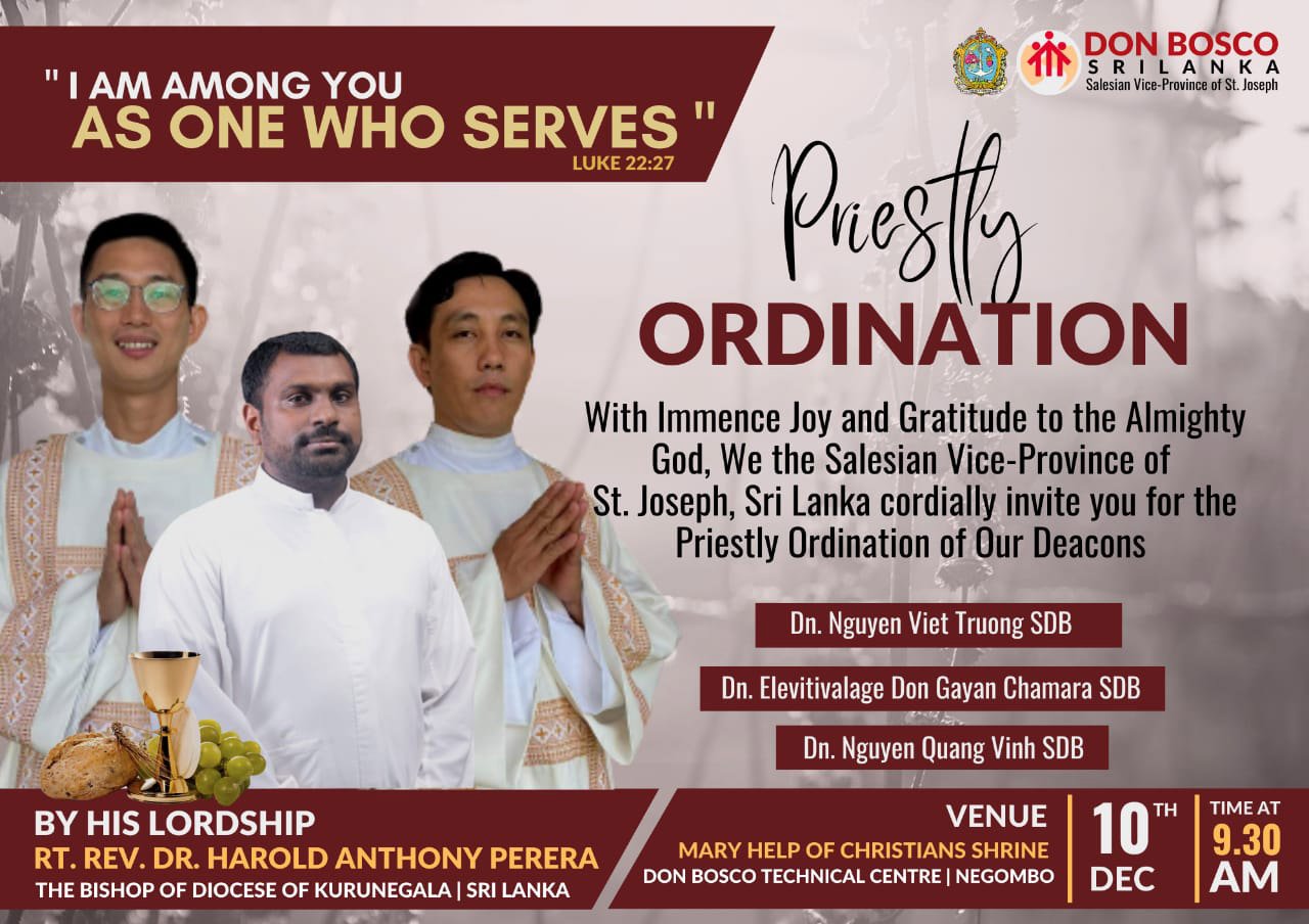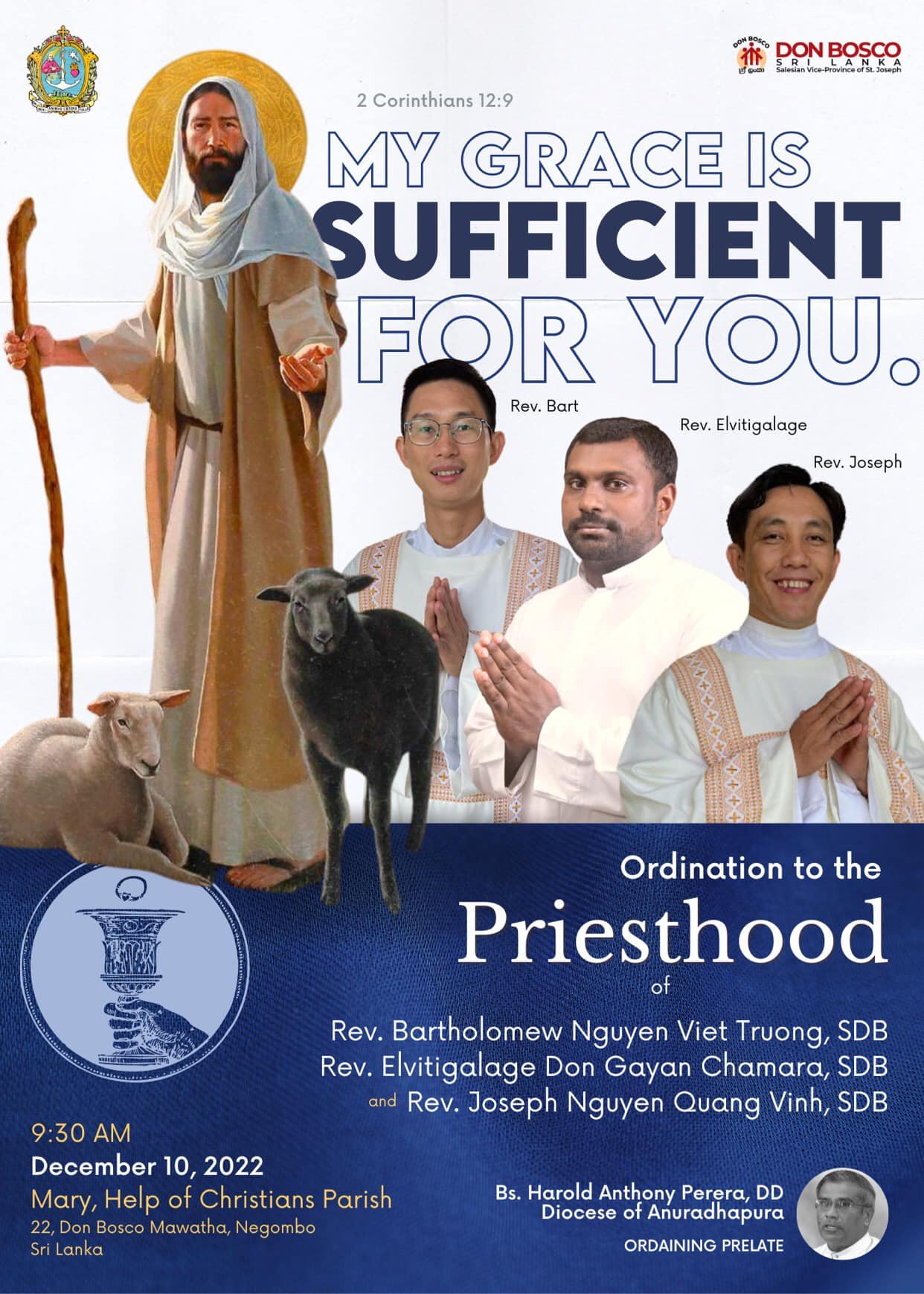 Thứ Bảy tuần trước, ngày 10 tháng 12 năm 2022, trong số 3 tân Linh mục Salêdiêng được thụ phong tại Đền thờ Đức Mẹ Phù hộ các Giáo hữu, Negombo, Á Tỉnh Sri Lanka, có hai nhà truyền giáo Salêdiêng đến từ Việt Nam, Cha Batolomeo Nguyễn Việt Trường và Cha Giuse Nguyễn Quang Vinh.