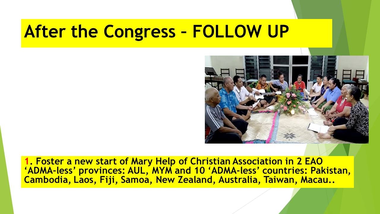 Trong 12 tỉnh dòng thuộc miền EAO, ba tỉnh dòng có con số các thành viên của Hiệp hội ADMA khá dồi dào, đó là tỉnh dòng Bắc Philippines, nam Philippines và Á tỉnh Đông Timor, với hơn 80 nhóm. Riêng tại tỉnh dòng Việt nam, Hiệp hội ADMA đã có 2 nhóm được thành lập, một nhóm ở Trại gạo, Thái bình và một nhóm khác ở Bến cát, Sài gòn.