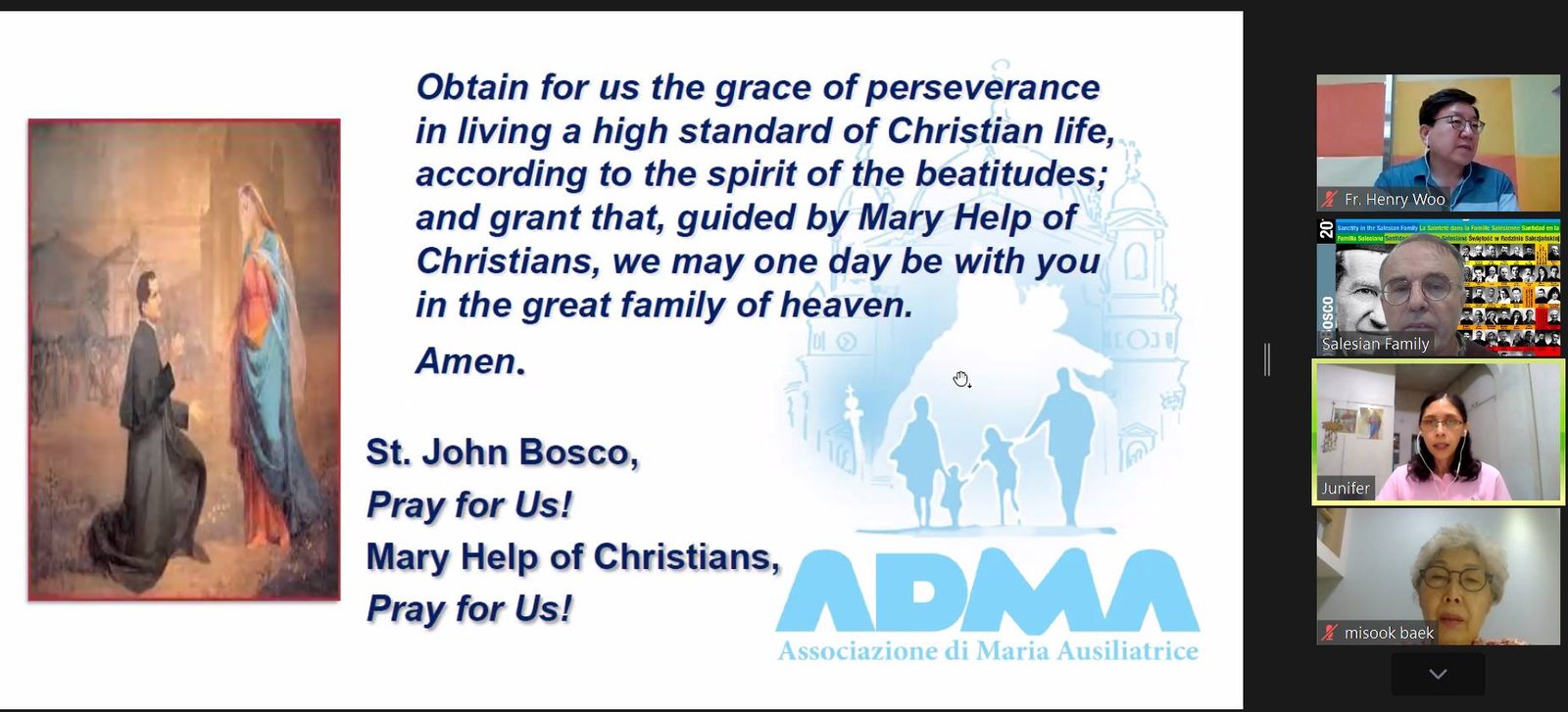 Chúng ta cũng cần nhắc lại rằng, Hiệp hội ADMA là 1 trong 4 nhóm thuộc Gia đình Salêdiêng do chính Don Bosco thành lập (nhóm SDB, nhóm FMA, nhóm Cộng tác viên Salêdiêng và nhóm ADMA).