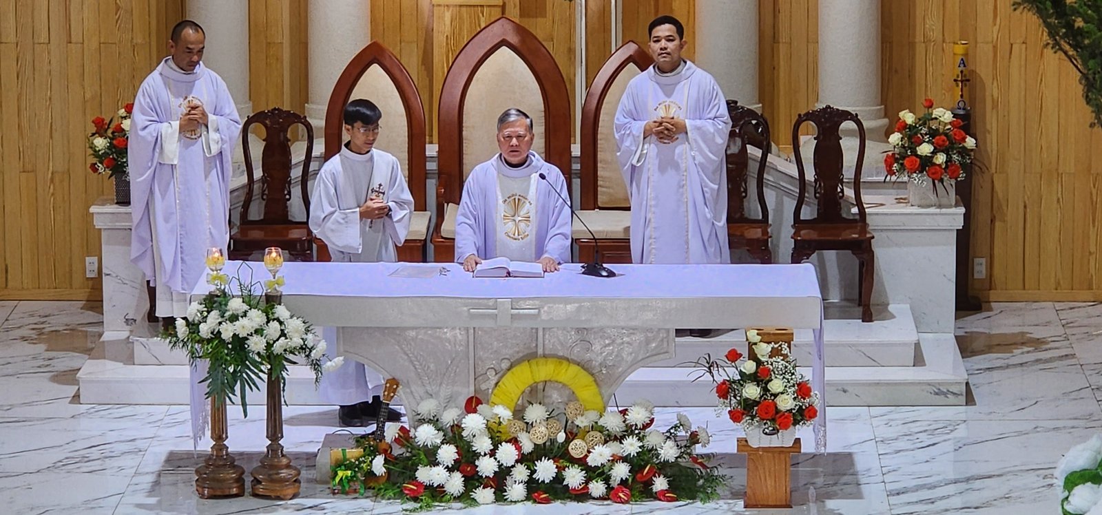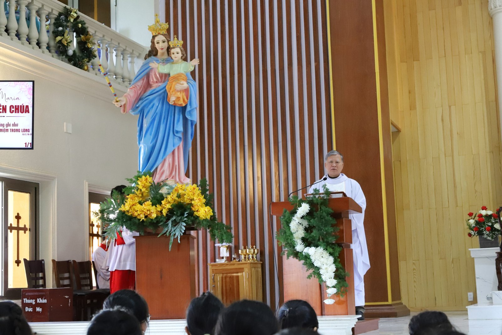 Sau nghi thức chào đón, lúc 8 giờ, Cha Augustino Chu Đăng Chấn chủ sự thánh lễ mừng kính Đức Maria Mẹ Thiên Chúa- Cầu bình an cho năm mới. Cha Chấn chia sẻ “Đức Mẹ là Mẹ Thiên Chúa, mẹ của Chúa Giêsu Hài đồng cũng là mẹ của mỗi người chúng ta. Mỗi chúng ta là em của Chúa Giêsu, cho nên mỗi chúng con phải giống Chúa Giê su nhiều hơn”. Ngày đầu năm mới Giáo hội cầu nguyện cho hòa bình thế giới. Ở đâu có Chúa Giêsu Hài đồng ở đó có hòa bình, do đó mỗi người chúng ta hãy ẵm lấy Chúa Giêsu trong mình để được sống bình an.