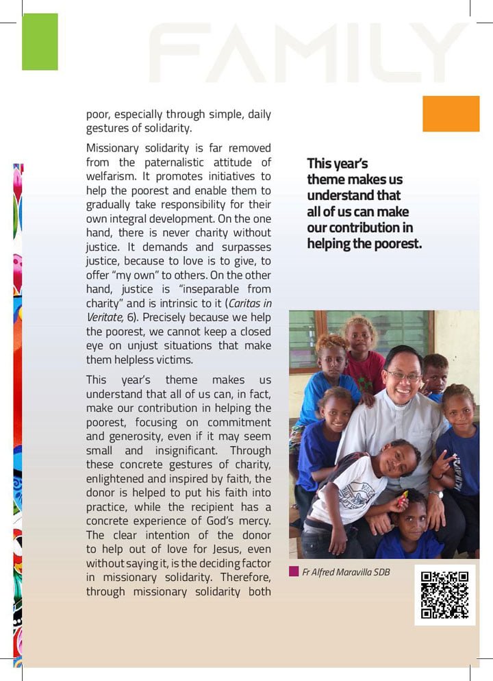 Theo truyền thống, vào ngày 11 mỗi tháng, chúng ta mời gọi các thành phần trong Gia đình Salêdiêng hợp lời cầu nguyện và cũng quảng đại đóng góp cho các công cuộc truyền giáo khắp nơi trên toàn thế giới. Chúng ta cũng cổ võ để ngày càng có thật nhiều ơn gọi truyền giáo, quảng đại đến làm việc cho vườn nho nước trời tại những nơi xa xôi, hẻo lánh và gian khổ nhất.