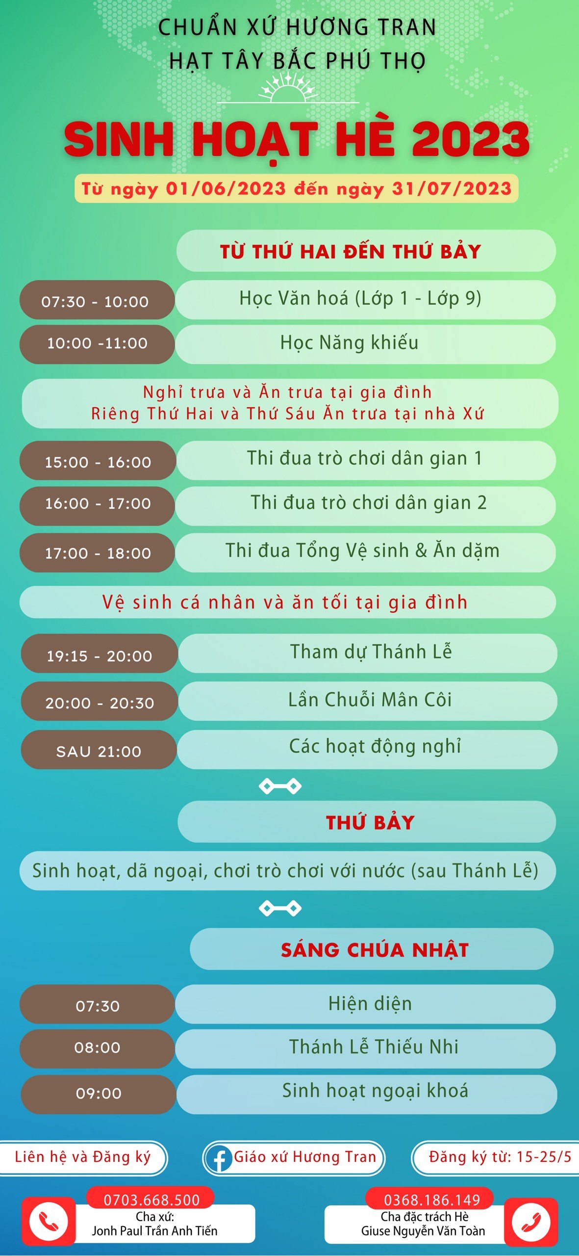 Theo chương trình dự kiến, vào ngày30-31/07/2023, tất cả các em tham gia sinh hoạt hè sẽ có 2 ngày trại THEO BƯỚC SAVIO tại Chuẩn xứ Hương Tran và sẽ có một ngày Hội Chợ + Văn Nghệ (phát thưởng thi đua trong suốt thời gian hè).