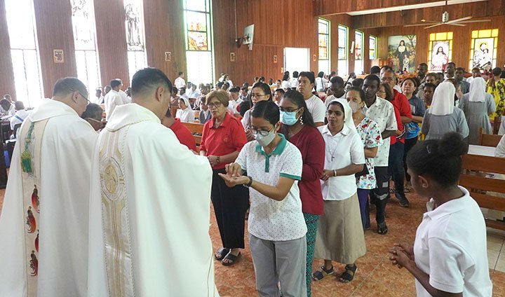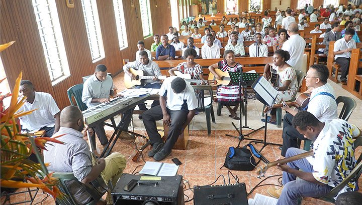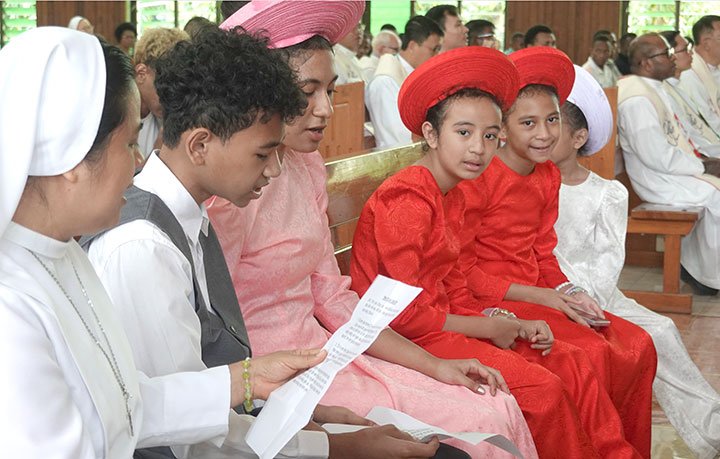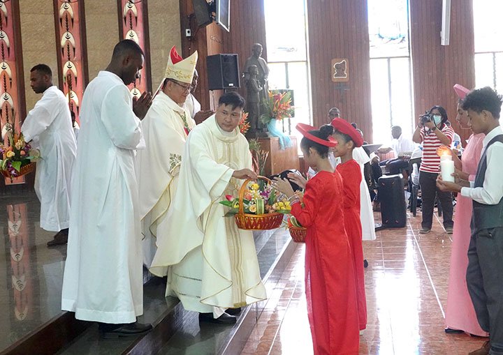 Trường kỹ thuật Don Bosco, Boroko, phụ trách phần hát lễ. Phần rước tại cổng vào và dâng lễ vật do cộng đoàn người Việt Nam dẫn đầu. Họ đại diện cho cha mẹ và gia đình của Tân linh mục, những người tham dự thánh lễ Online.