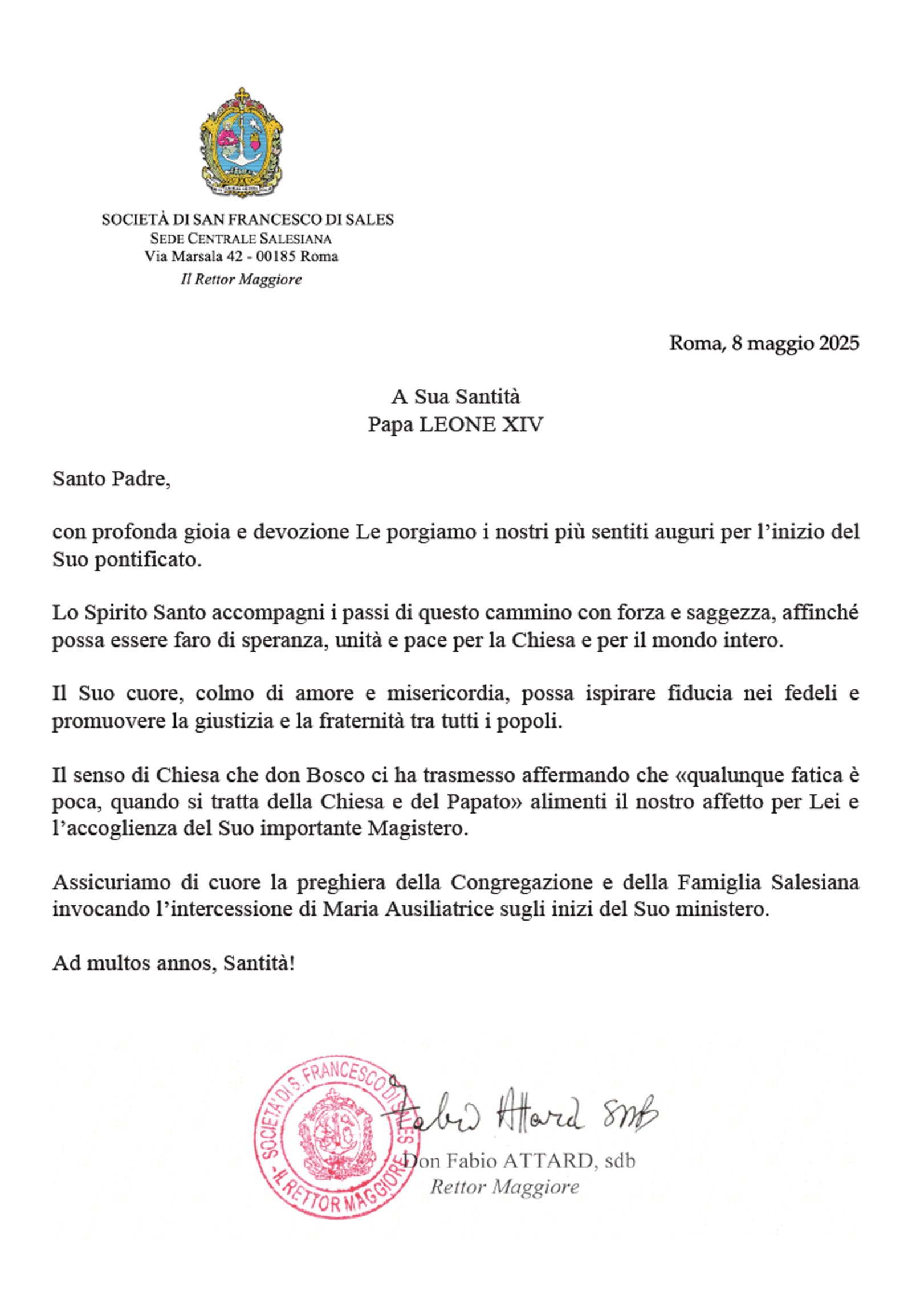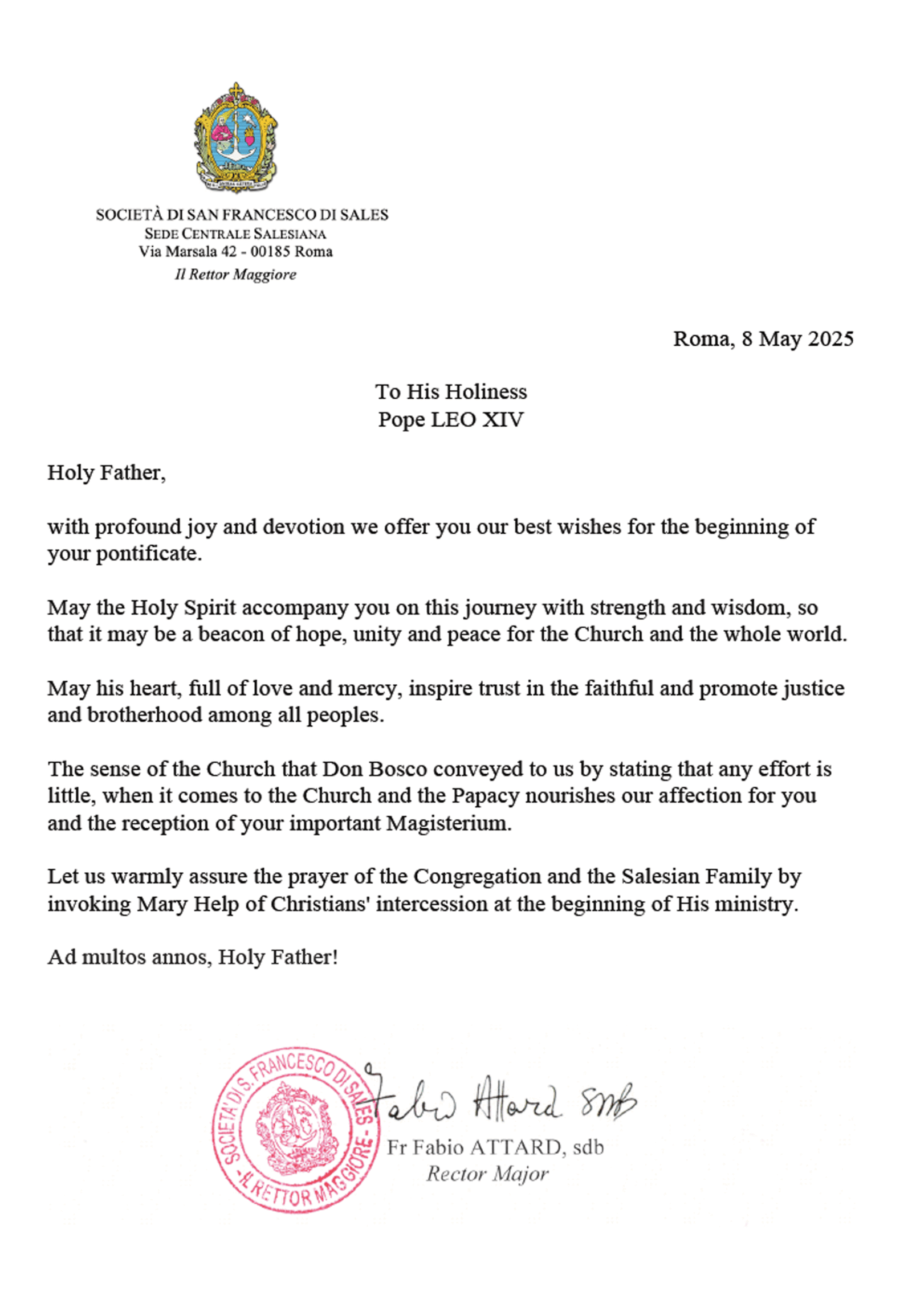 Chúng con rất chân thành trong lời cầu nguyện của Dòng và Gia Đình Salêdiêng, cùng khẩn cầu lời chuyển cầu của Đức Maria Phù Hộ các Giáo Hữu cho việc khởi đầu sứ vụ của Ngài.