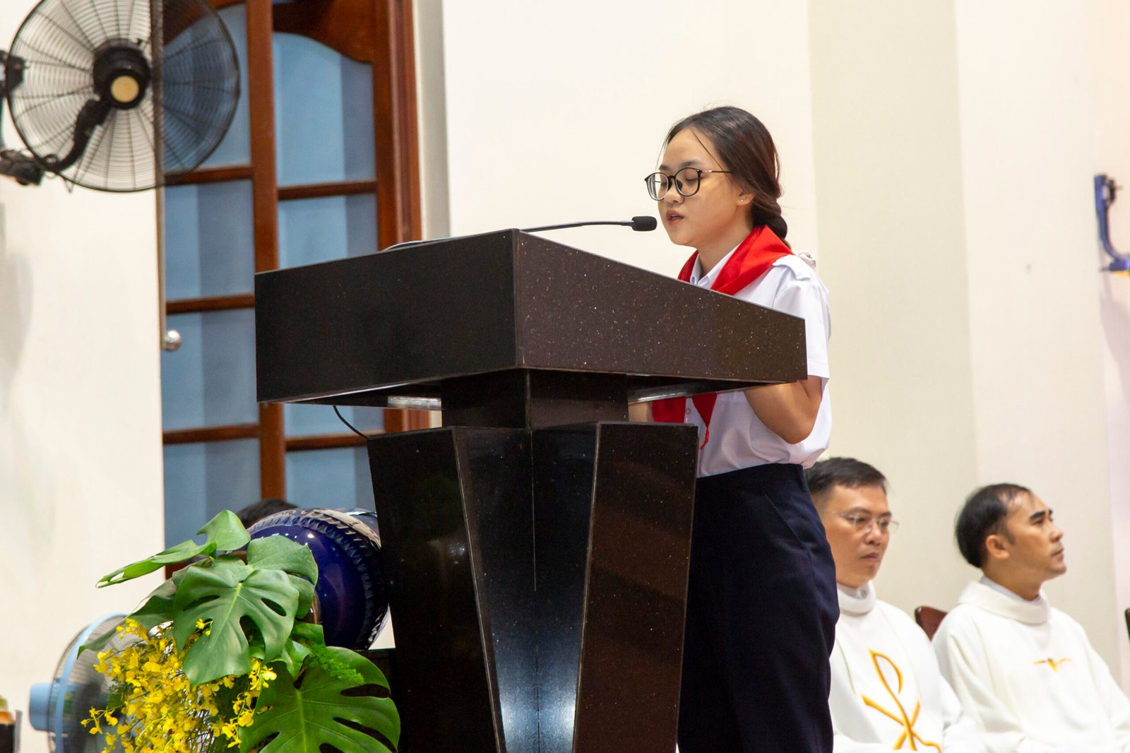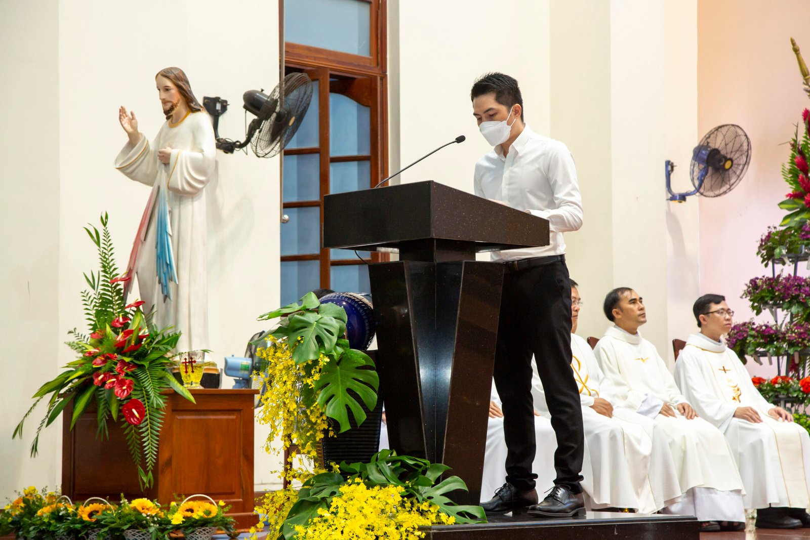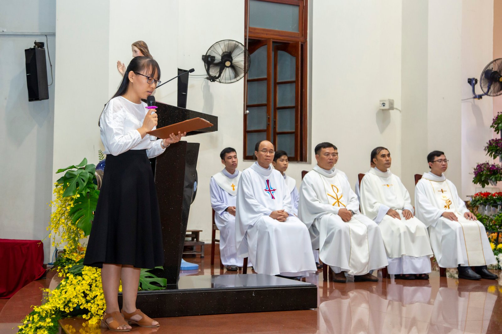 Thánh lễ tiếp tục với Lời nguyện tín hữu và hoàn tất với lời nguyện hiệp Lễ. Bạn Anna Lê Nguyễn Quỳnh Như – cựu học viên, đã đại diện cho tất cả các GLV cơ sở để gửi đến quý cha, quý sơ và quý giảng viên lời tri ân về những công lao vất vả của các ngài trong suốt 10 năm qua để góp phần dựng xây Cơ sở. Cha chủ tế đã có đôi lời đáp từ, trong đó, ngài không quên nhấn mạnh một ý chính mà tất cả các GLV rất tâm đắc: “Các con đừng chỉ làm Giáo lý viên mà hãy là Giáo lý viên, hãy để Giáo lý viên là căn tính của mình chứ không phải chỉ là công việc.”
