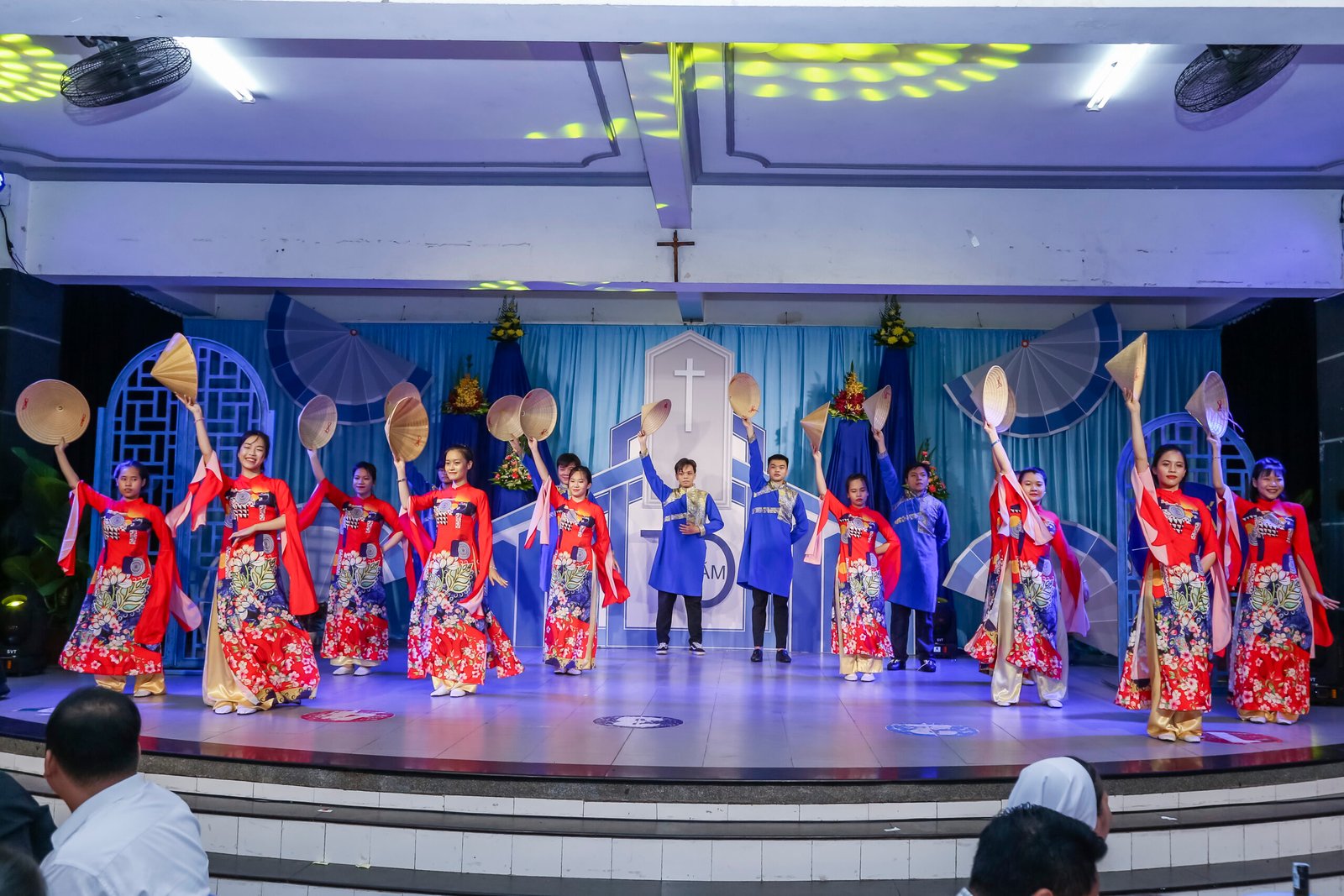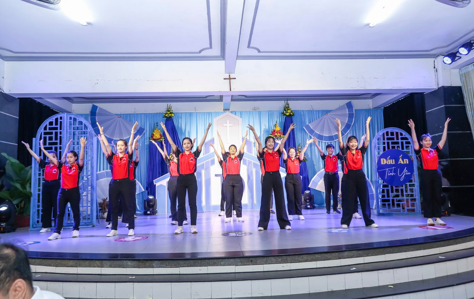 Chương trình tiệc mừng được diễn ra dưới hội trường giáo xứ. Với sự đầu tư công phu, kỹ lưỡng; các tiết mục do quý Sơ cùng các anh chị GLV chuẩn bị và trình bày đã thật sự khuấy động bầu không khí, tạo nên niềm vui lớn lao cho các thực khách trong khi dùng tiệc. Đặc biệt nhất phải kể đến 2 tiết mục đó là tiết mục nhảy dễ thương I will follow Him của tất cả quý cha, quý sơ và quý giảng viên và tiết mục Tình ca dâng hiến với giọng hát đầy tâm tình của cha Giuse Bùi Quang Minh, giám học Học viện triết học Dòng Tên, đã làm cho các anh chị GLV vô cùng thích thú.