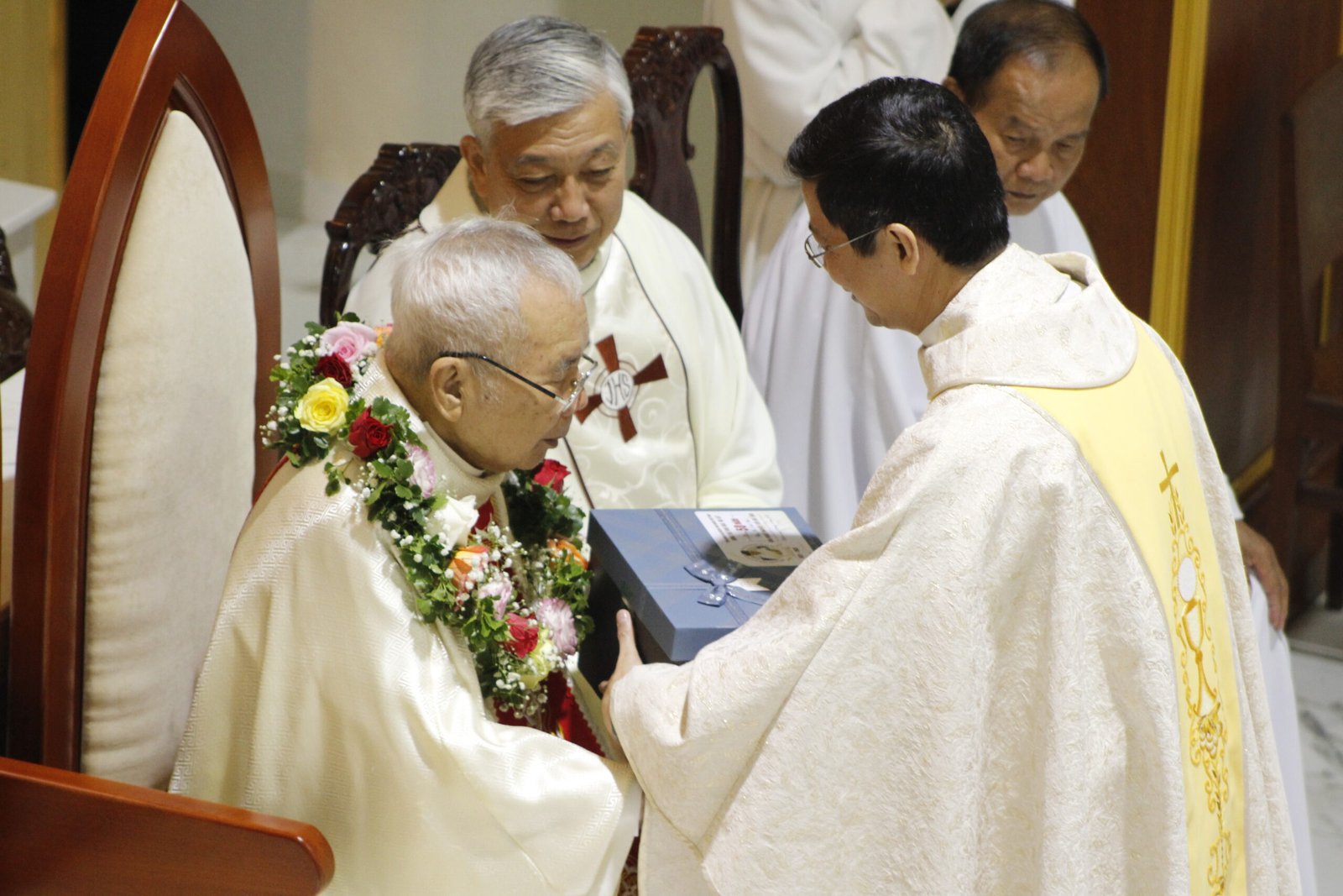 Trước khi kết thúc thánh lễ, cha Giám tỉnh đại diện tỉnh dòng và các anh em Salêdiêng có đôi lời chúc mừng đến cha cố. Để đáp từ, cha cố nói lên lời tri ân Chúa, Mẹ Maria về ơn lành mà cha cố đã nhận lãnh. Đồng thời ngài cũng có lời tri ân đến cha Giám tỉnh, anh em Salêdiêng và toàn thể thân nhân, ân nhân, những người đã yêu mến và thi ân đối với cha cố.
