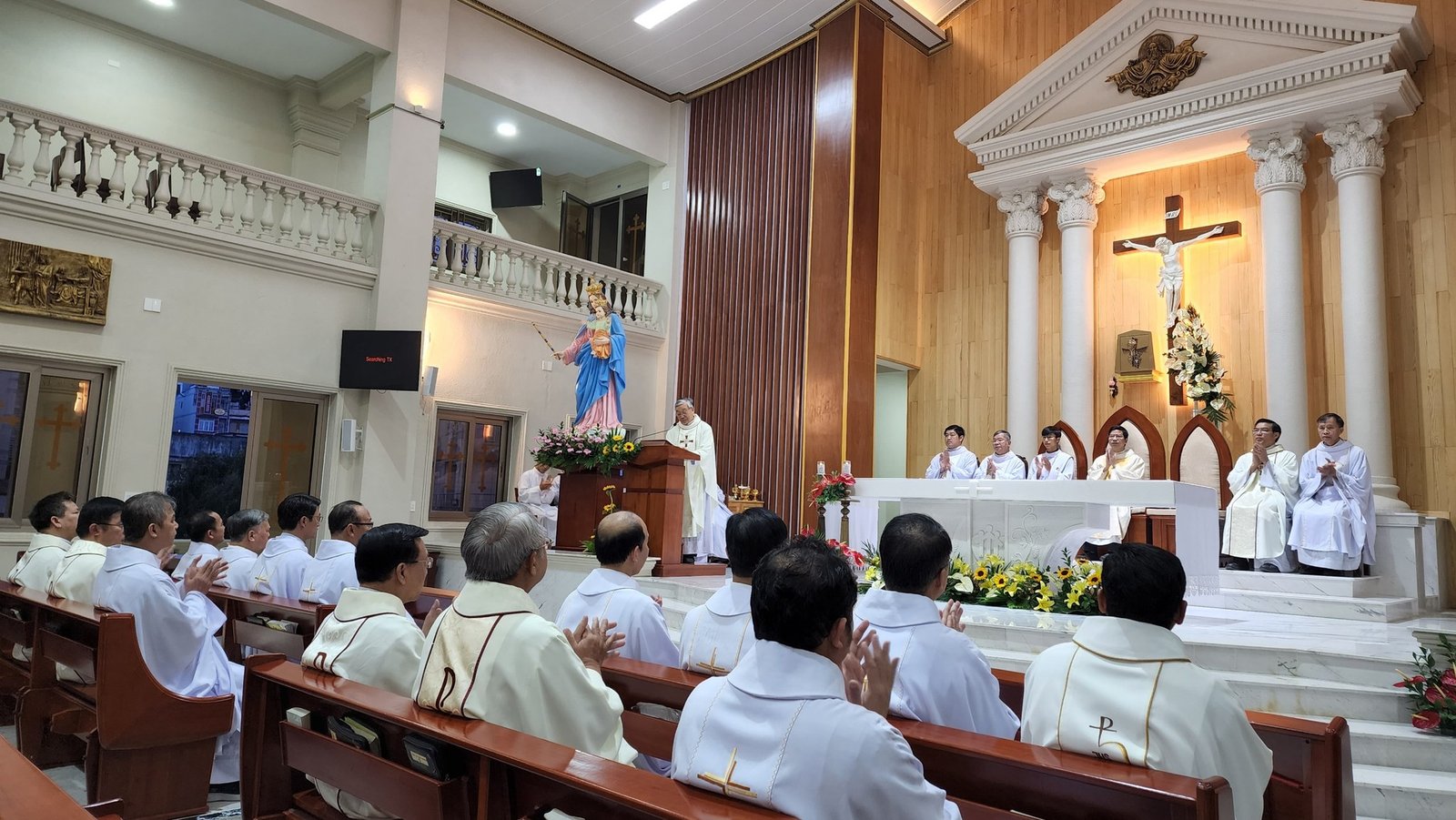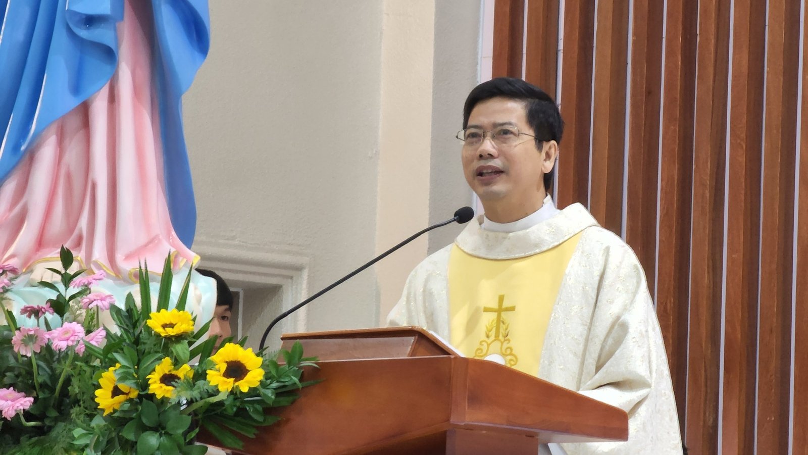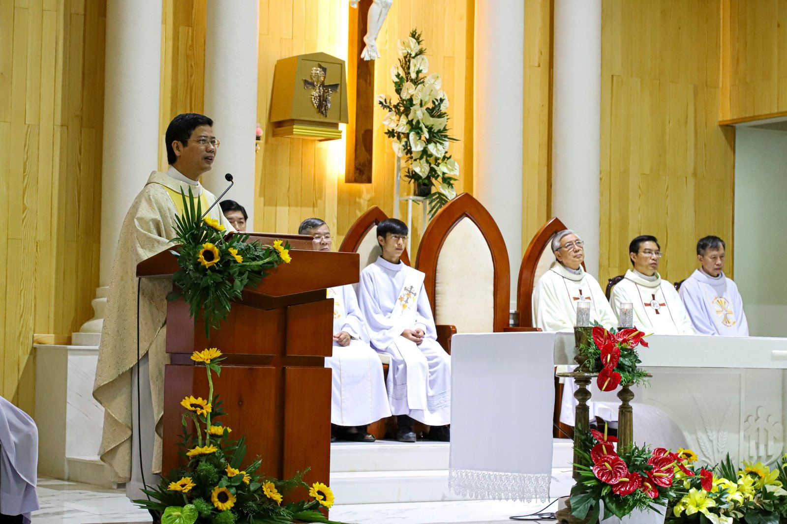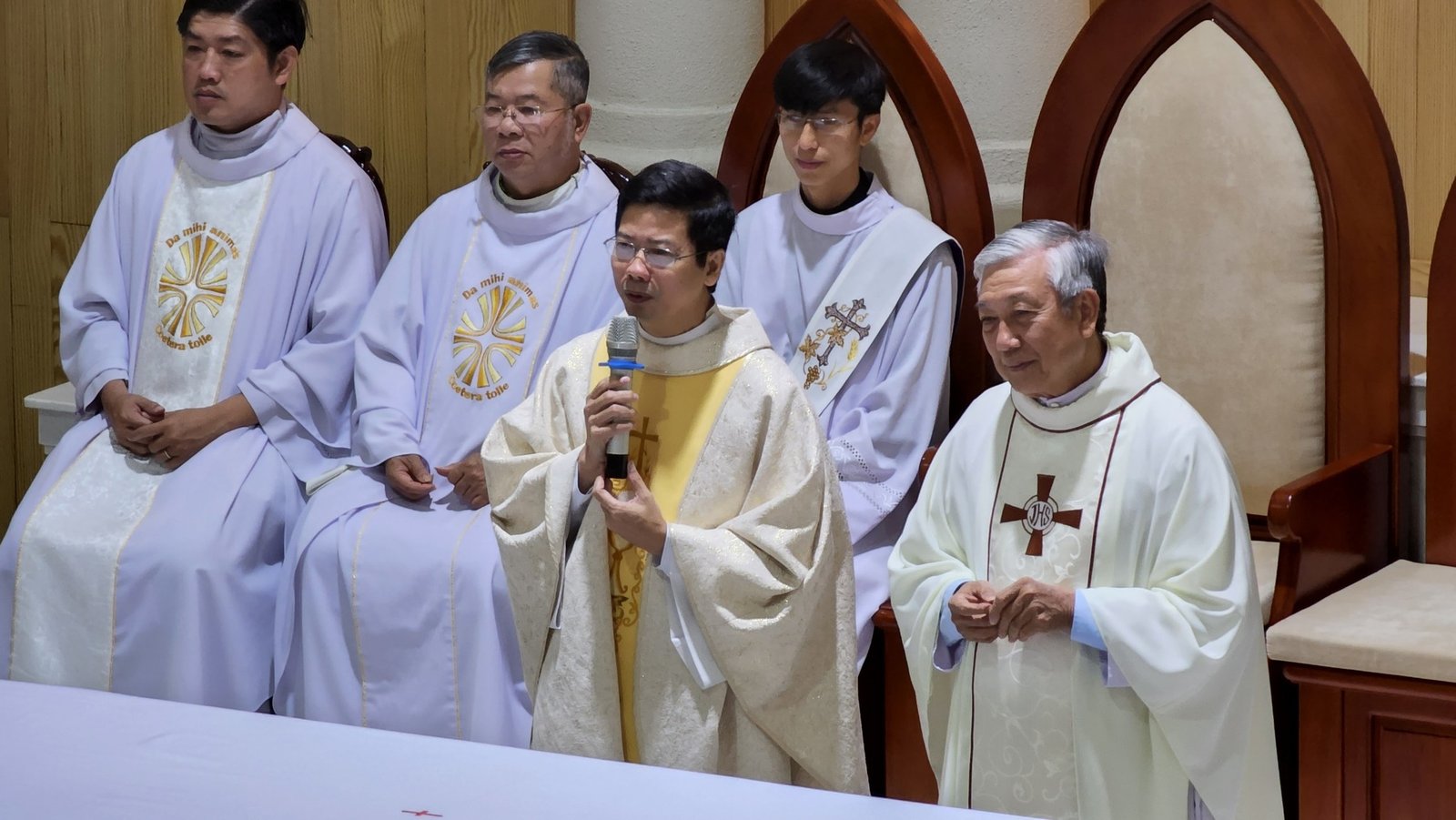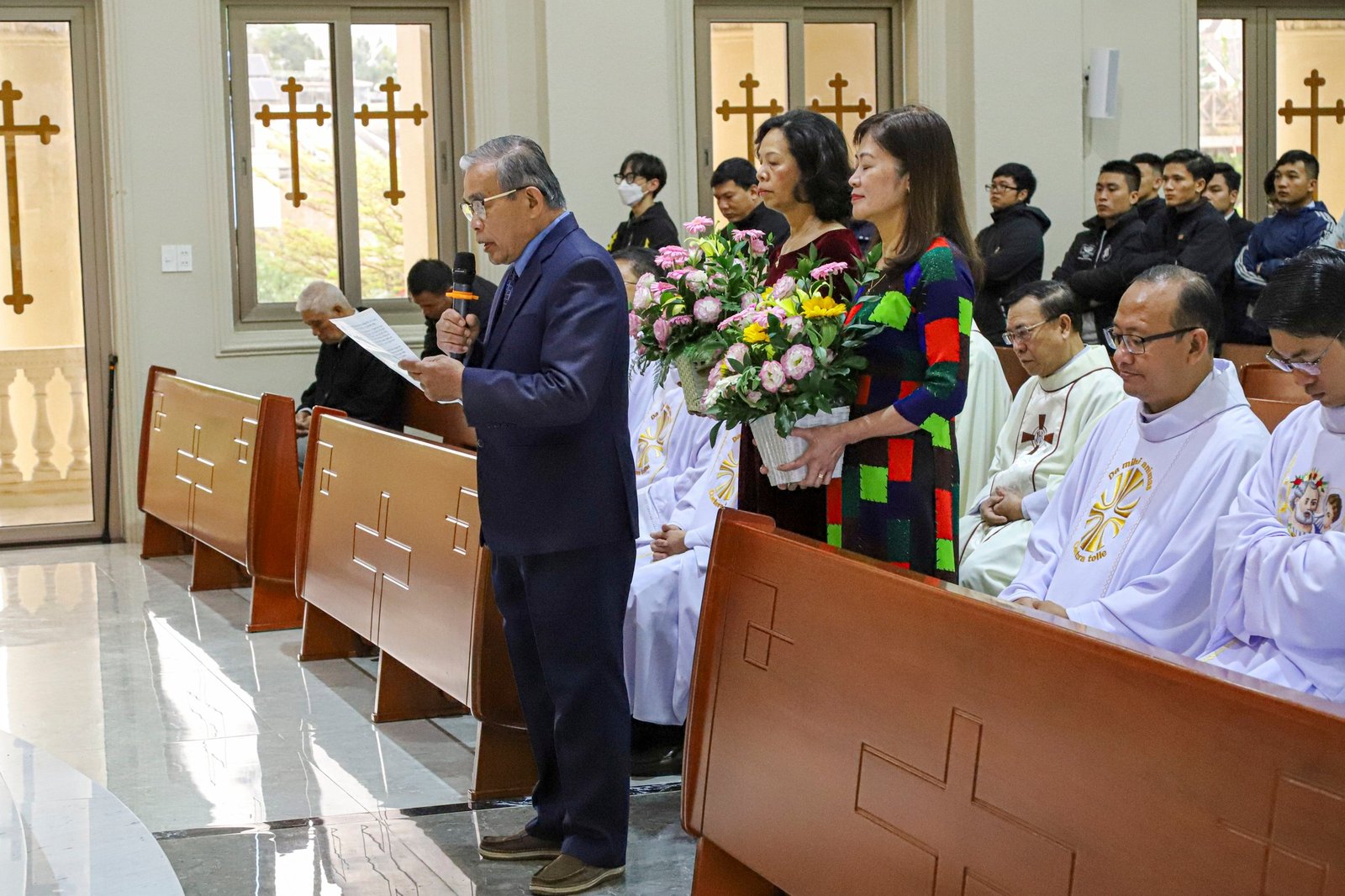 Trước khi kết thúc thánh lễ, ông Chủ tịch HĐMV Giáo sở đại diện cộng đoàn chúc mừng Cha Giám đốc và quý cha, quý thầy Học viện Don Rua Đà Lạt.