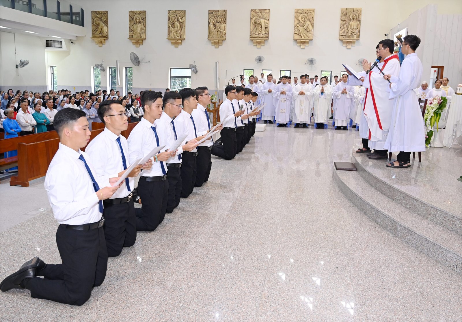 1. Xướng Danh và Thỉnh Nguyện: Cha Giám đốc Cộng thể long trọng gọi tên từng tập sinh, và các thầy sẽ đáp lại “Lạy Chúa, này con đây” để tiến lên cung thánh, công khai nói lên ước nguyện tận hiến.