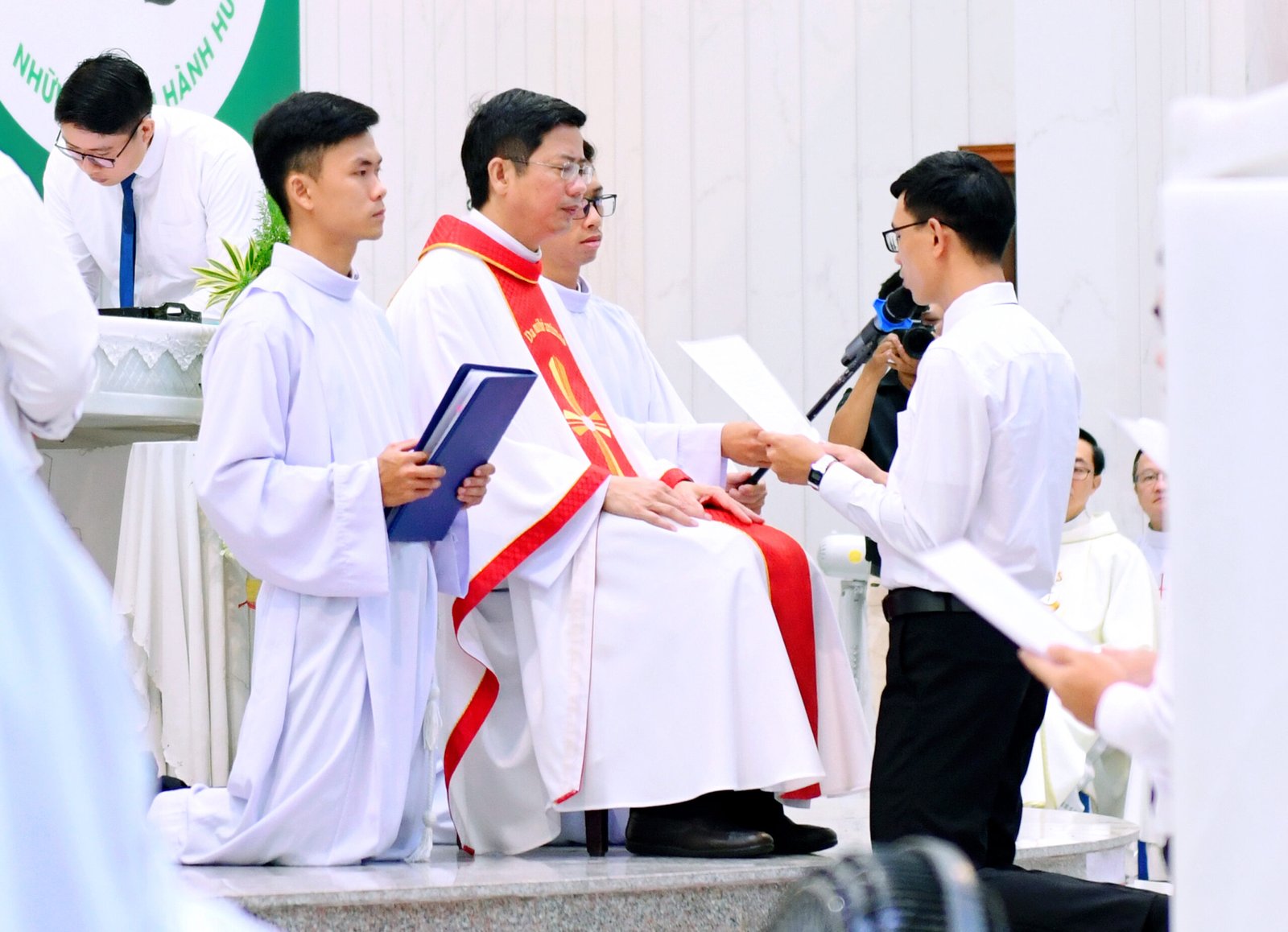 5. Lời Nguyện Thánh Hiến và Trao Hiến Luật: Cha Giám tỉnh đọc lời nguyện thánh hiến, xin Chúa thánh hóa các tân khấn sinh và trao cho mỗi thầy cuốn Hiến Luật Salêdiêng như kim chỉ nam cho đời sống tu trì.