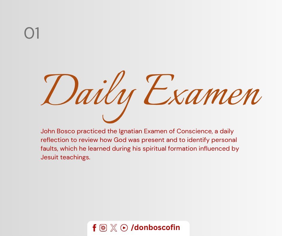 Don Bosco đã thực hành việc xét mình lương tâm theo linh đạo I-nhã, một phương pháp suy ngẫm hằng ngày để nhận ra sự hiện diện của Thiên Chúa và những thiếu sót của bản thân. Ngài đã học được phương pháp này trong giai đoạn đào luyện thiêng liêng, vốn chịu ảnh hưởng từ giáo huấn của Dòng Tên. - LINH HƯỚNG