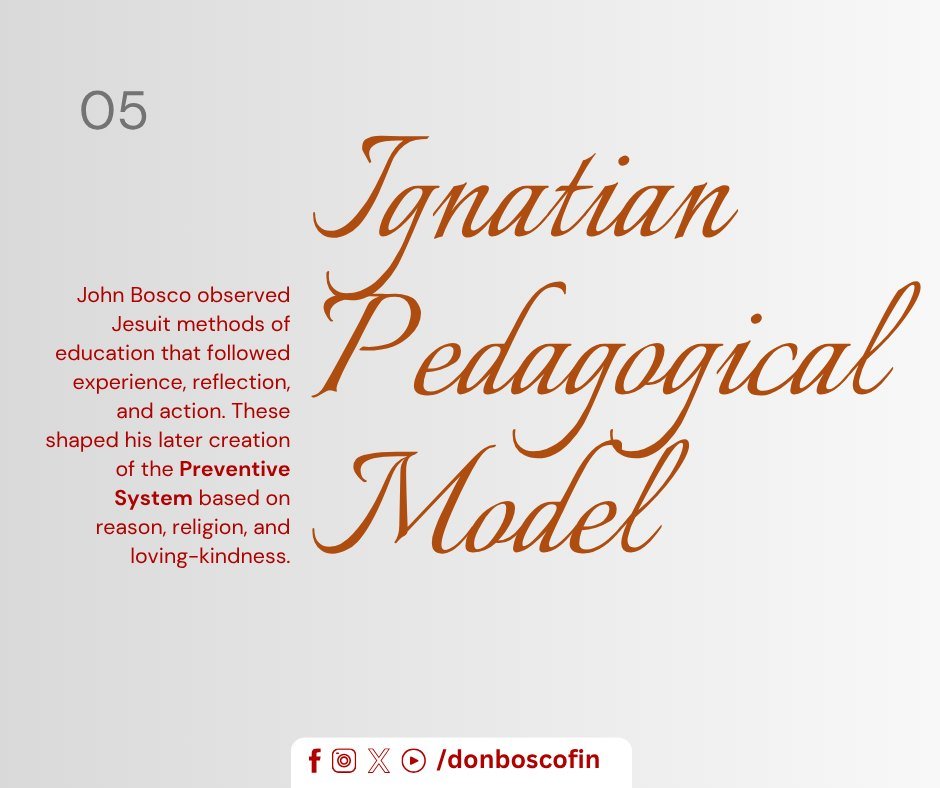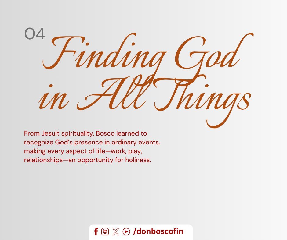 Từ linh đạo Dòng Tên, Don Bosco đã học cách nhận ra sự hiện diện của Thiên Chúa trong những biến cố đời thường, biến mọi khía cạnh của cuộc sống—việc làm, vui chơi, các mối tương quan—trở thành cơ hội để nên thánh. - MÔ HÌNH SƯ PHẠM I-NHÃ