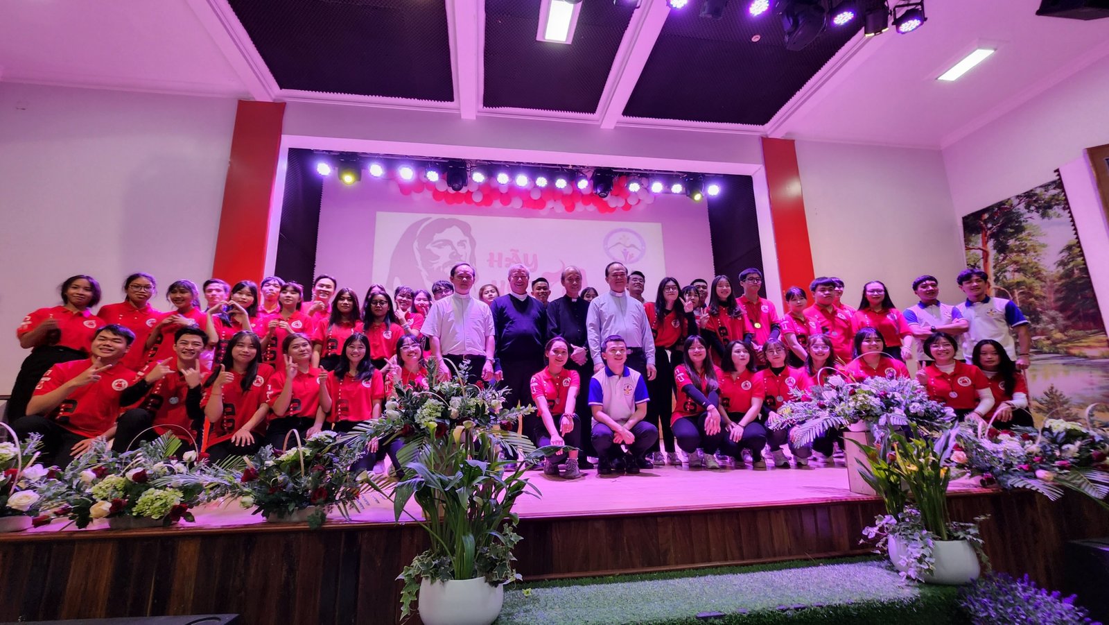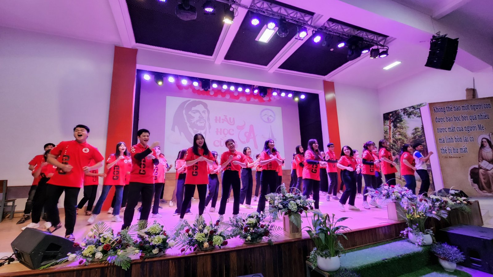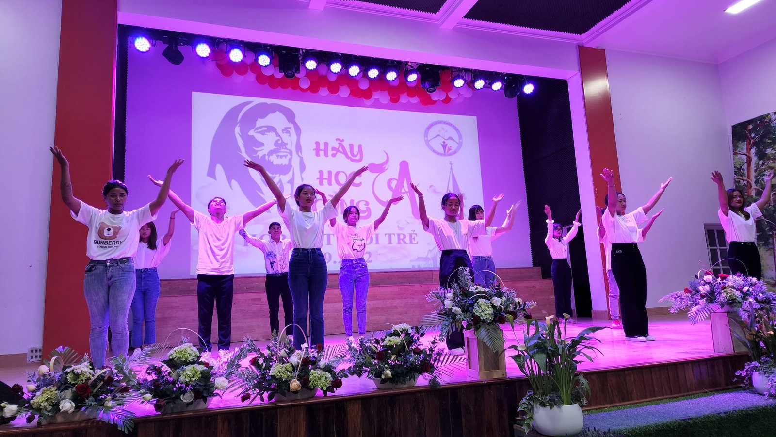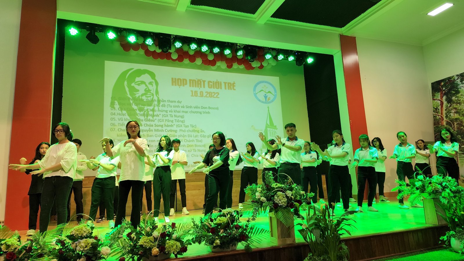 Sau thánh lễ, các bạn trẻ háo hức vào hội trường để được thưởng thức các tiết mục và được sống bầu không khí vui tươi, sôi động của tuổi trẻ. Sau phần khởi động của giáo xứ Thánh Mẫu, Du Sinh và Lang Biang, các bạn trẻ cùng hòa vào vũ điệu “Học Với Giêsu” do Nhóm Sinh viên và Tu sinh Don Bosco thể hiện.