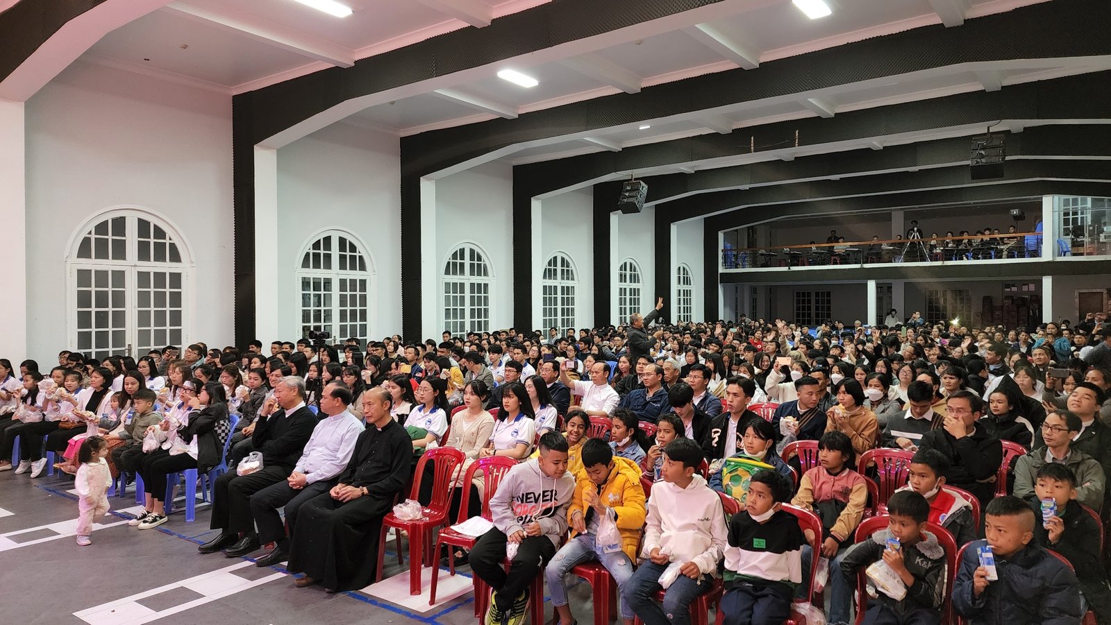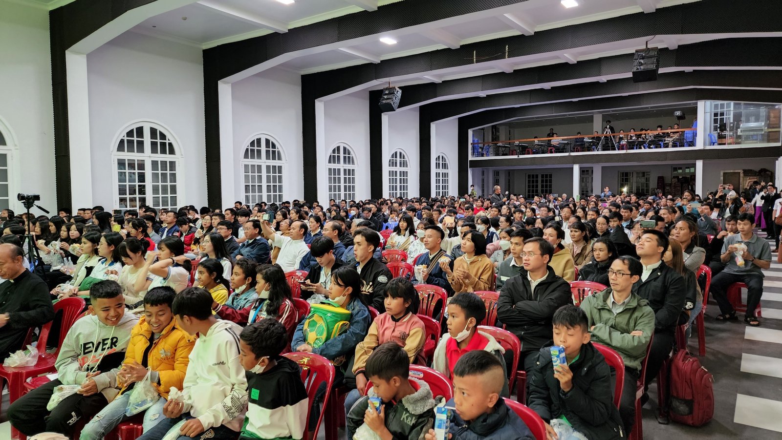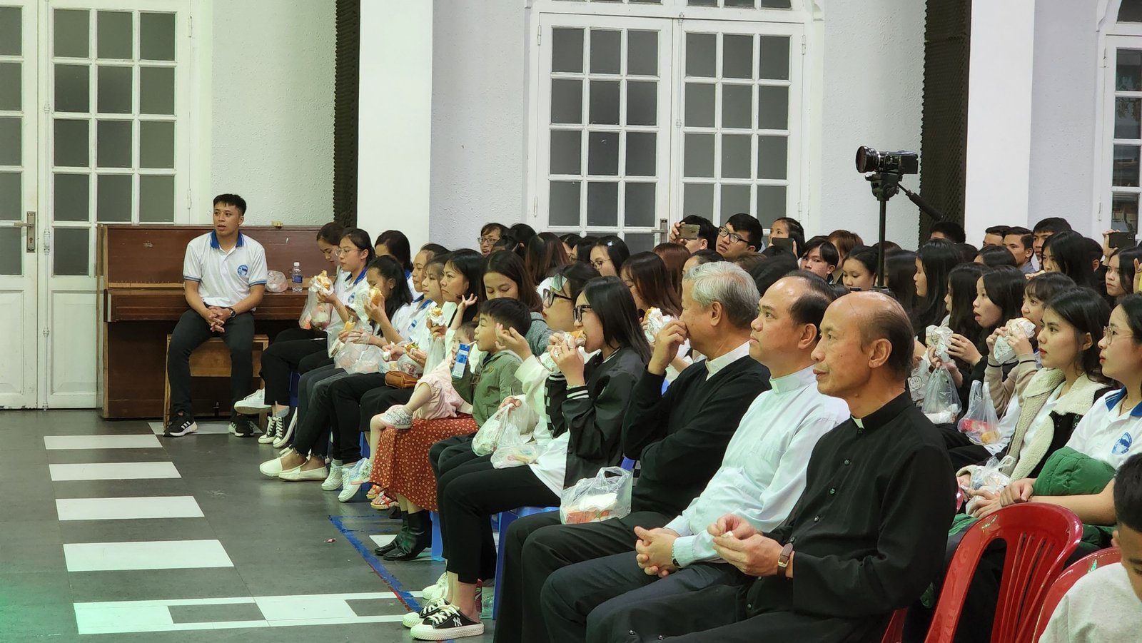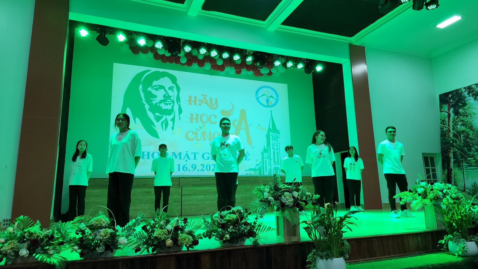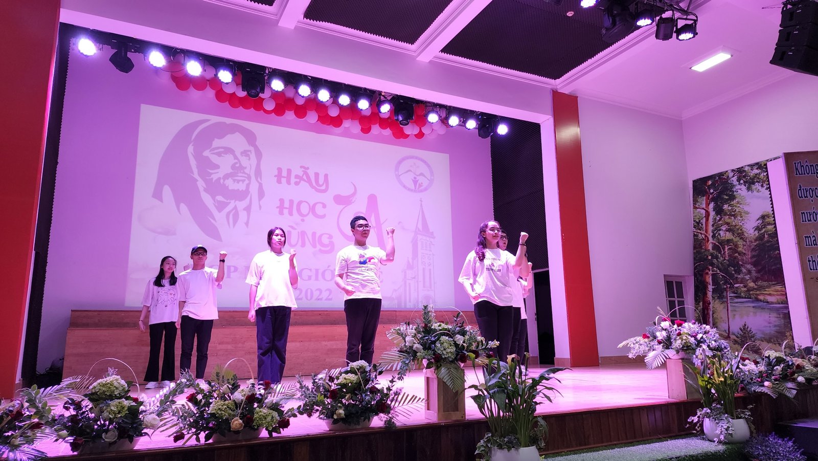 Sau thánh lễ, các bạn trẻ háo hức vào hội trường để được thưởng thức các tiết mục và được sống bầu không khí vui tươi, sôi động của tuổi trẻ. Sau phần khởi động của giáo xứ Thánh Mẫu, Du Sinh và Lang Biang, các bạn trẻ cùng hòa vào vũ điệu “Học Với Giêsu” do Nhóm Sinh viên và Tu sinh Don Bosco thể hiện.