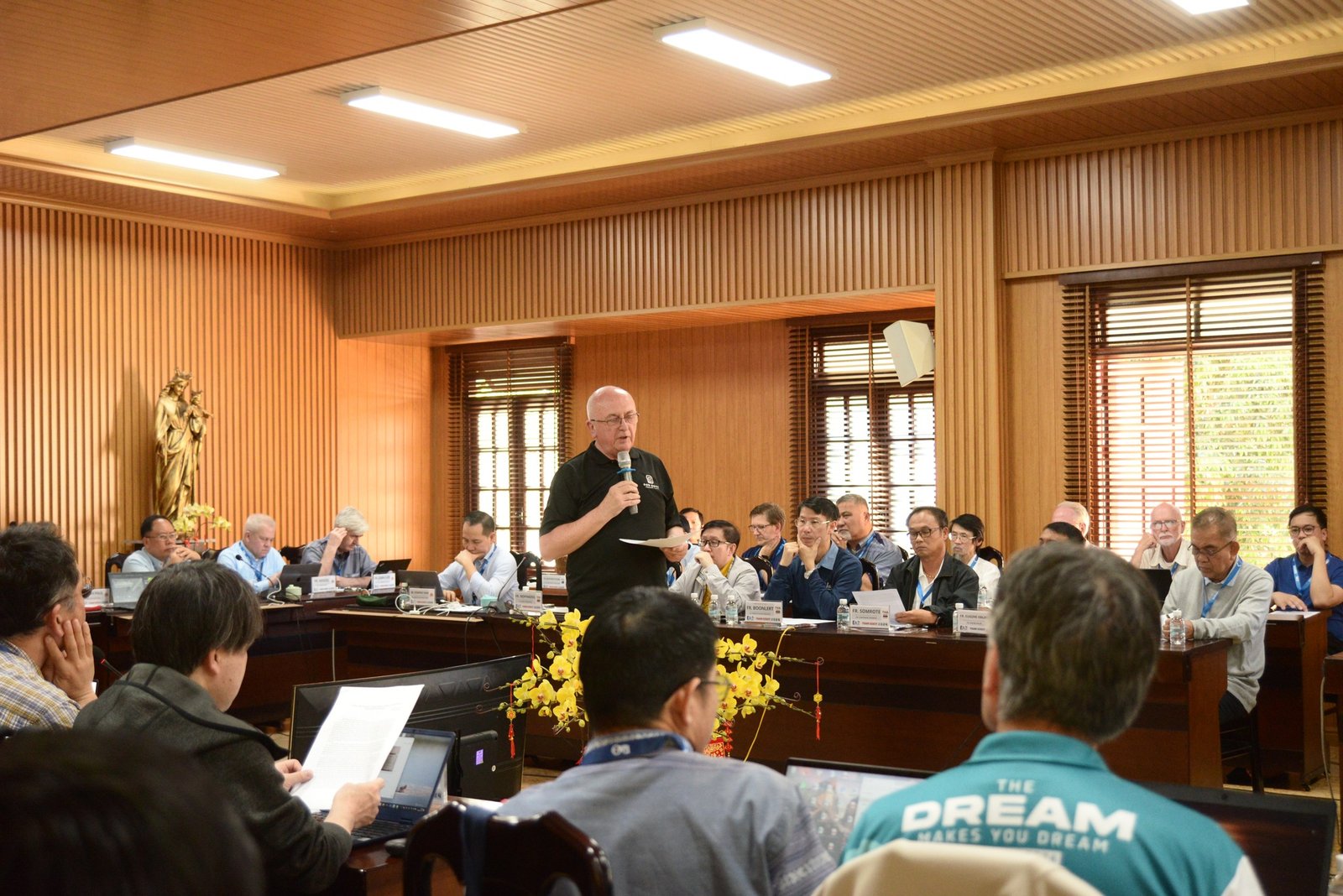 Cha Coelho Ivo (Tổng Cố vấn Đào luyện) đã chia sẻ đề tài “Đào luyện Salêdiêng trong một thế giới năng động ngày nay”. Cha chia sẻ ba điểm căn bản: