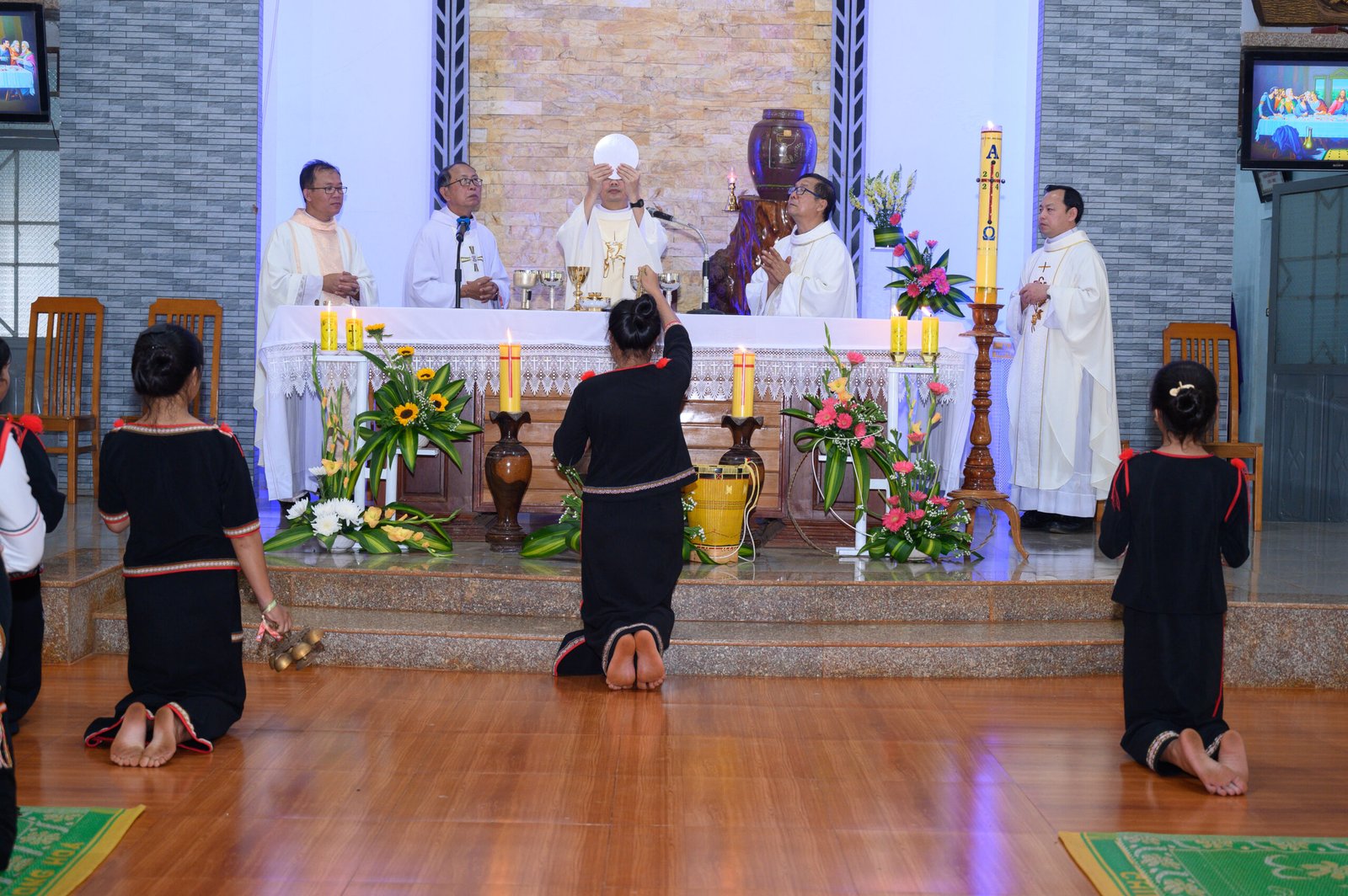 Đỉnh cao của ngày sinh động truyền giáo đó là Thánh lễ tạ ơn 25 năm chuyến xuất phát truyền giáo ad gentes đầu tiên của Tỉnh Dòng, do Cha Giám Tỉnh Barnaba Lê An Phong chủ tế, cùng đồng tế với ngài có Cha Cố vấn truyền giáo, Cha Quản hạt, quý Cha, Thầy, quý Sr và các anh chị em, bạn trẻ tham dự ngày gặp gỡ hôm nay. Thánh lễ mang đậm nét tinh thần truyền giáo và đối thoại văn hoá thật sự, với Thánh lễ tiếng việt nhưng bộ lễ và các bài hát được hát song ngữ tiếng việt và tiếng giarai rất sốt sắng và thánh thiện. Trong bài giảng, dựa vào Bài Tin mừng của Thánh Matthêu 28, 16-20 về lệnh truyền truyền giáo của Chúa Giêsu dành cho các môn đệ, Cha Giám Tỉnh đã mời gọi cộng đoàn hãy lên đường mang Đức Giêsu đến với những người chúng ta gặp gỡ, làm việc, phục vụ trong ơn gọi, môi trường đặc thù của mình với tình yêu, sự dấn thân. Nhưng trước hết, mỗi người hãy có Chúa trong đời mình, hãy cảm nghiệm tình yêu Chúa trước, đón nhận Chúa như món quà quý giá, để từ đó trao ban món quà Giêsu cho người bên cạnh. Thánh lễ kết thúc với nghi thức sai đi, Cha Cố vấn truyền giáo cùng với nhóm bạn trẻ đại diện cộng đoàn cầm nến sáng trong tay can đảm lên đường với lời mời gọi và sai đi của Chúa, Giáo Hội, Tu Hội, Tỉnh Dòng ngang qua Cha Giám Tỉnh.
