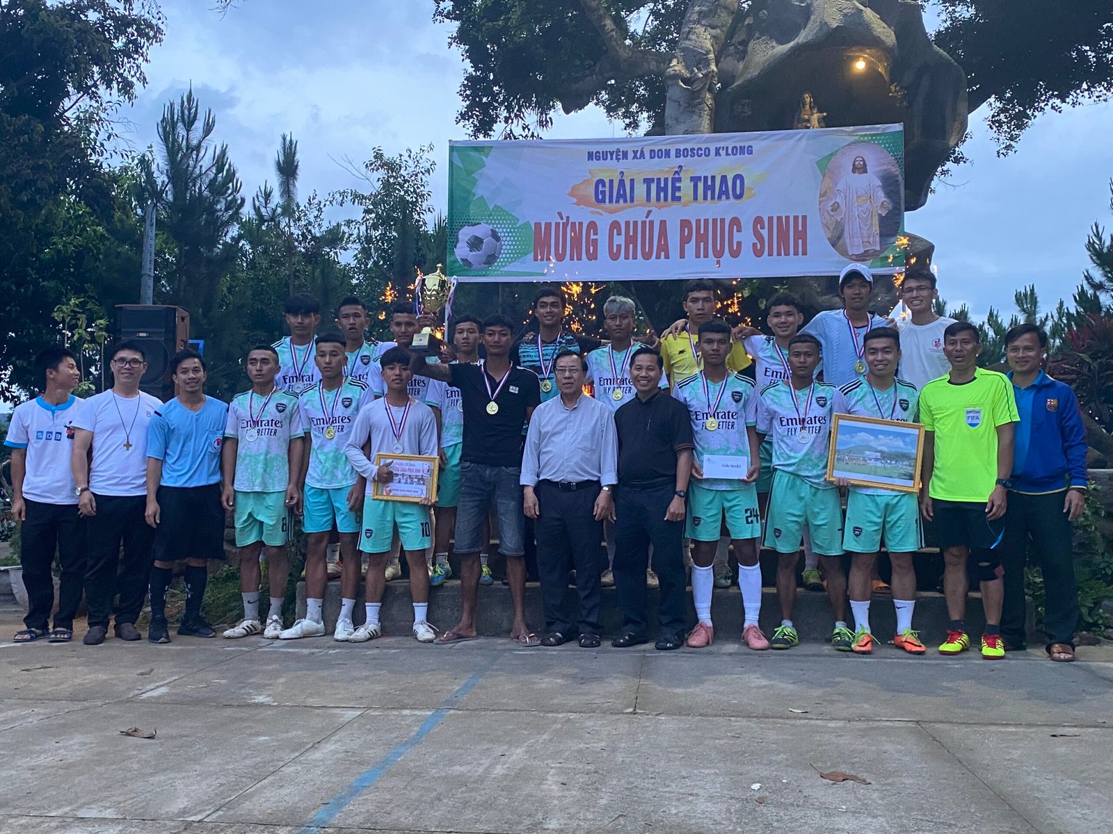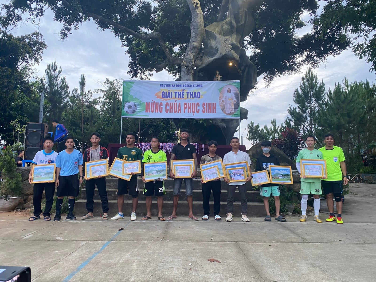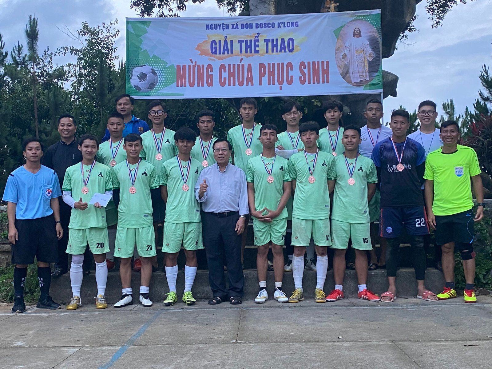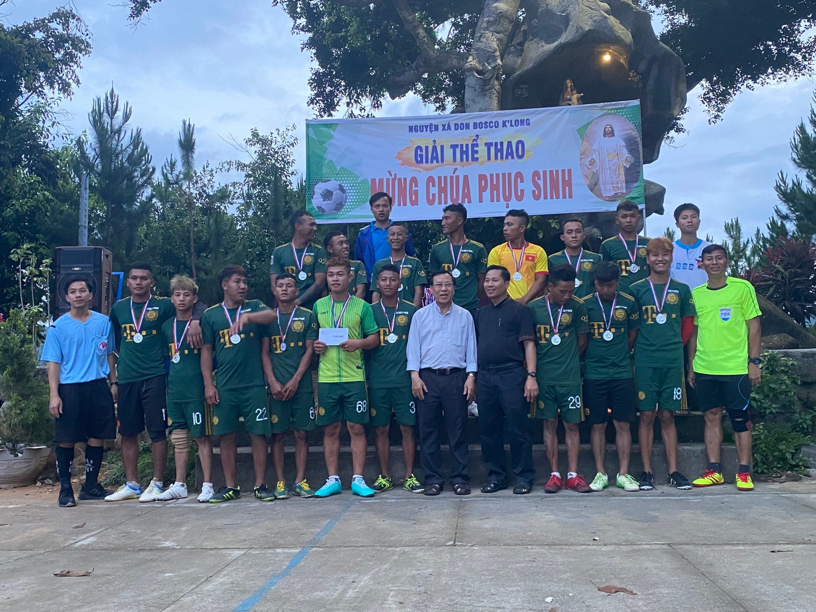 Kết thúc giải đấu, các đội bóng và người hâm mộ hân hoan chào đón cha Giám Đốc Giuse Trần Văn Hiển, quý cha-thầy thuộc cộng thể Don Bosco K’Long, quý thầy học viện triết học đang giúp tông đồ tại các giáo xứ cùng hiện diện và tham dự lễ Bế Mạc Giải truyền thống Mừng Chúa Phục Sinh.